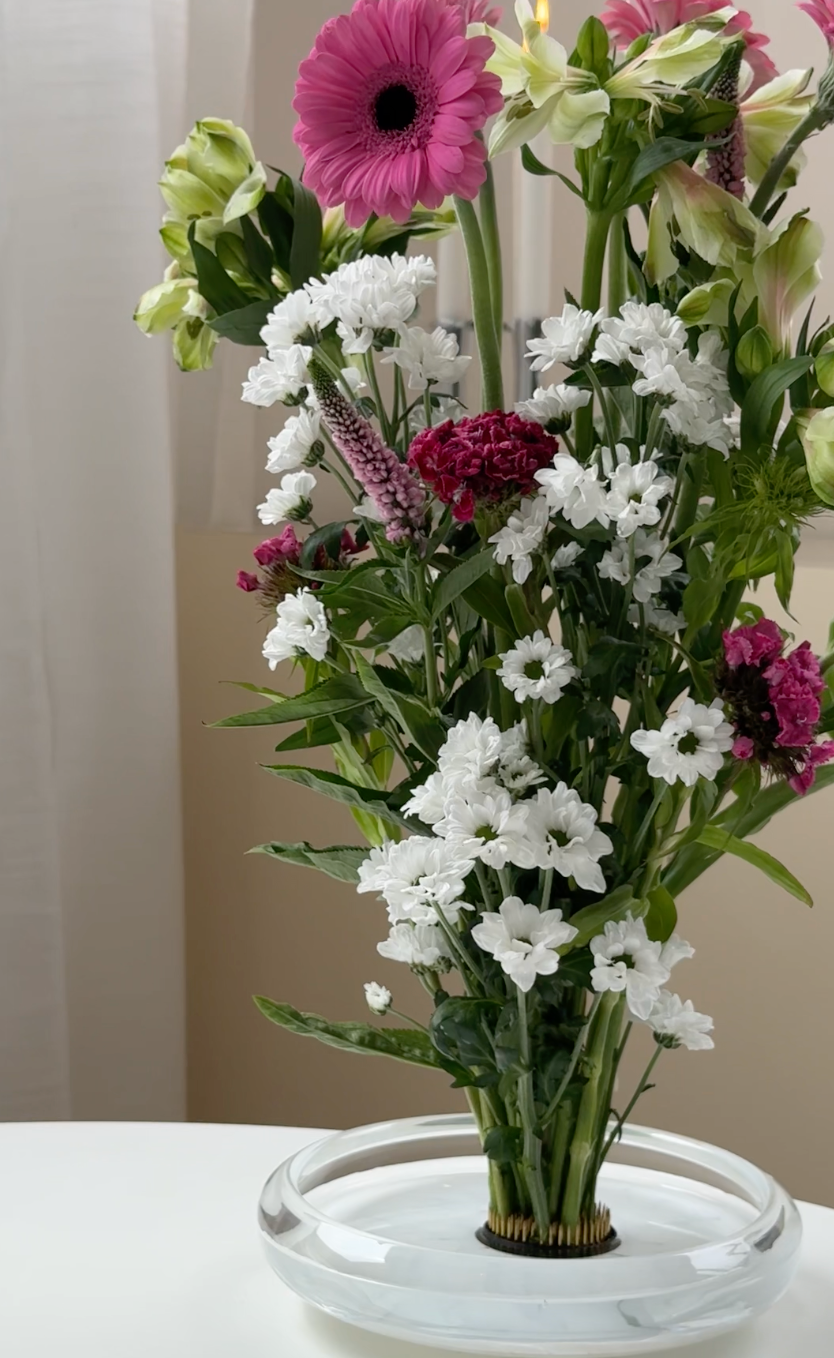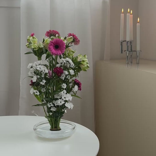 Smuk lav glasskål i klart glas med hvidt confetti-mønster indfældet i bunden. Den er ideel som centerpiece, til smykker, stearinlys, snacks – eller blot som et dekorativt objekt i sig selv. Den kan også bruges til blomsterdekorationer med en kenzan, som vist på billedet.