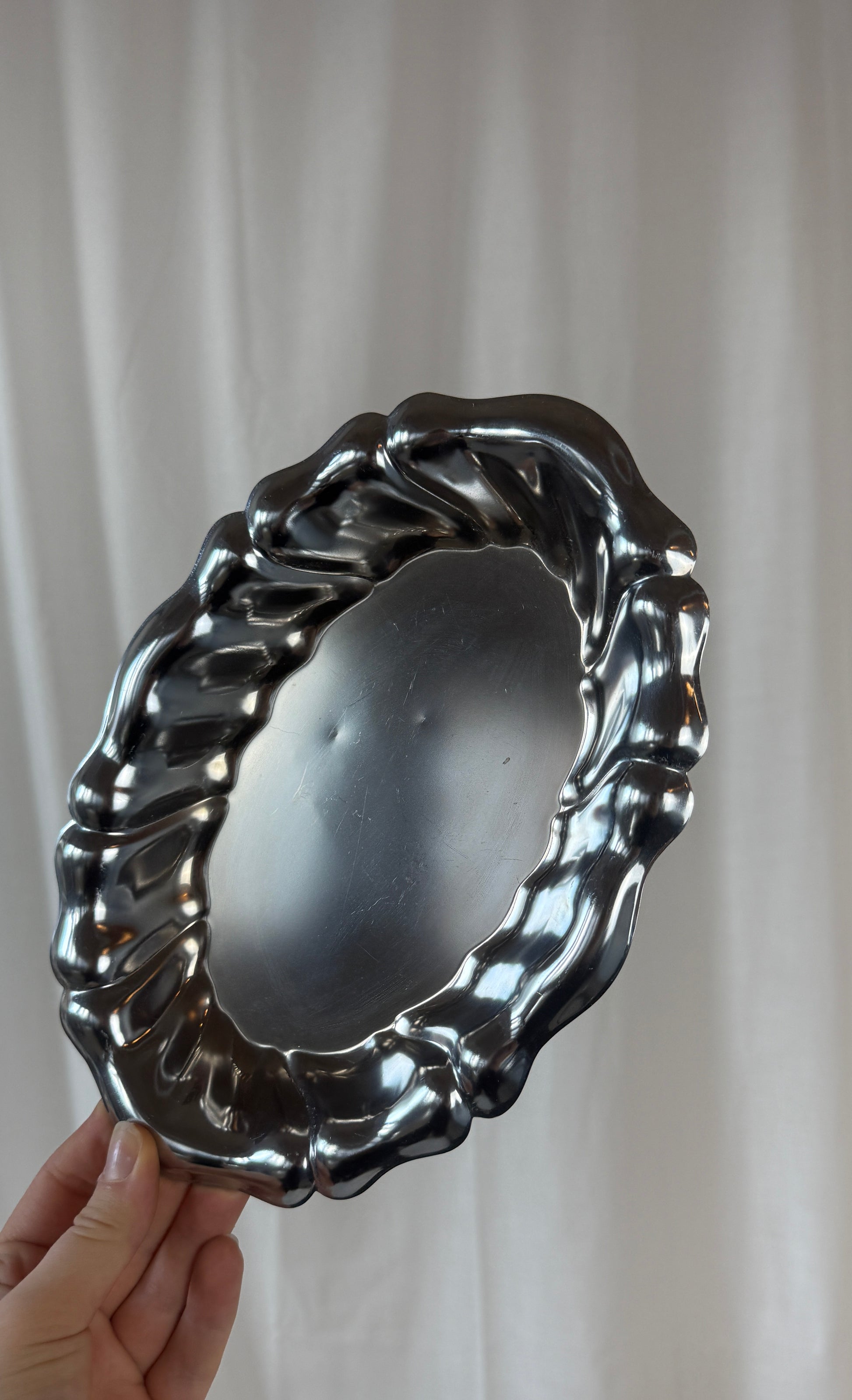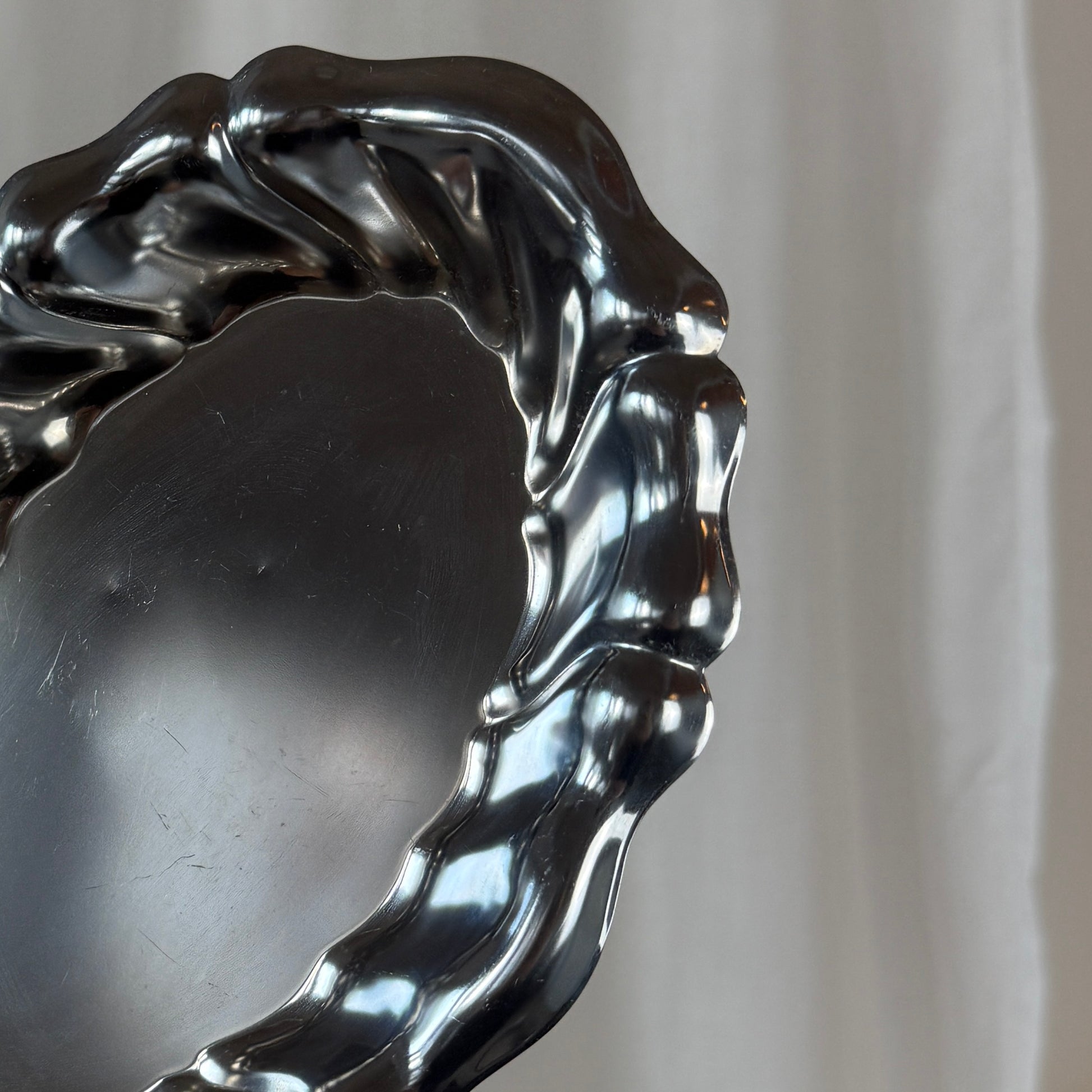 Fint ovalt fad i krom med dekorativ bølgekant, der giver et elegant og levende udtryk. Det blanke metal reflekterer lyset smukt og gør fadet velegnet både til servering og som dekorativt element i indretningen – perfekt til smykker, stearinlys eller små serveringer.