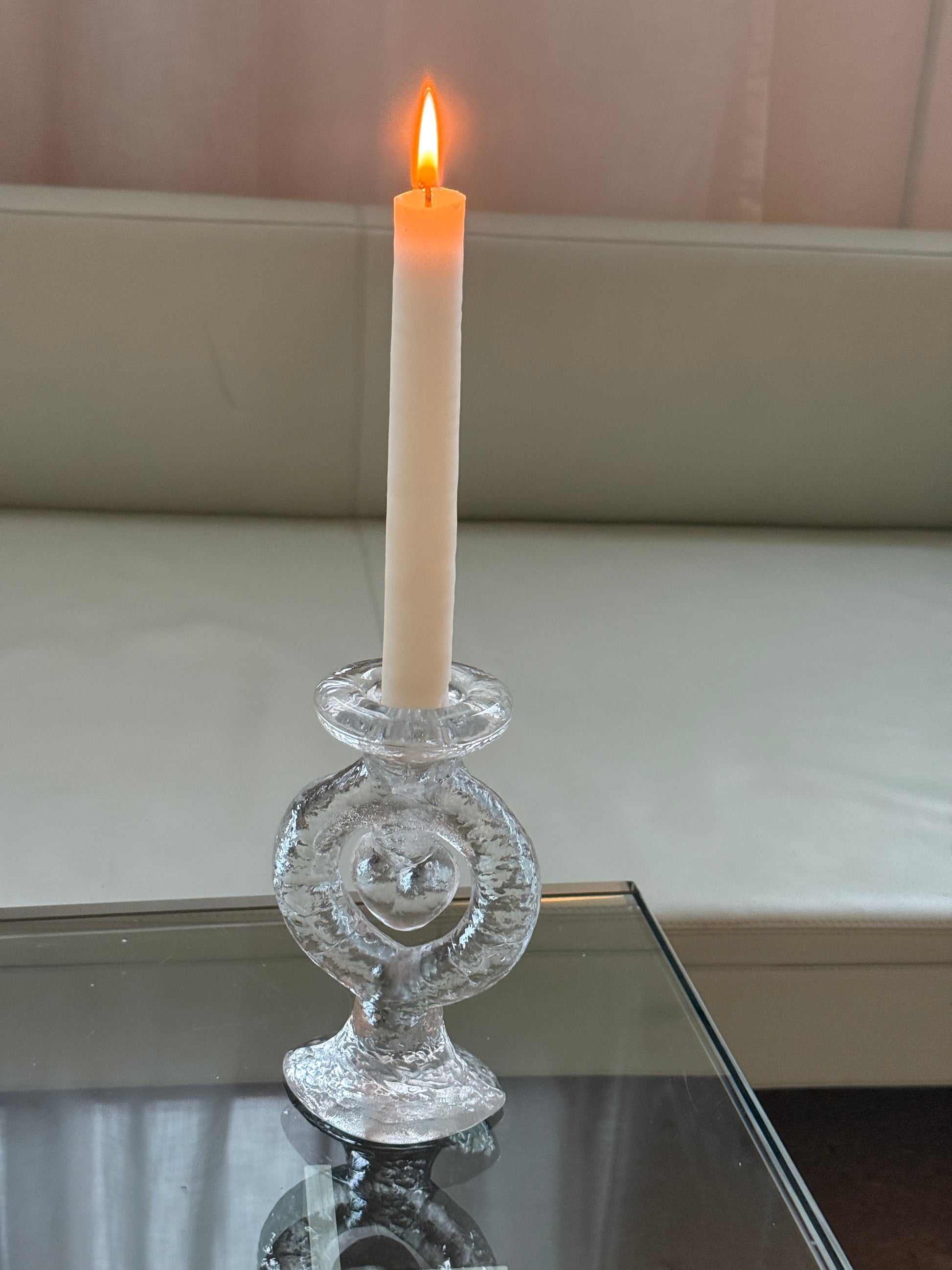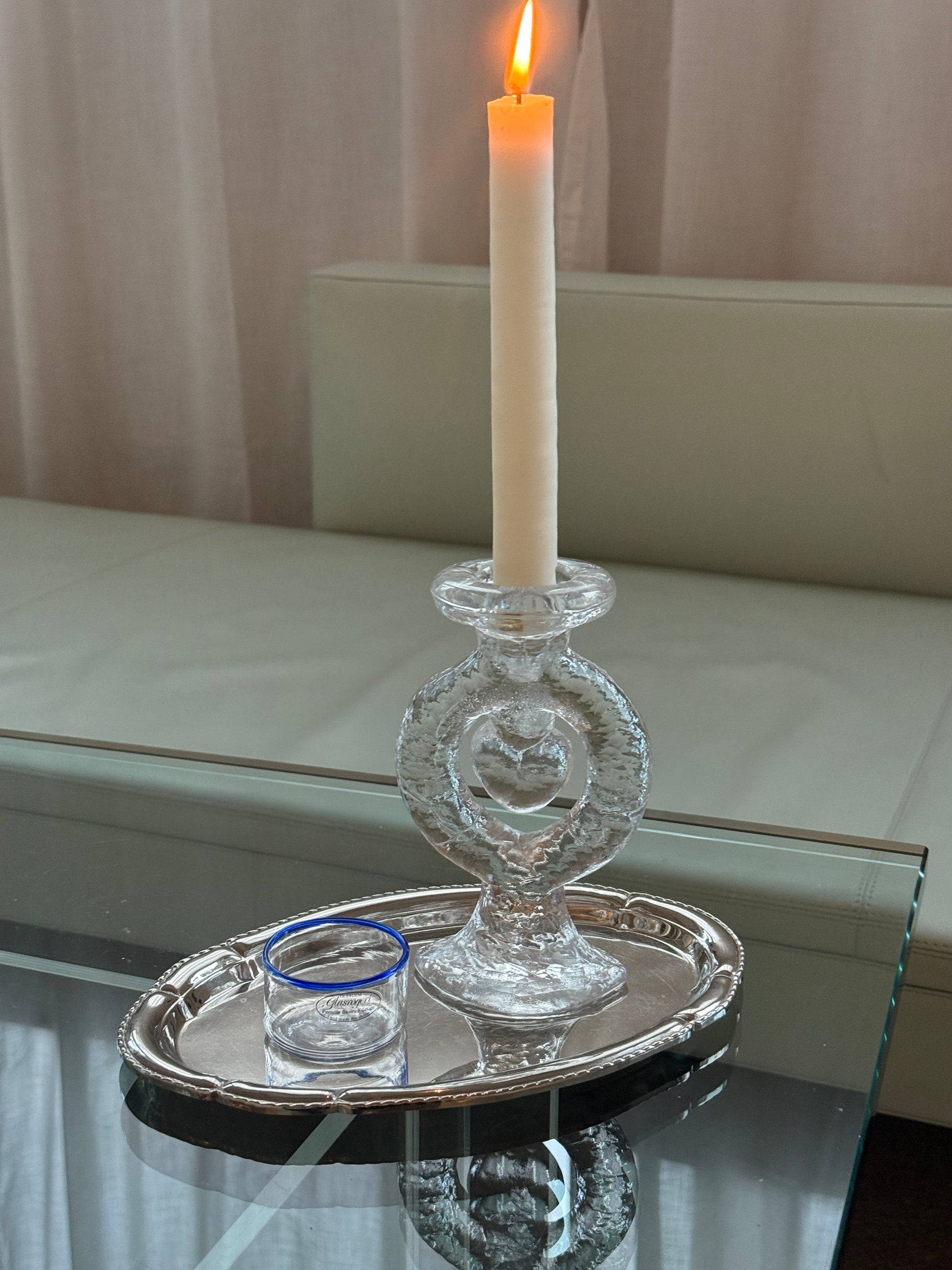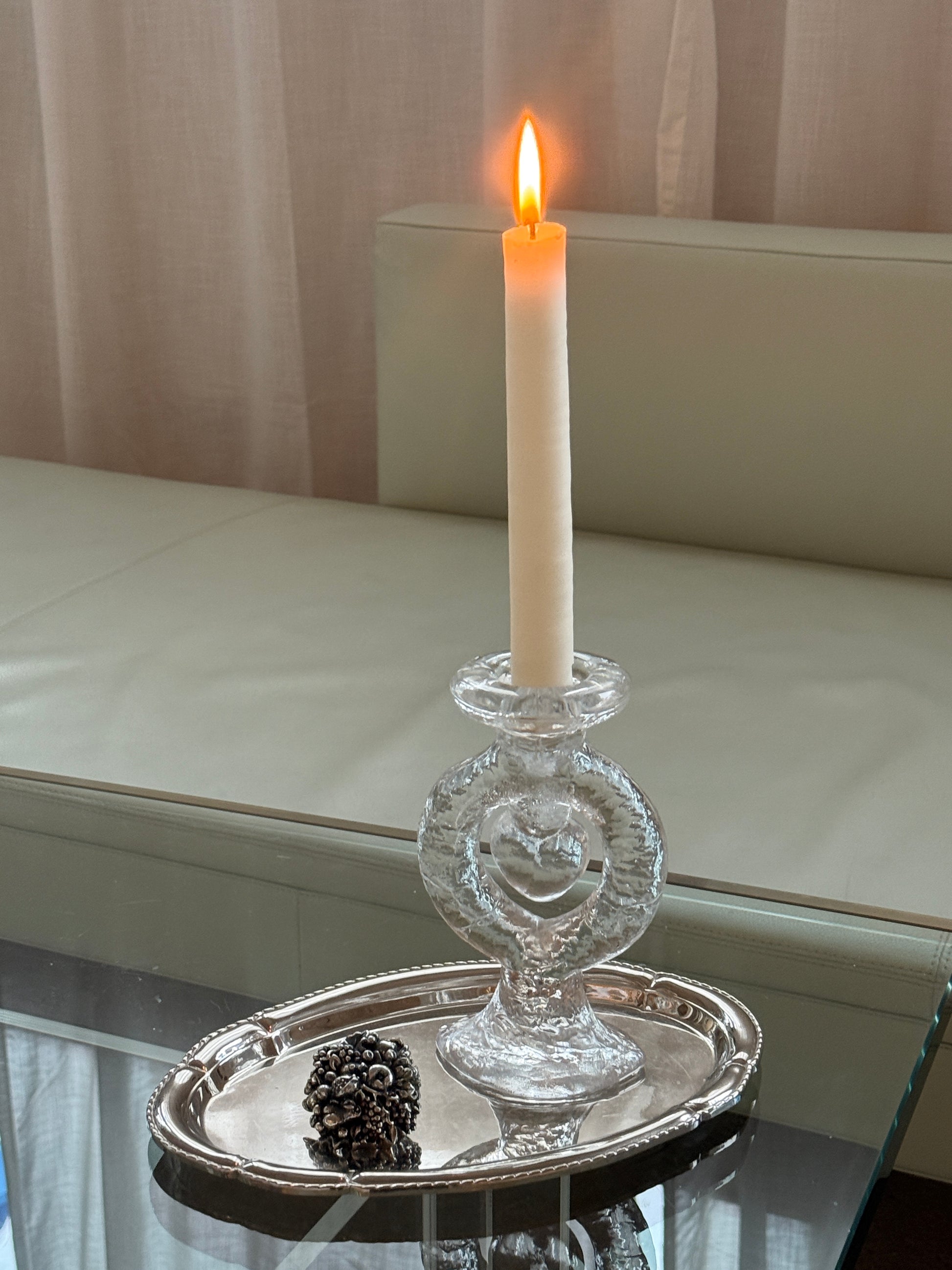 Den klare glasoverflade fanger lyset smukt og gør stagen dekorativ både med og uden lys. Perfekt på et dækket bord, i vindueskarmen eller som en fin gaveidé.
