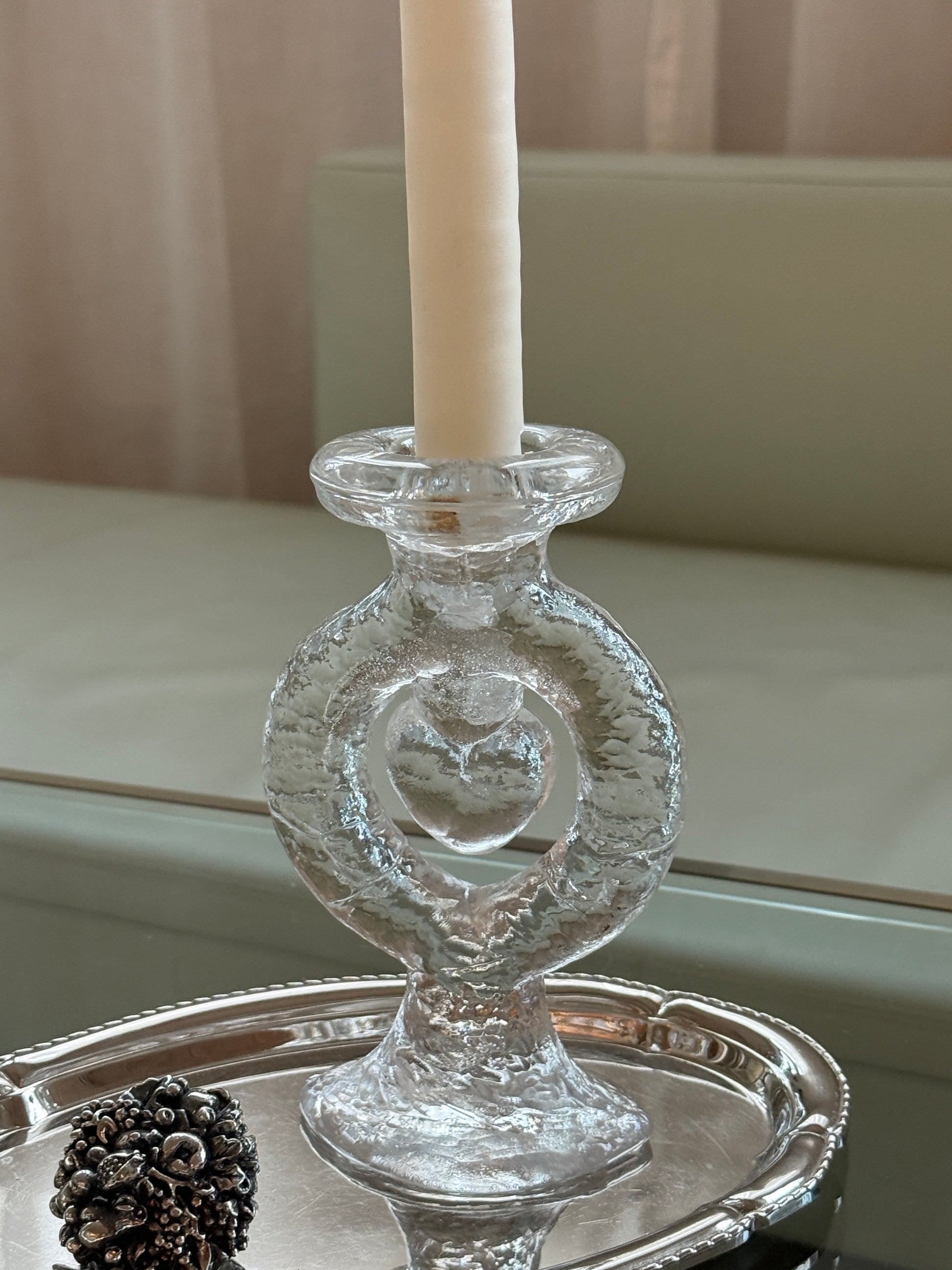 Smuk lysestage fra Pukeberg i det karakteristiske strukturerede pressglas. Stagen har en elegant, hjerteformet midte, som giver den et både romantisk og skulpturelt udtryk – et klassisk eksempel på svensk glaskunst med charme og tyngde.