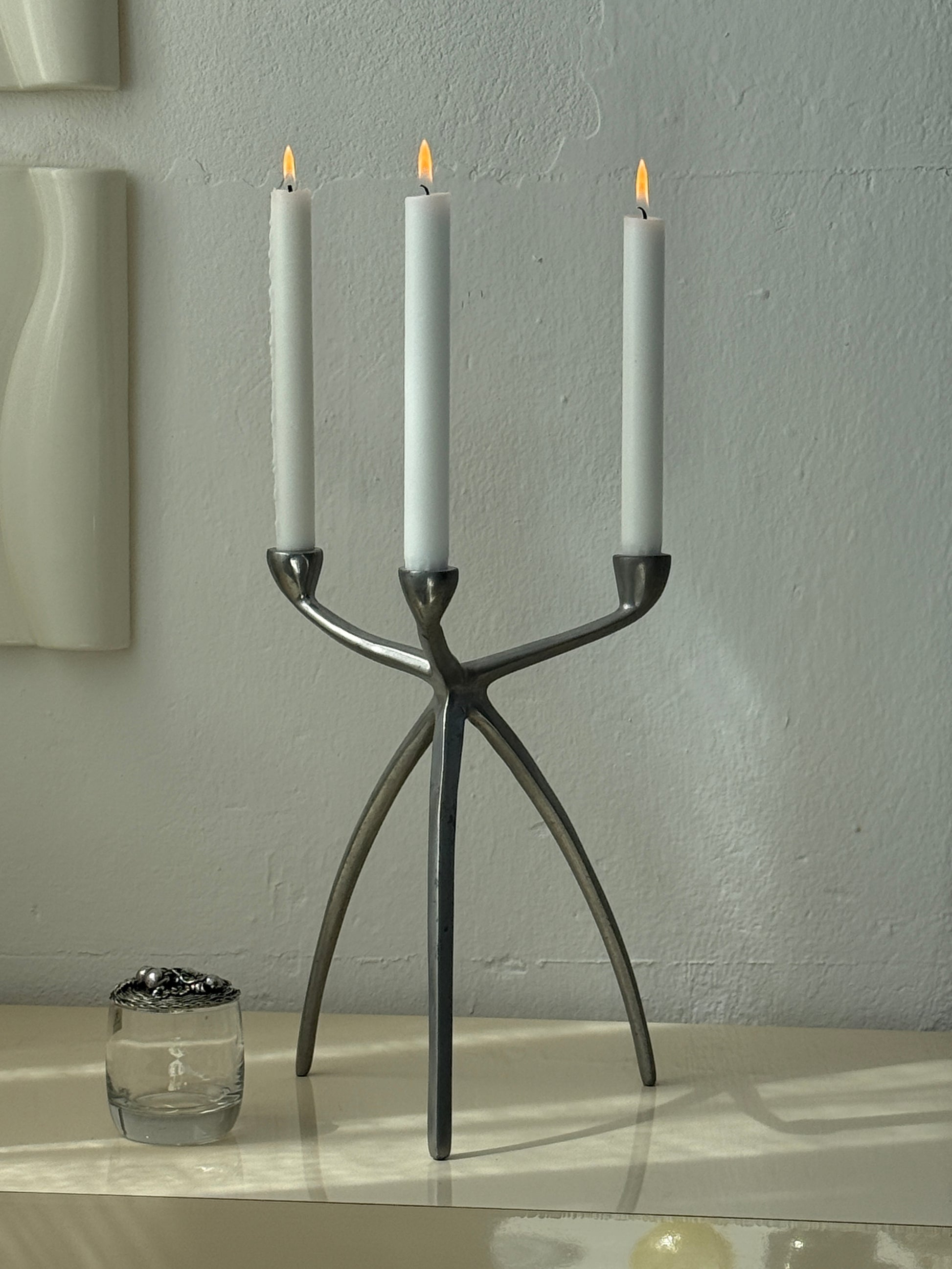 Karakterfuld vintage lysestage i støbt metal med tre buede ben og tre elegante arme. Det grafiske og balancerede formsprog giver stagen et kunstnerisk udtryk, mens den lette patina og slitage i overfladen vidner om alder og charme.