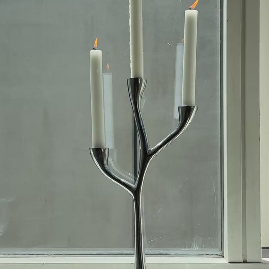 Skulpturel og moderne lysestage i blankpoleret aluminium med tre grene i organiske former. Designet leder tankerne hen på en stiliseret træform og giver et elegant udtryk. Den asymmetriske fordeling af de tre arme skaber en smuk balance og gør lysestagen til et iøjnefaldende element i indretningen – både med og uden lys.