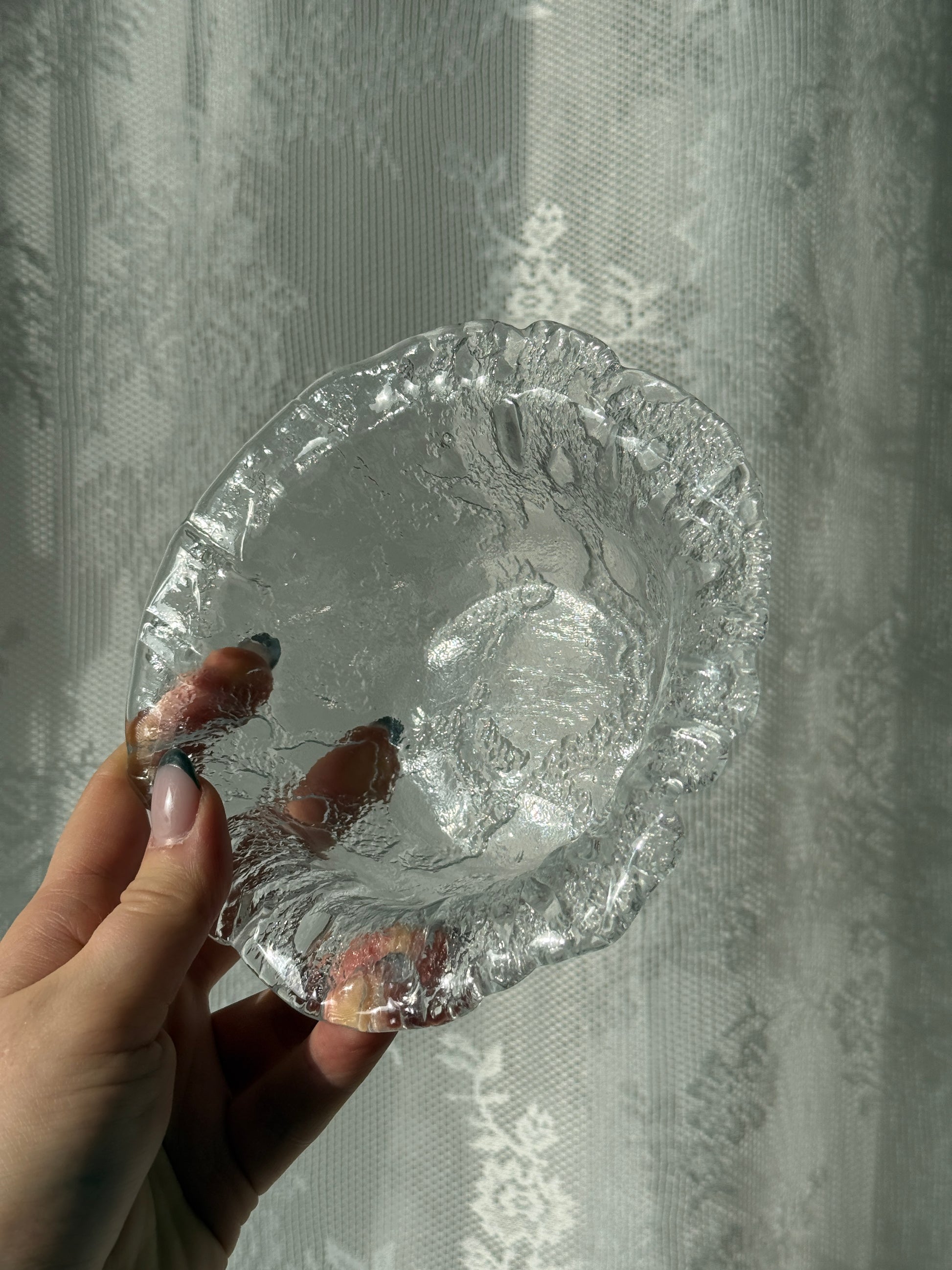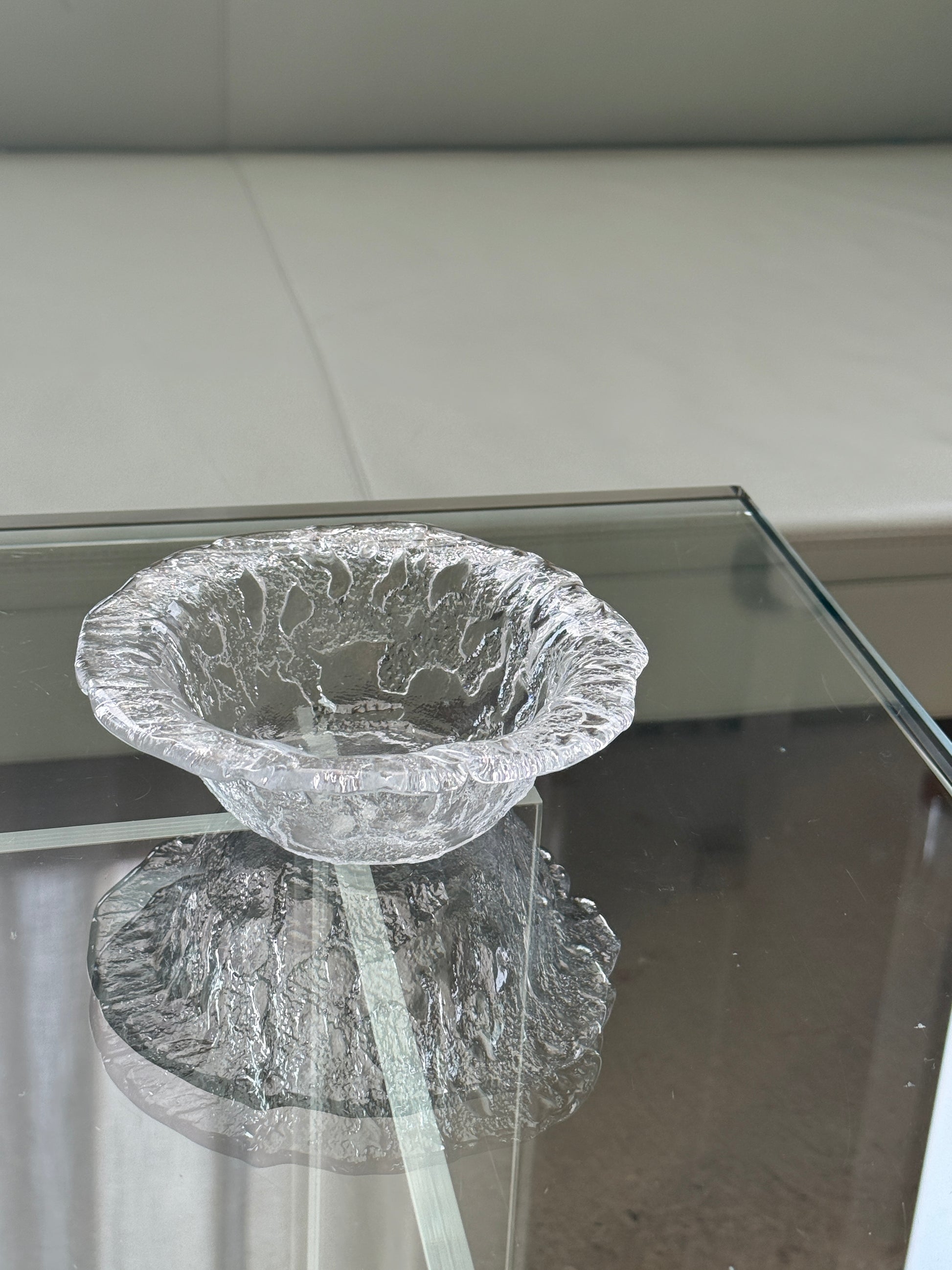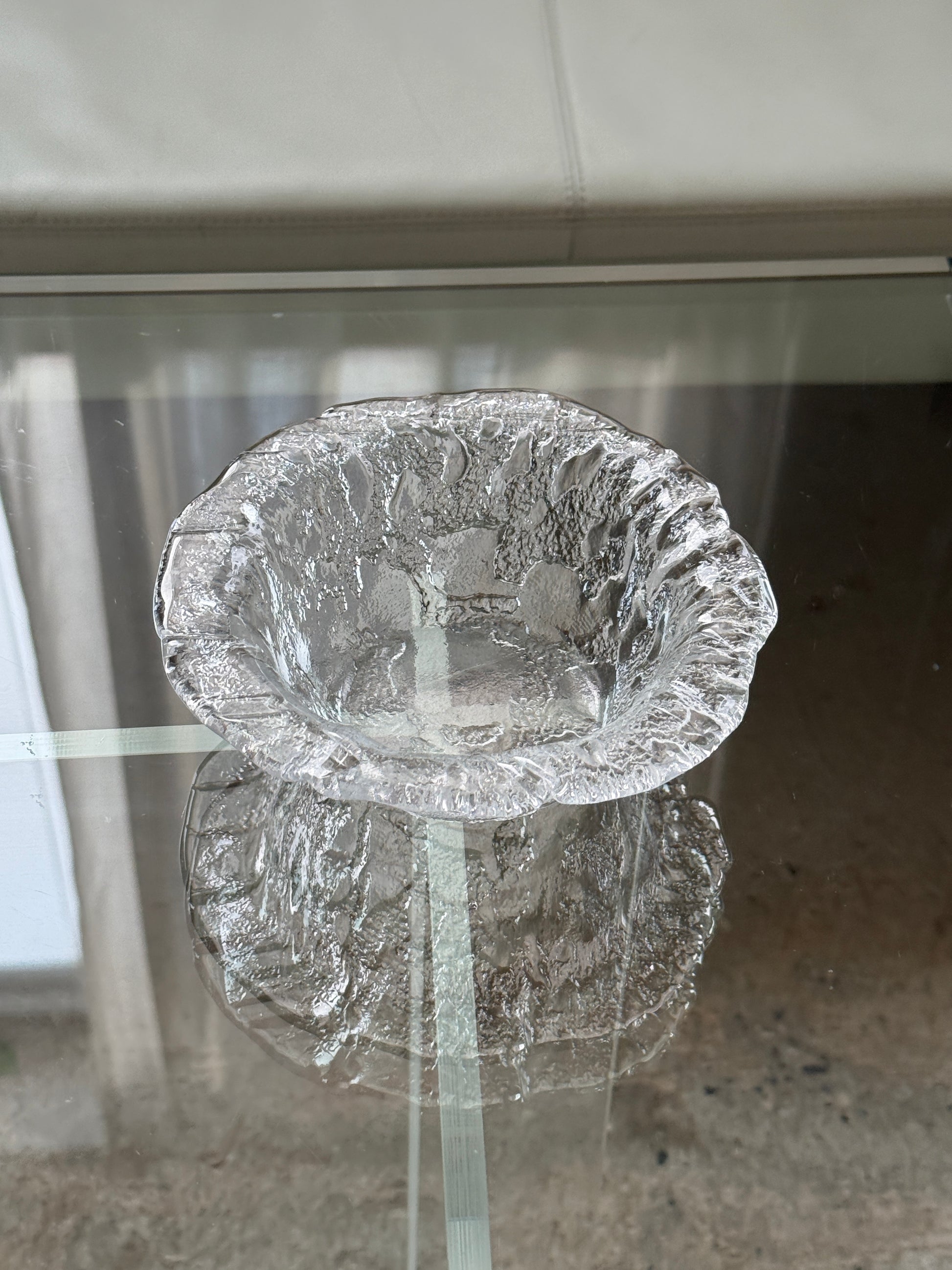 Smuk skål fra norske Magnor i kraftigt, klart glas med markant, organisk struktur. Den bølgede kant og det rå, næsten iskrystal-lignende mønster skaber et levende lysspil og giver skålen et eksklusivt og nordisk udtryk.