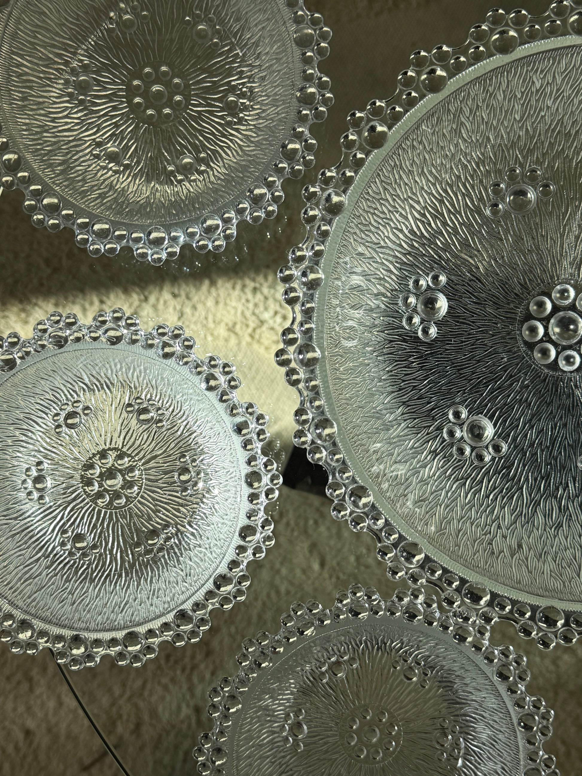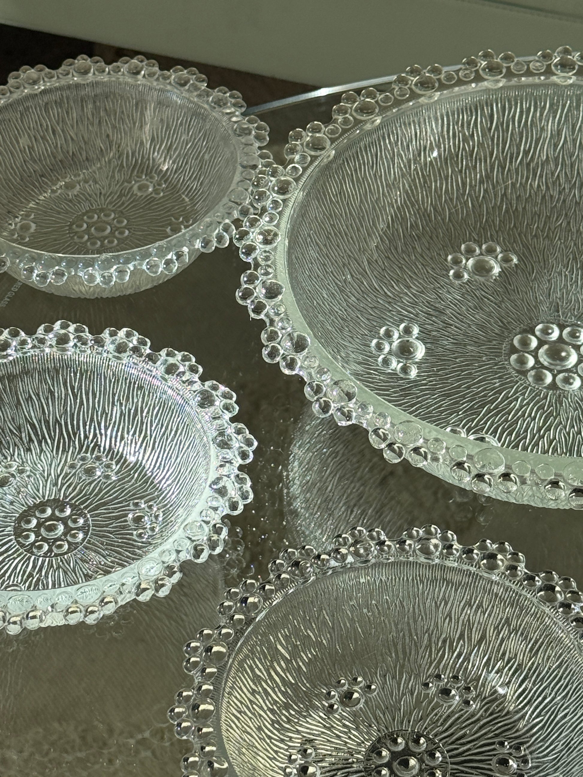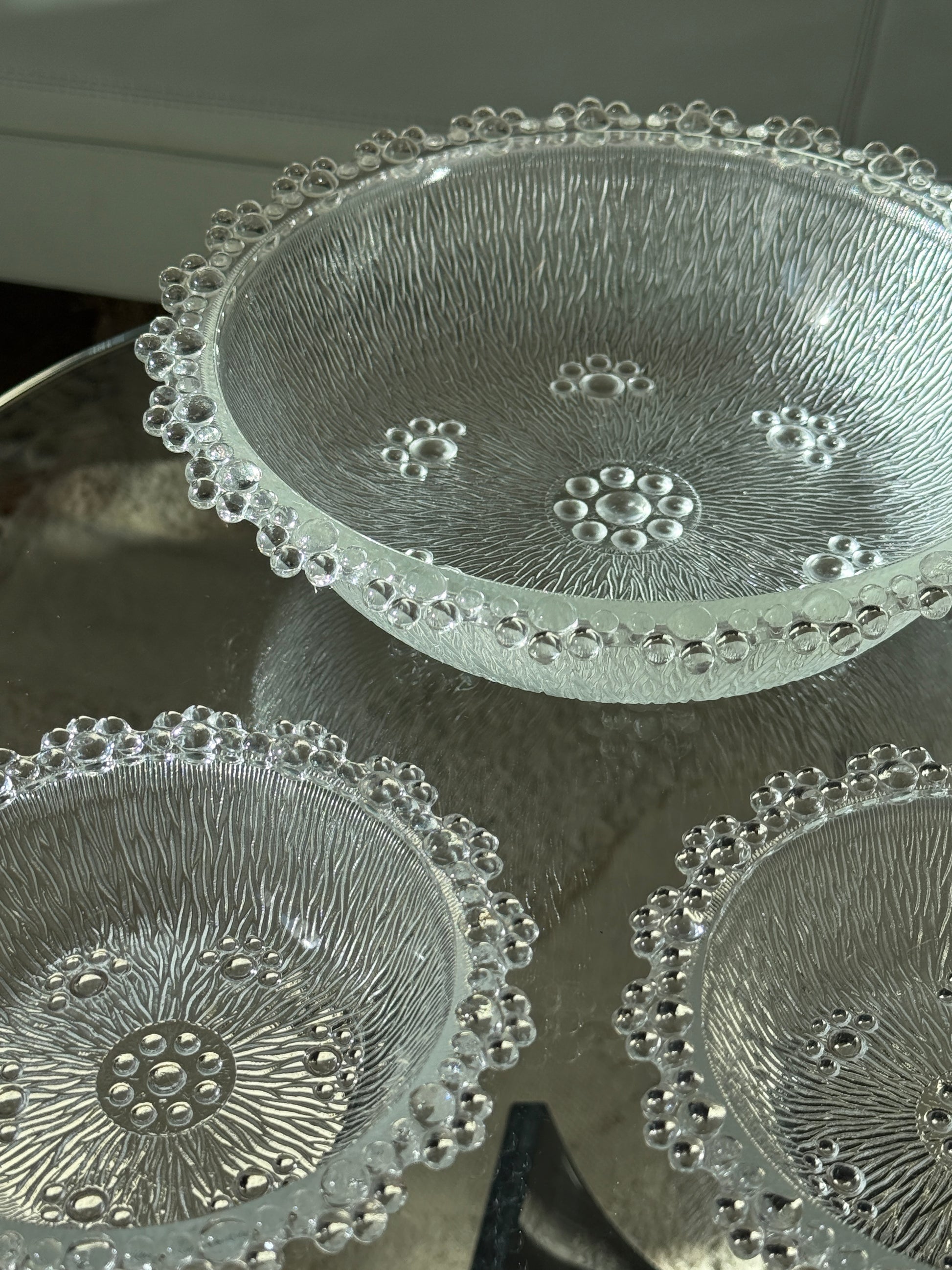 Smukke vintage glasskåle fra Masserini Barocco, Italien. Skålene er udført i klart glas med den karakteristiske teksturerede overflade og dekorativ boblekant – et elegant design, der fanger lyset og giver et luksuriøst udtryk.