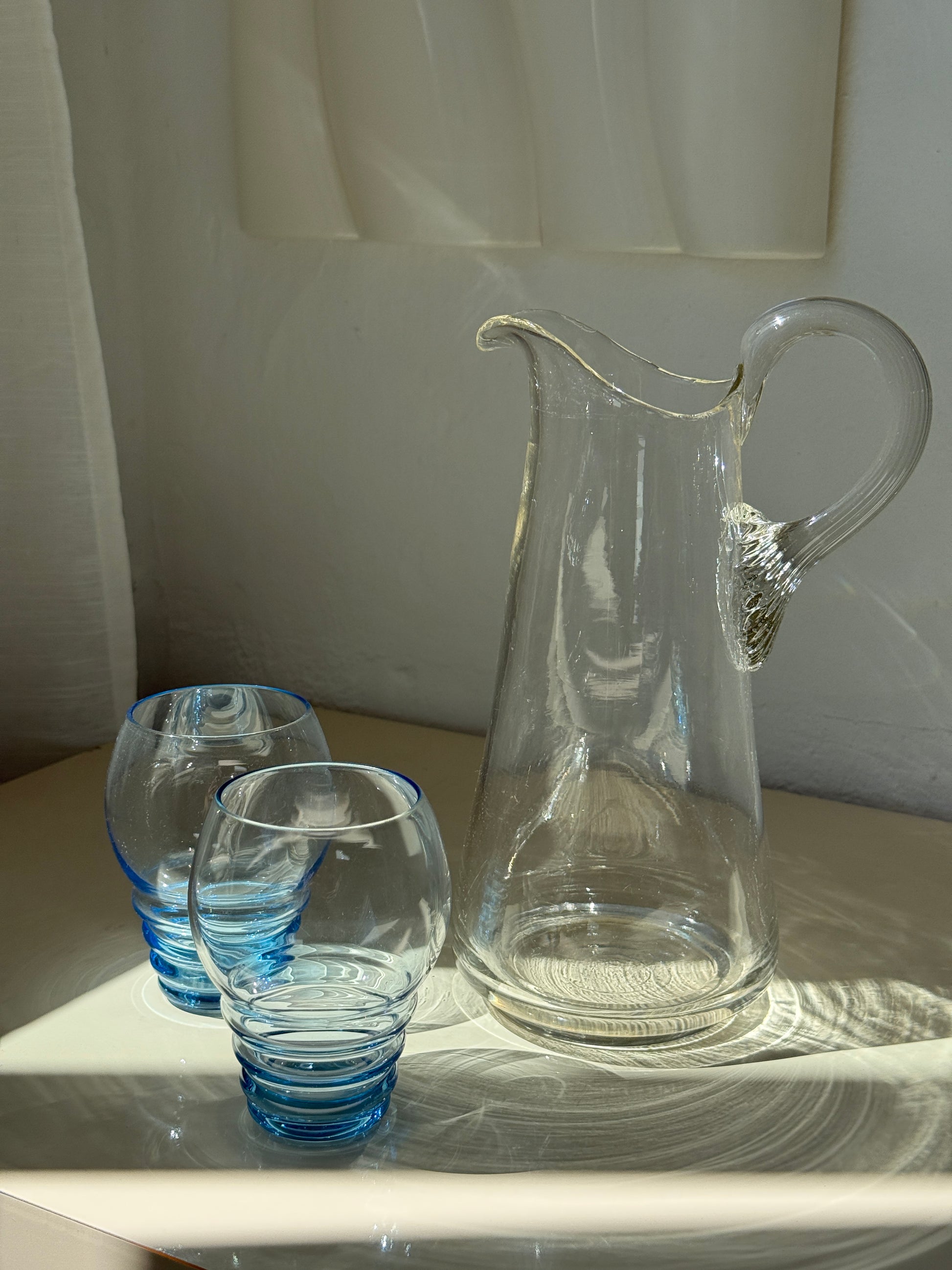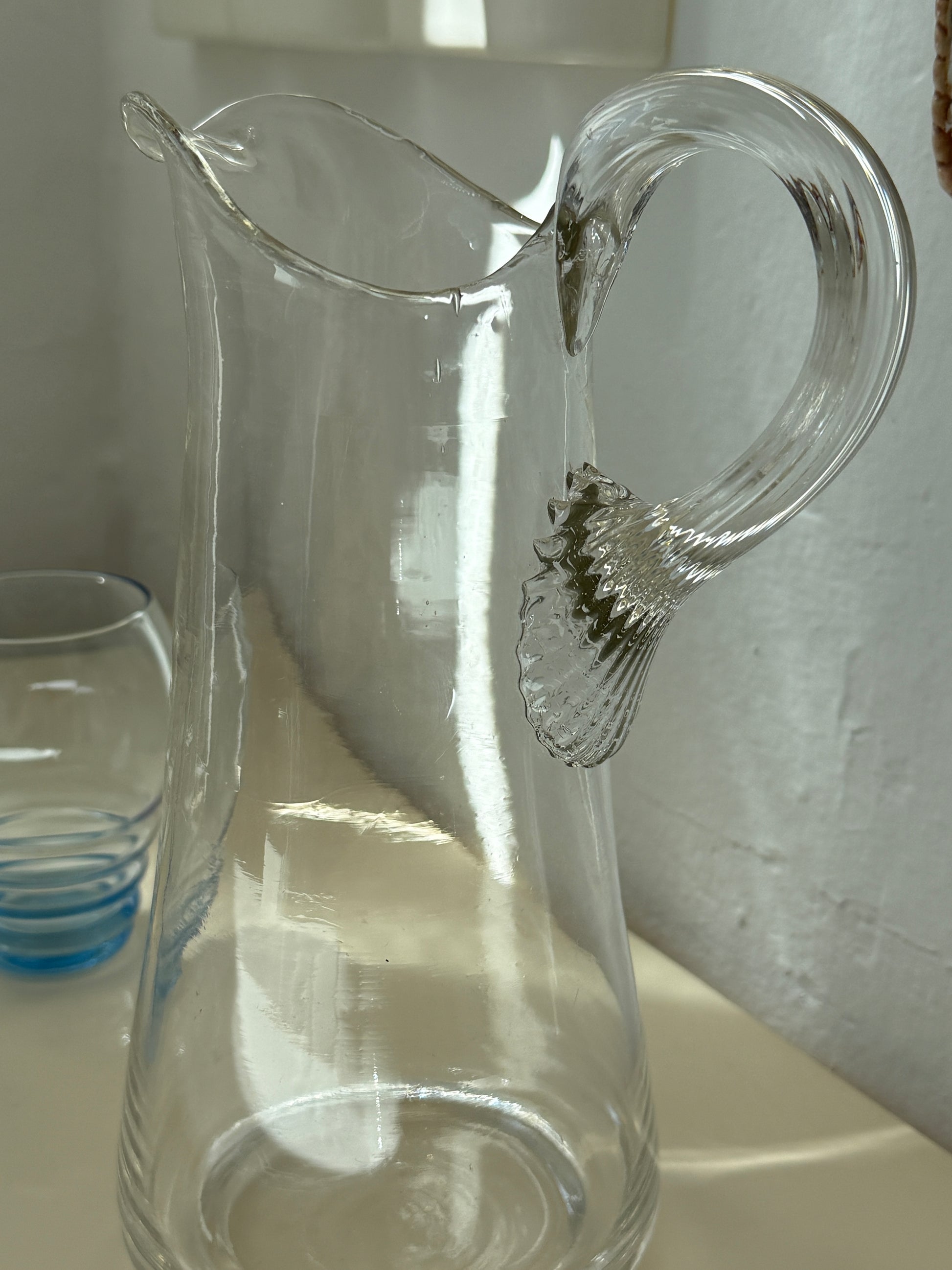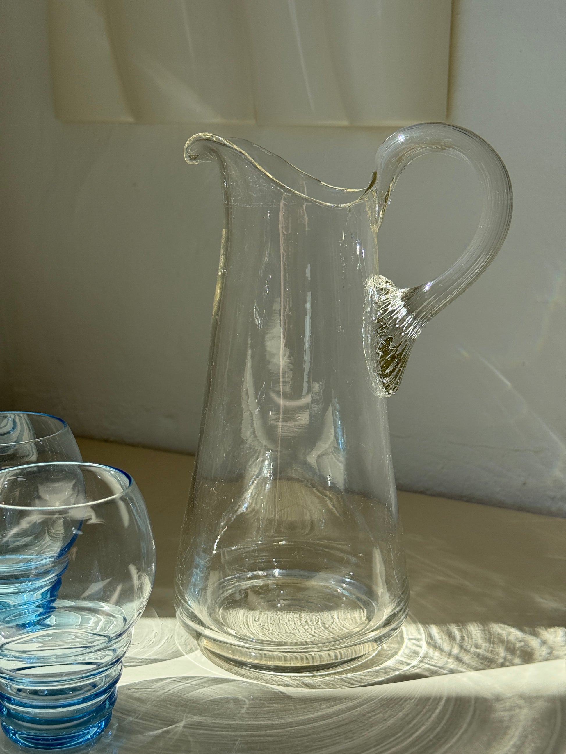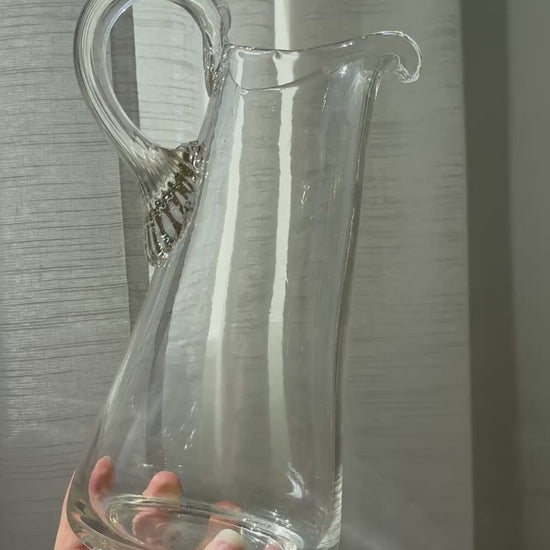Elegant og enkel mundblæst glaskande med smuk, rillet hank og klassisk hældetud. Glassets lette ujævnheder og små bobler vidner om håndværket bag, og kanden har et let, organisk udtryk. Den står en smule ujævnt, hvilket understreger dens unikke og håndlavede karakter.