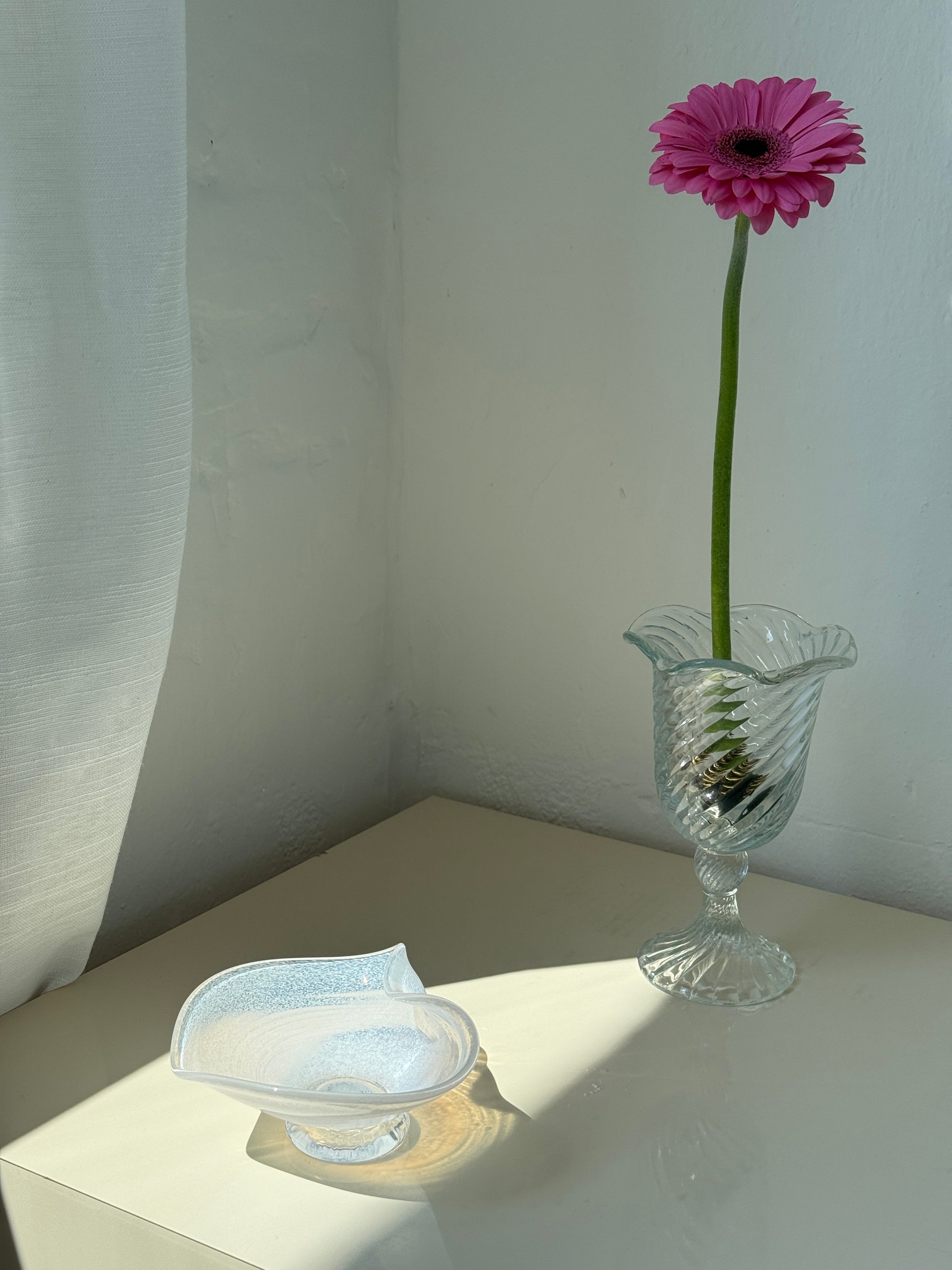 Elegant mundblæst skål i klart glas med en smuk, blød form og et let hvidligt skær i selve glasset. Den håndlavede karakter ses i de fine variationer i glas og form – meget smuk! Velegnet som dekoration på sodabordet eller til opbevaring af smykker.