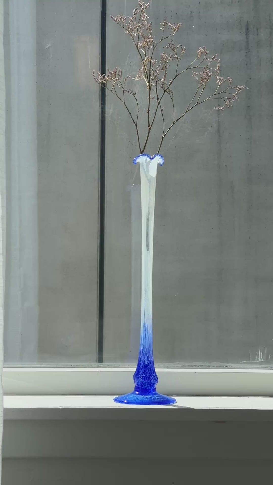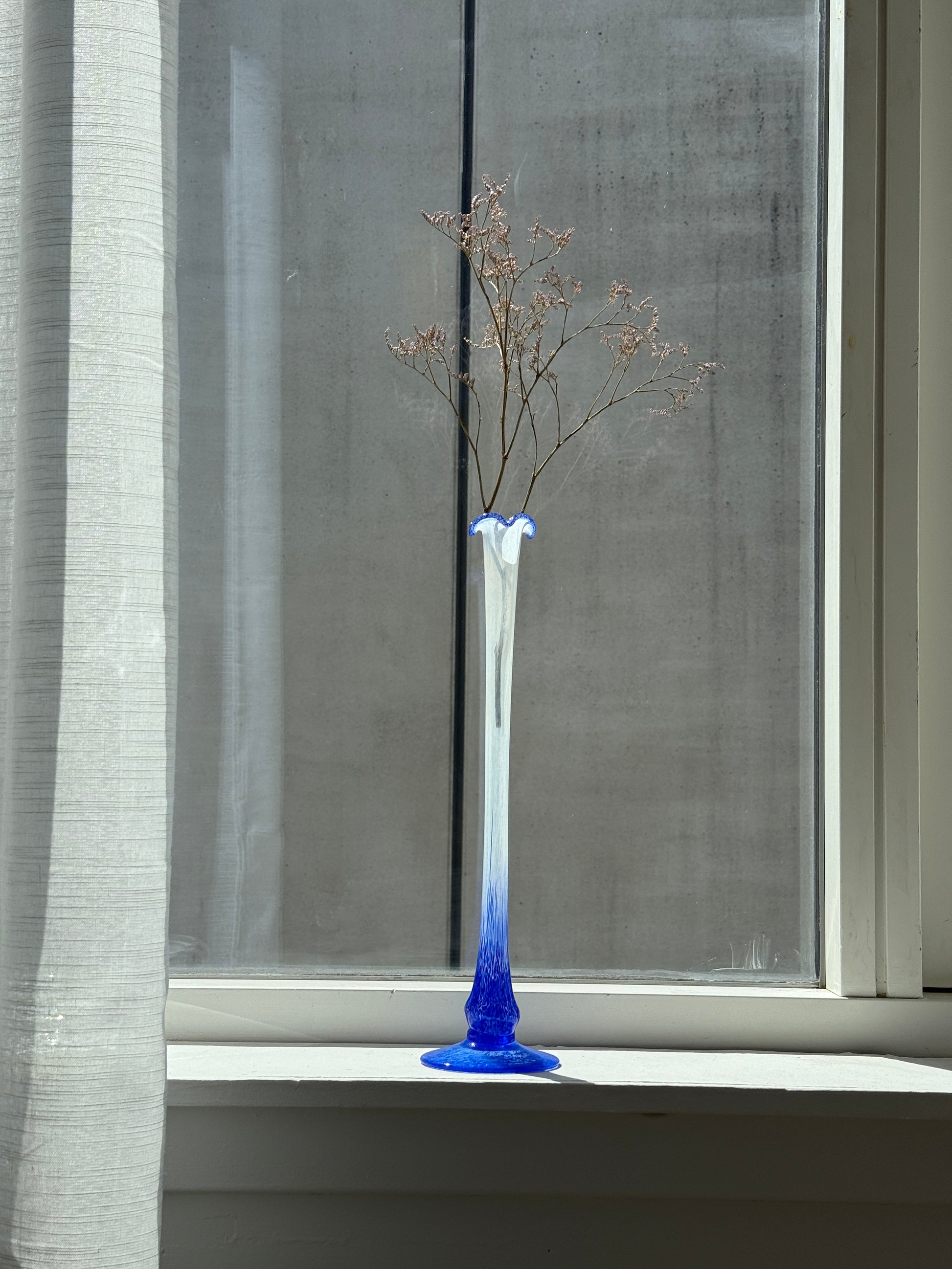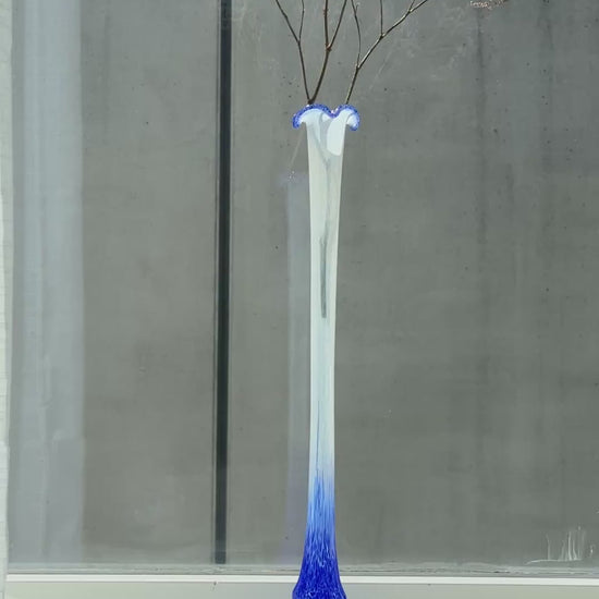 Yndefuld og elegant glasvase med smal, lang hals og let bølget åbning. Den hvide krop fader over i en intens koboltblå fod, som giver et kunstnerisk og nærmest eventyrligt udtryk. Perfekt til én tørret stilk eller alene som skulpturel dekoration i vindueskarmen.