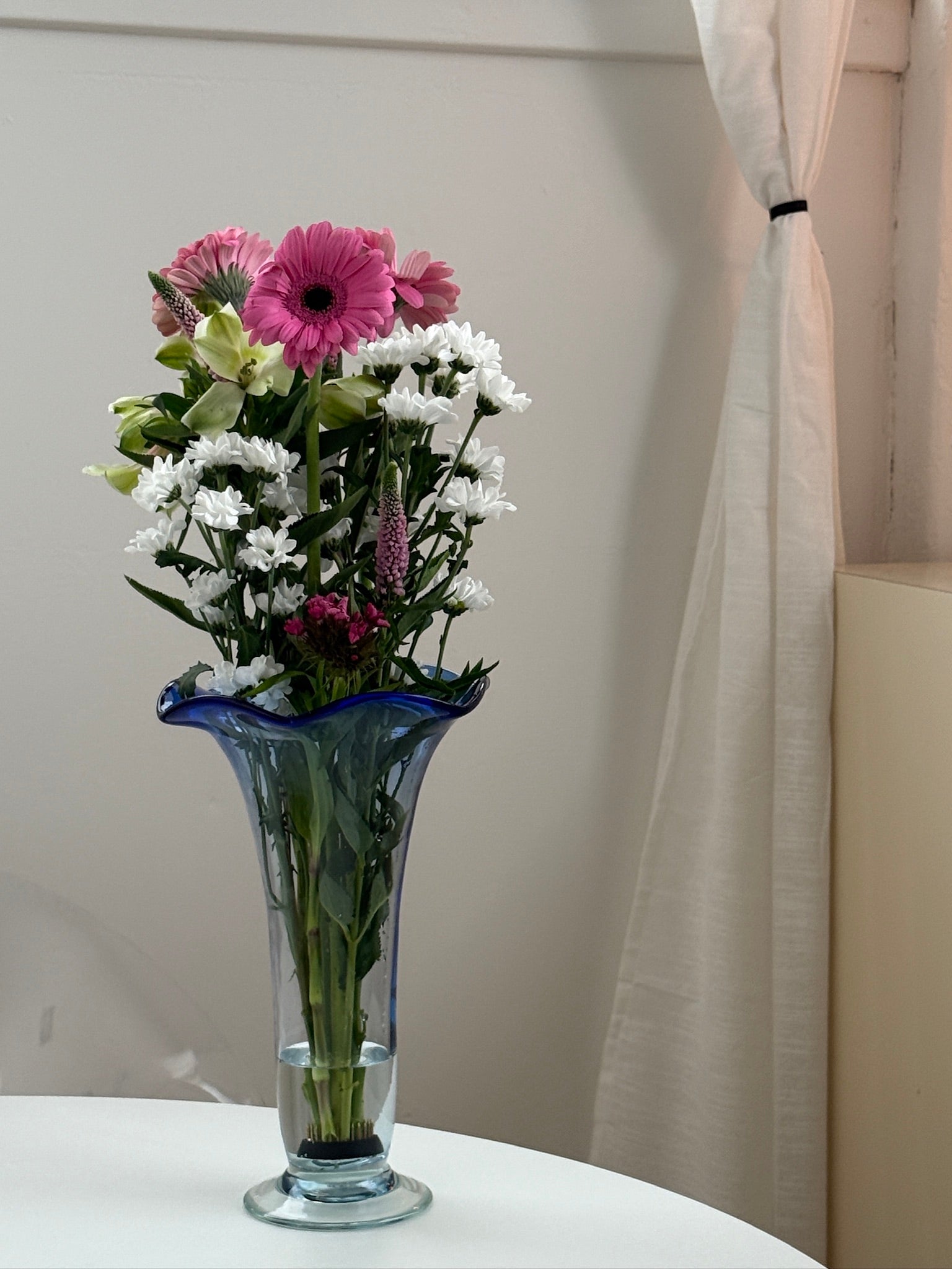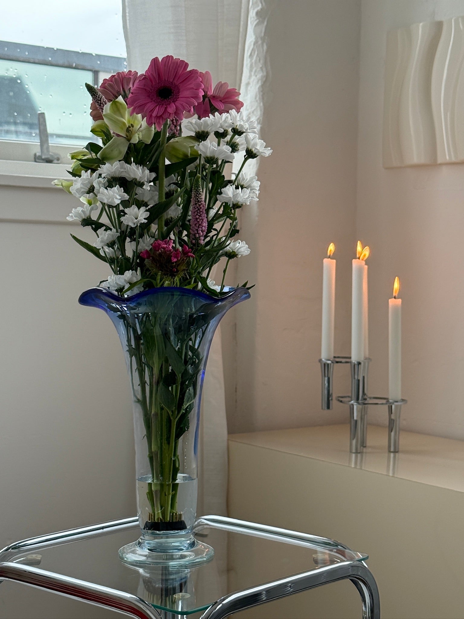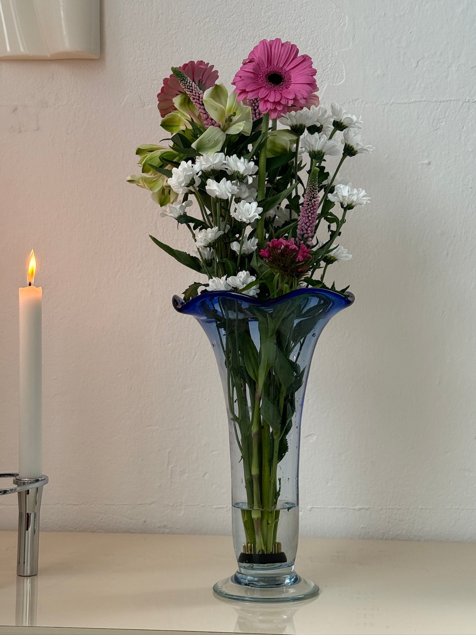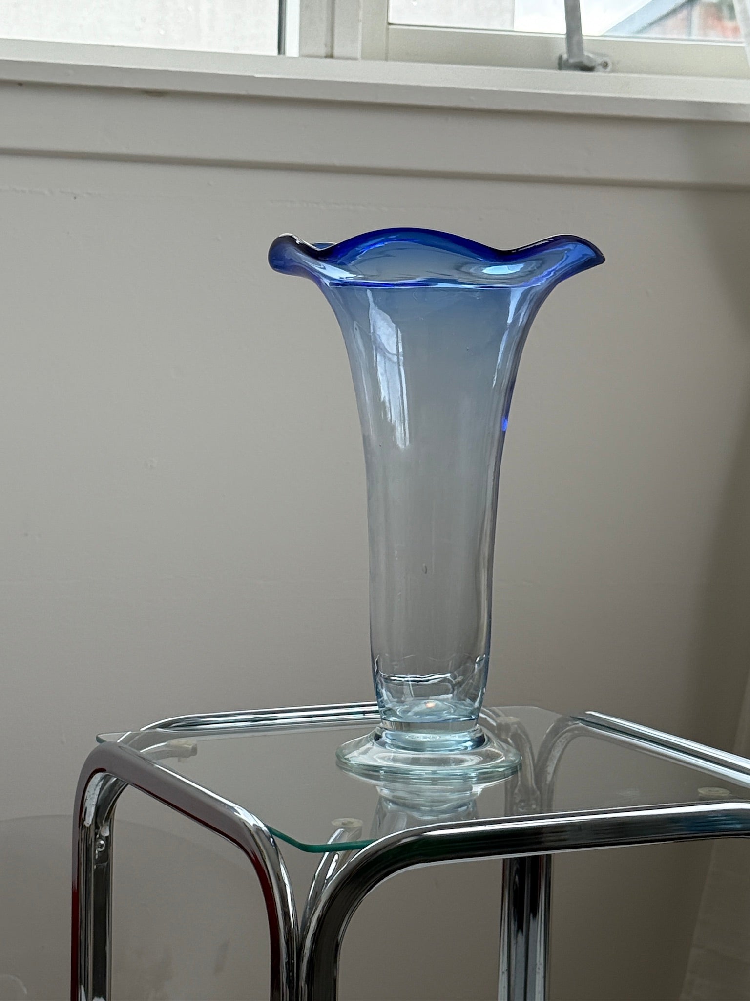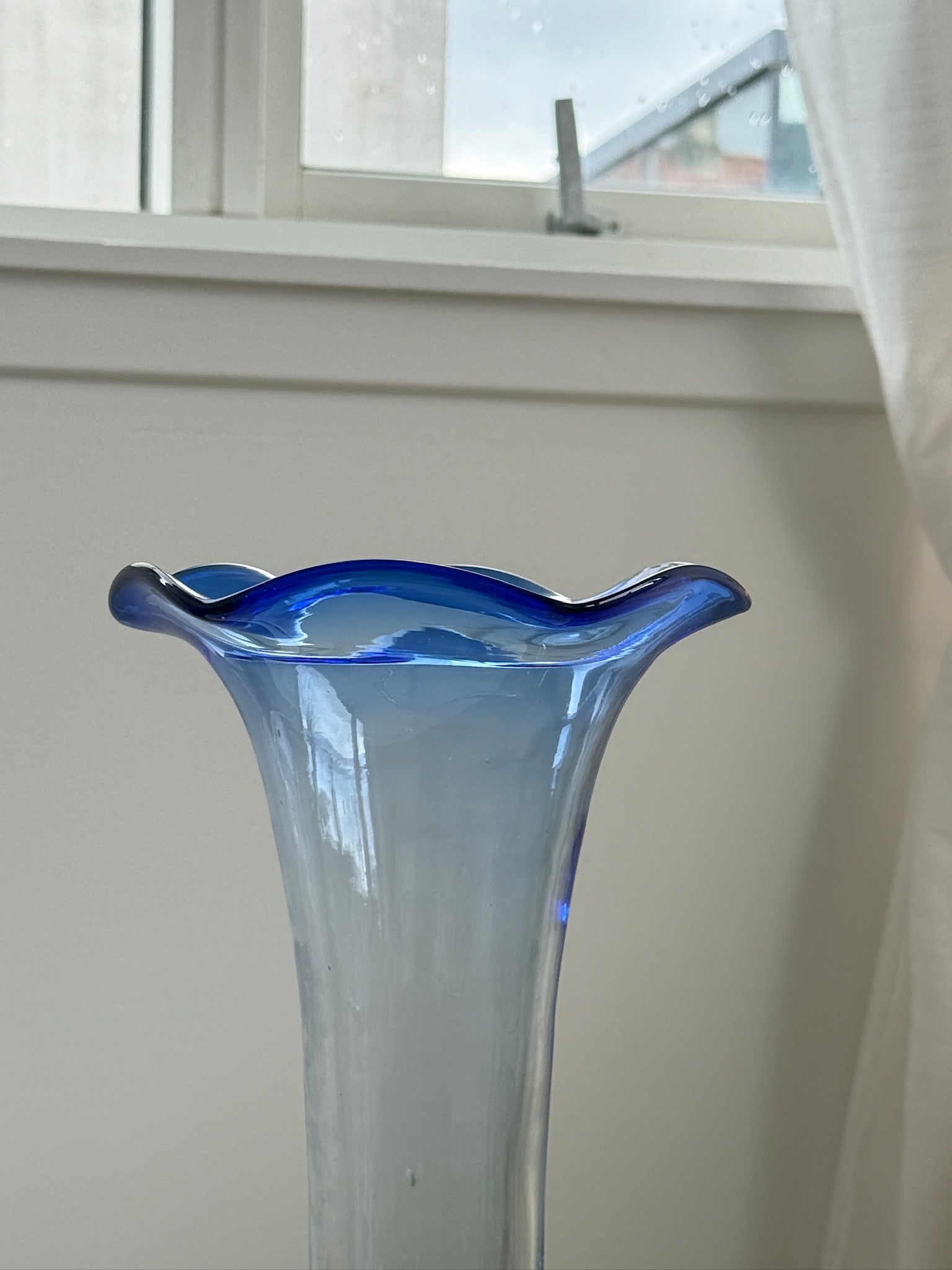 Elegant mundblæst vase i klart glas med blå kant og bølget åbning, der smyger sig blødt som kronblade. Farvespillet mellem det klare og blå glas understreger det håndværksmæssige og unikke i denne smukke vase.