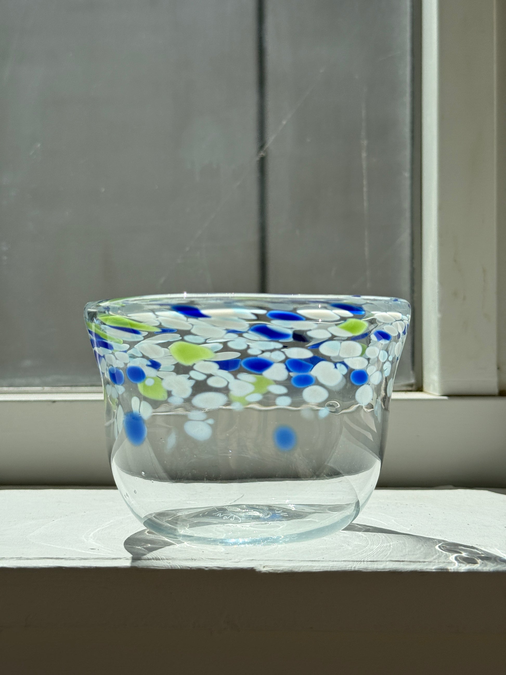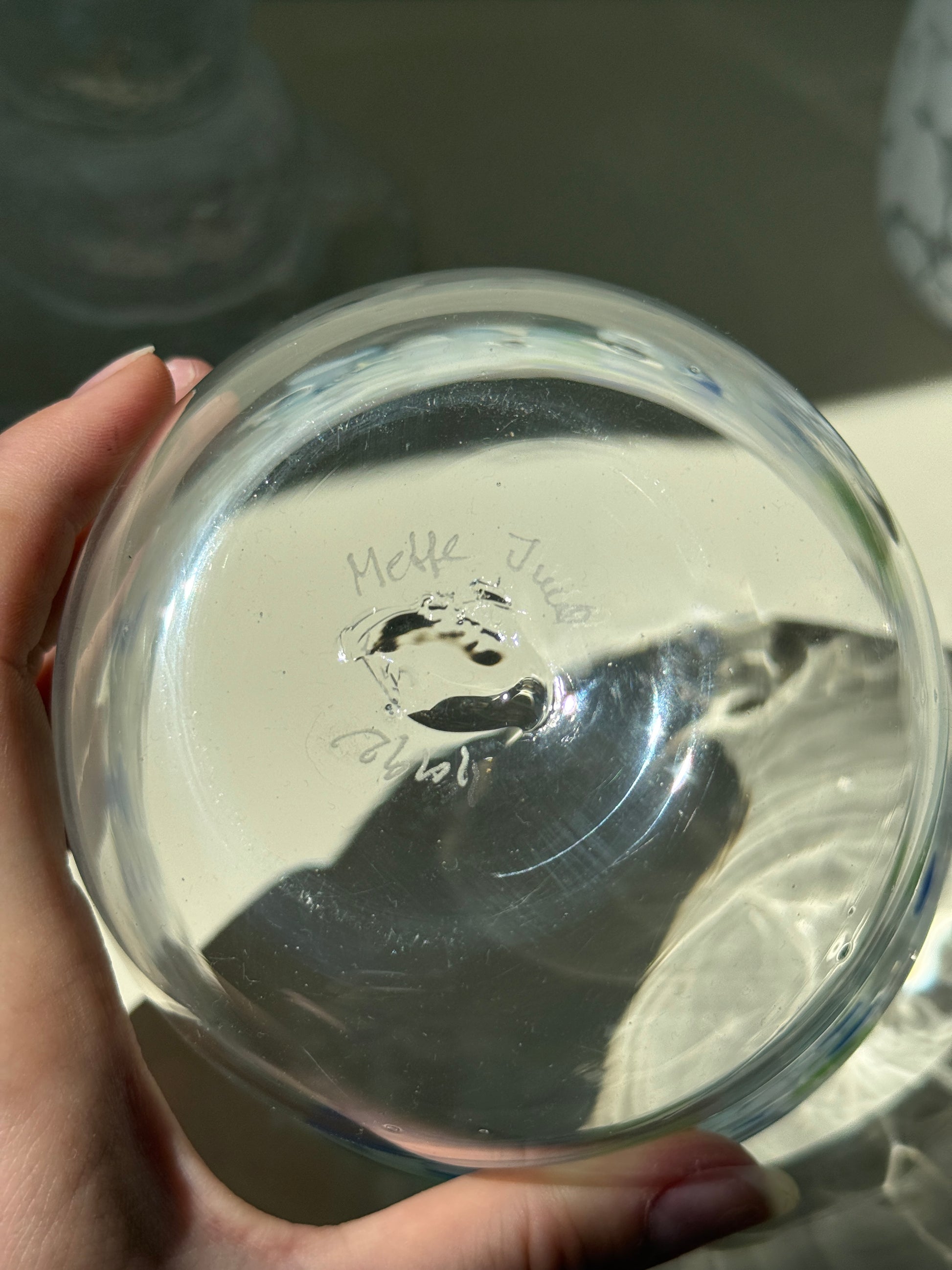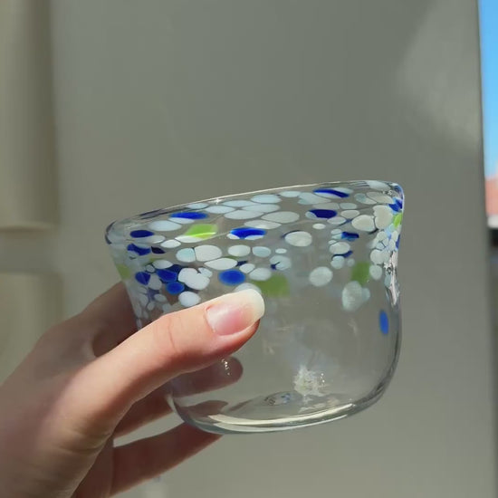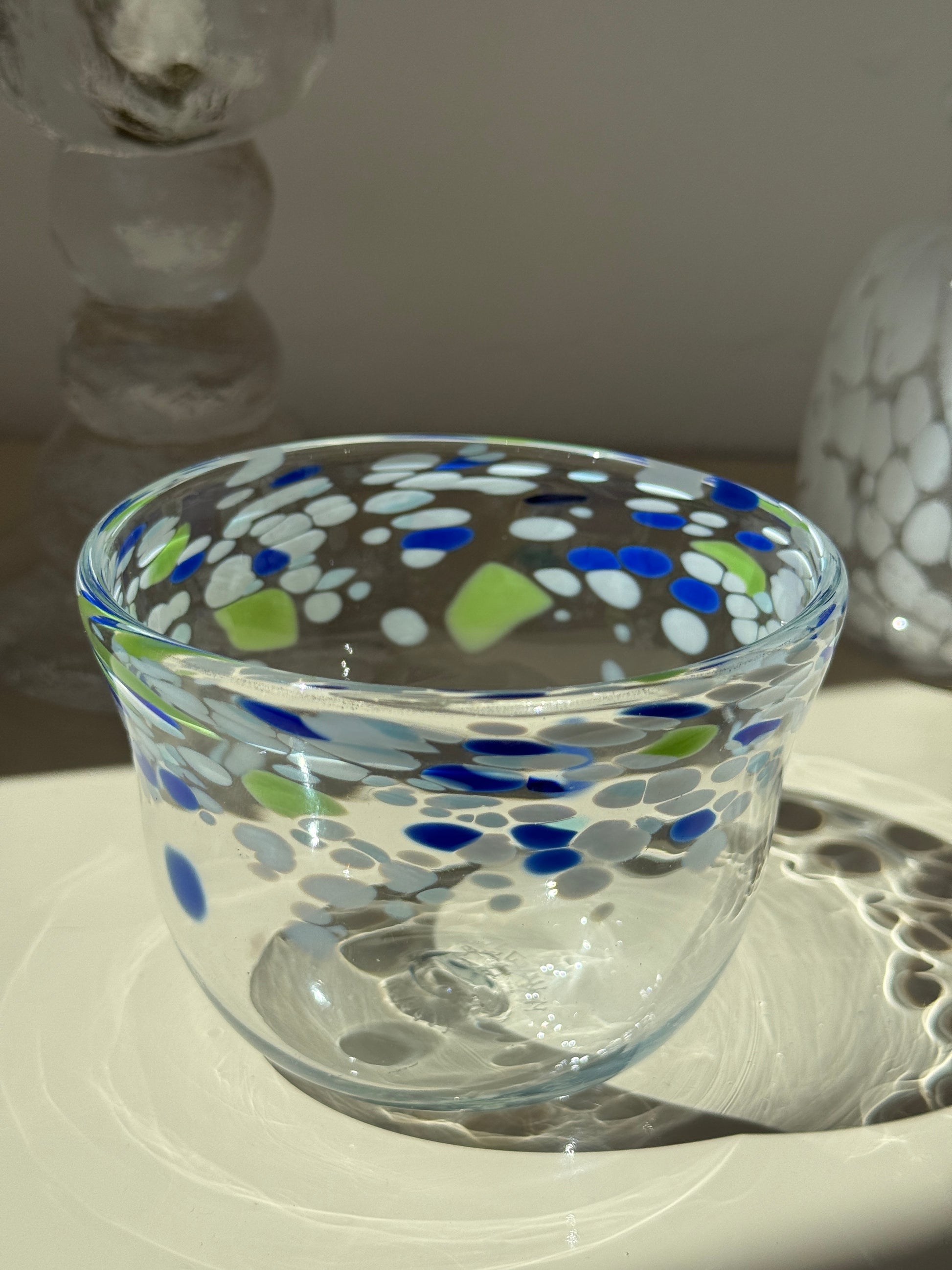 Farverig mundblæst glasskål dekoreret med spredte “confetti”-pletter i hvid, blå og grøn. Skålen har et legende, kunstnerisk udtryk med sin organiske form og transparente glas, som fanger lyset smukt. Et charmerende stykke glasdesign, der er signeret/dateret 1992 i bunden.