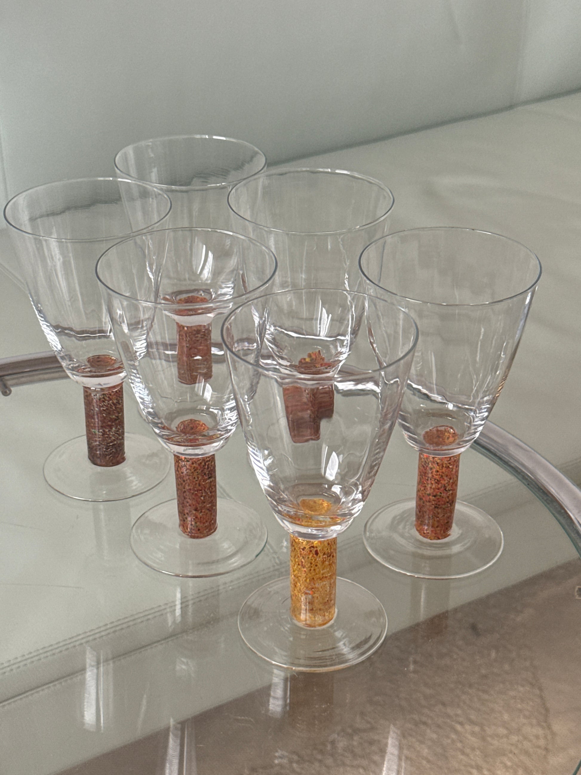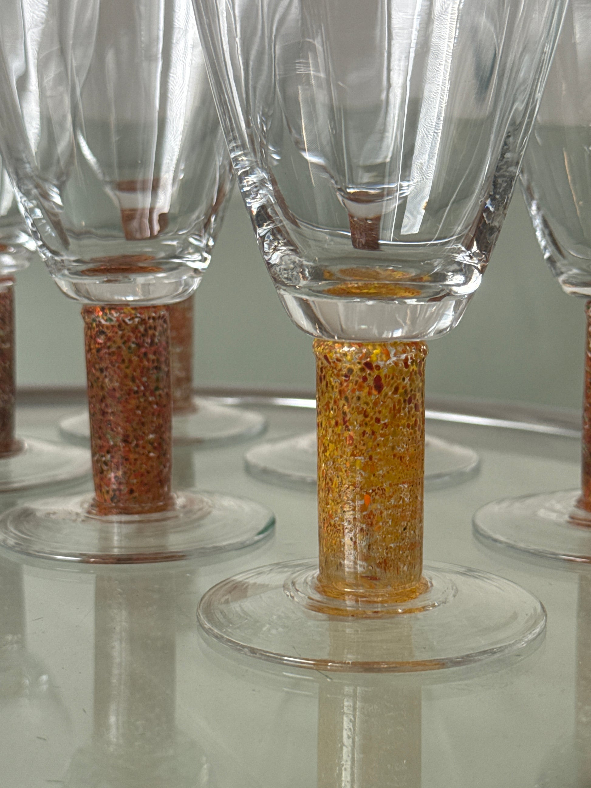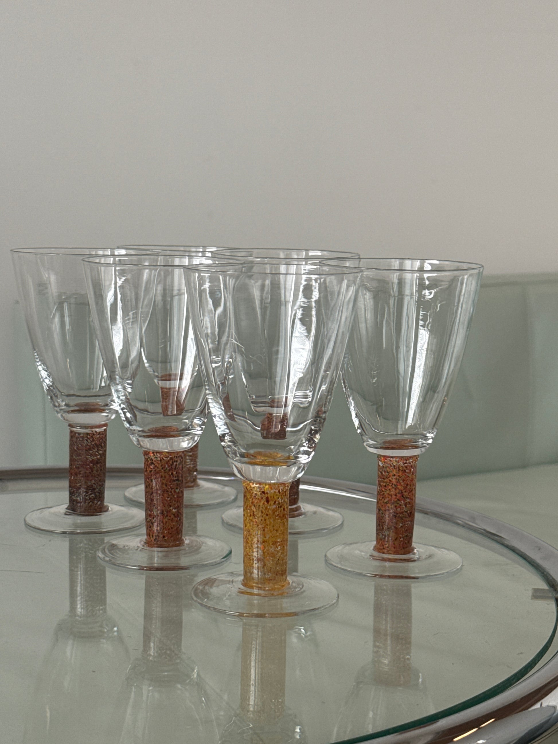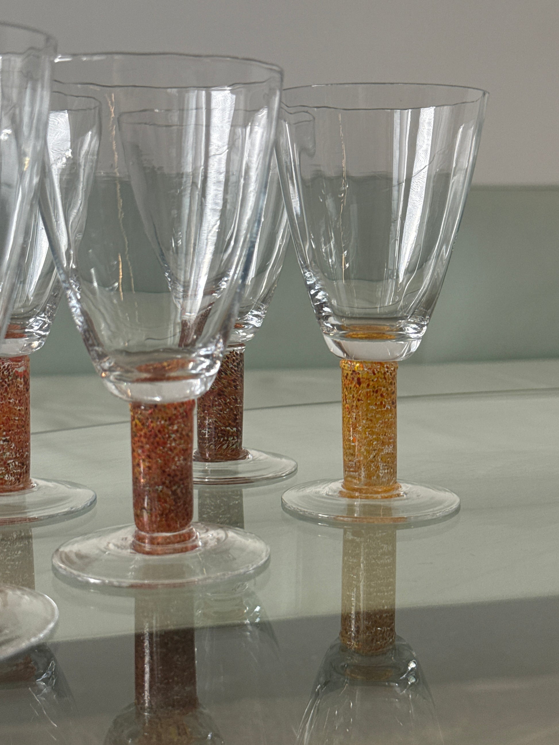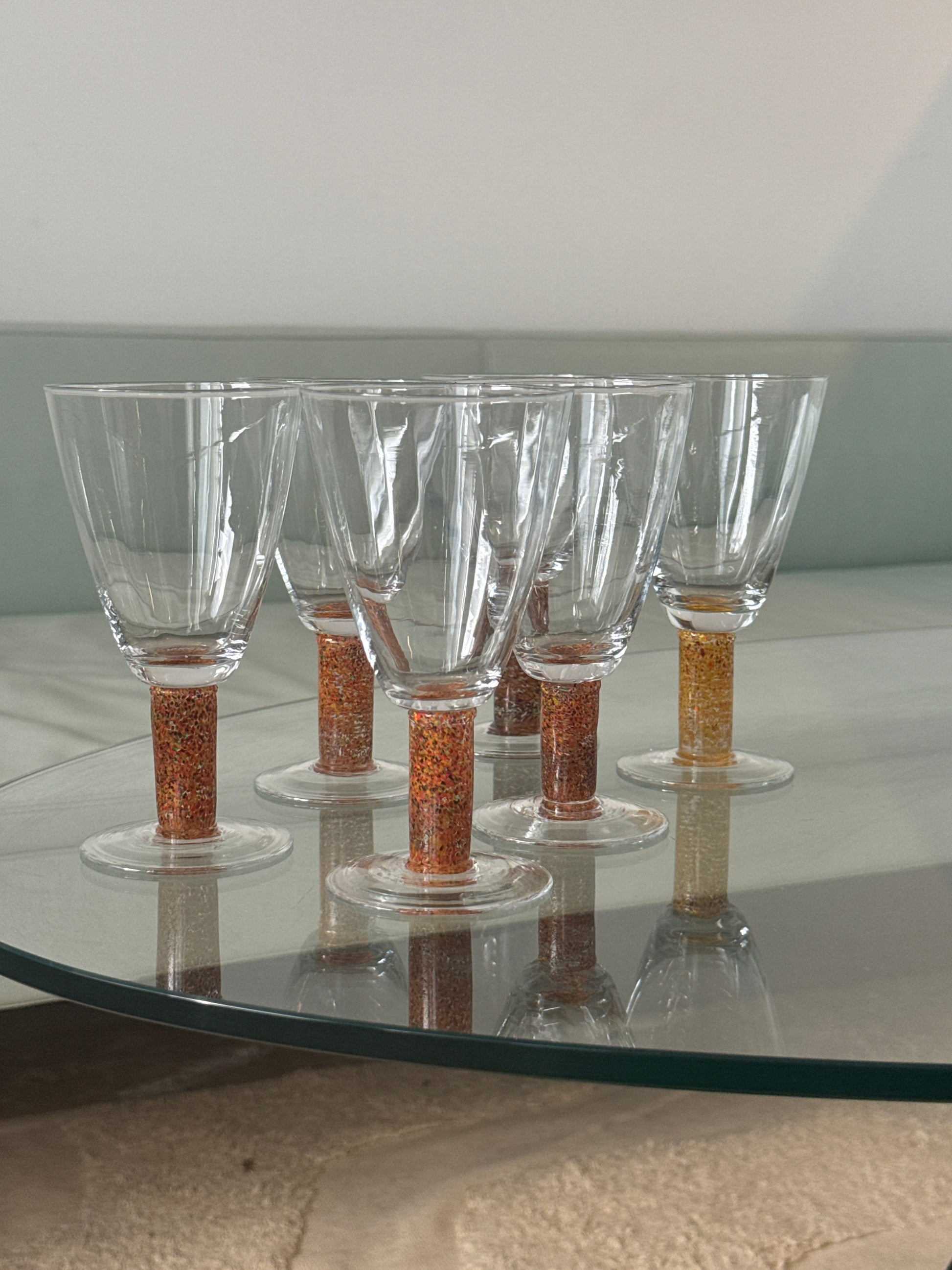 Et sæt på 6 mundblæste vinglas med farverige stilke, der leder tankerne hen på tivoli og et drys af krymmel. Varierer i farve og størrelse.