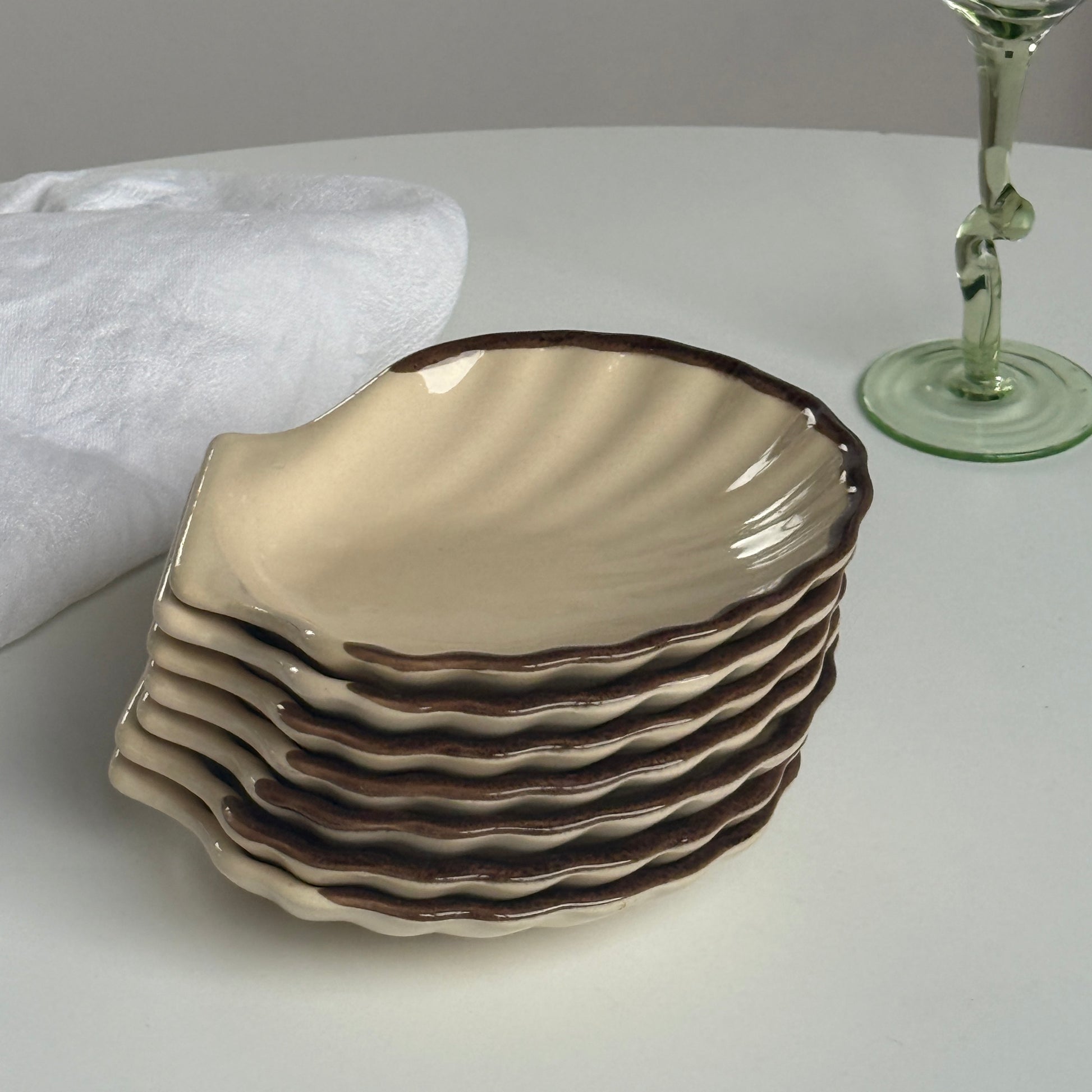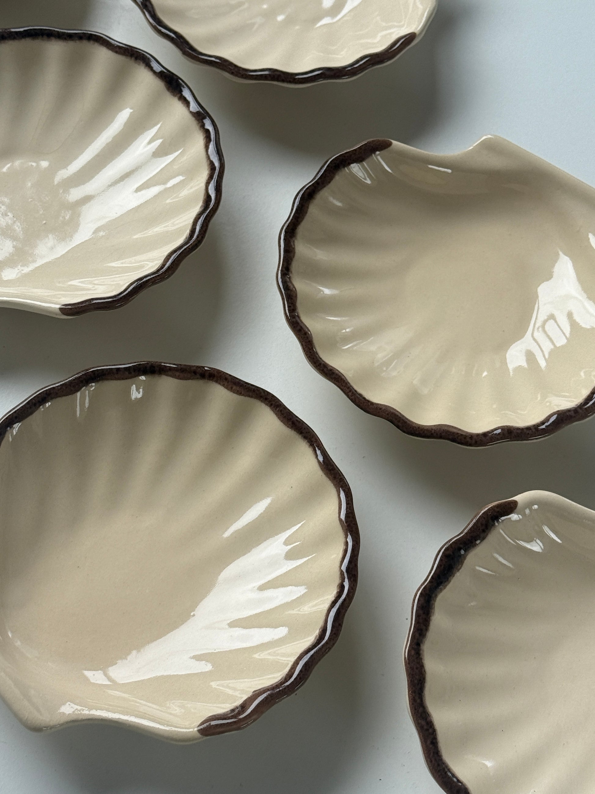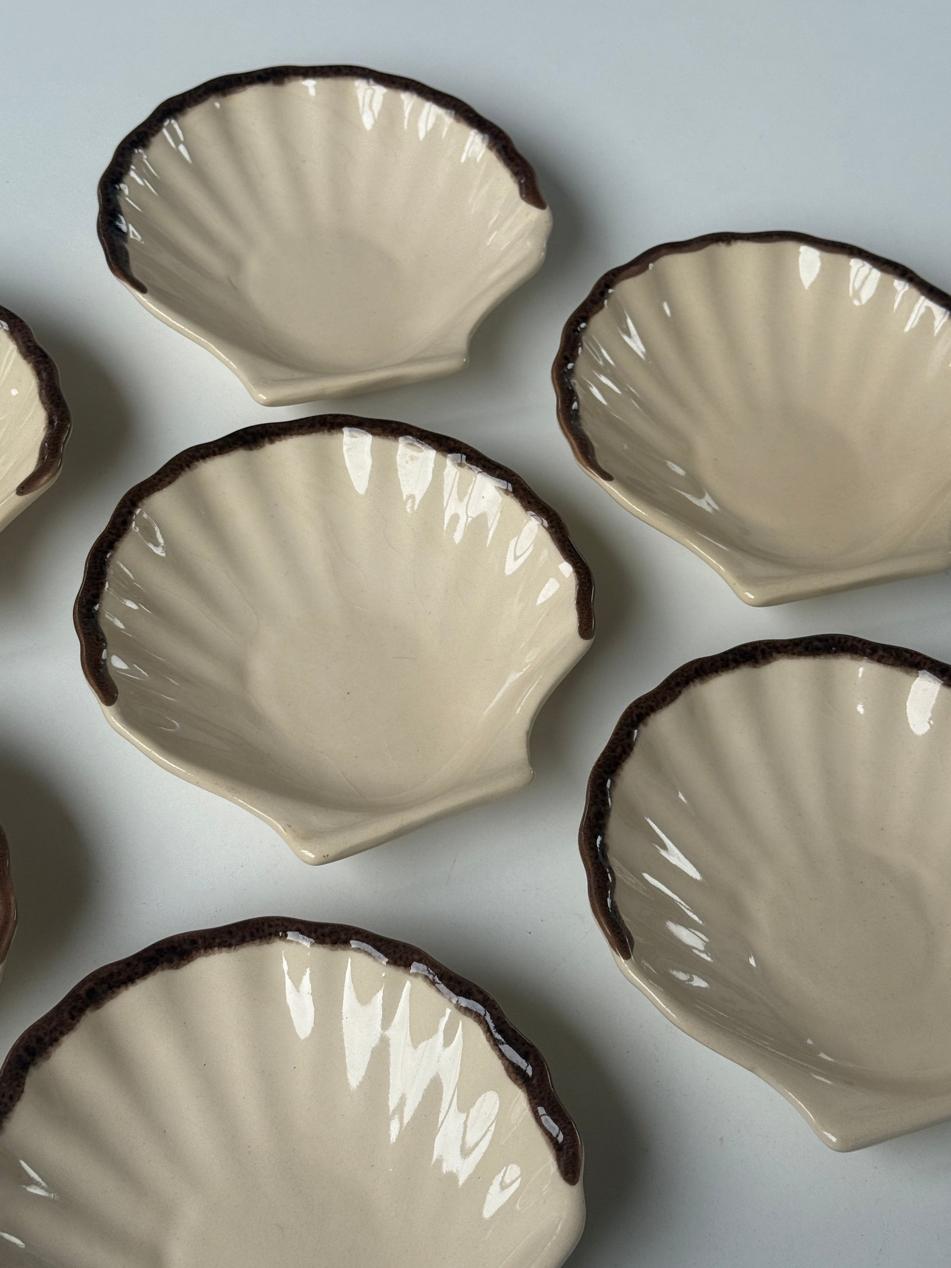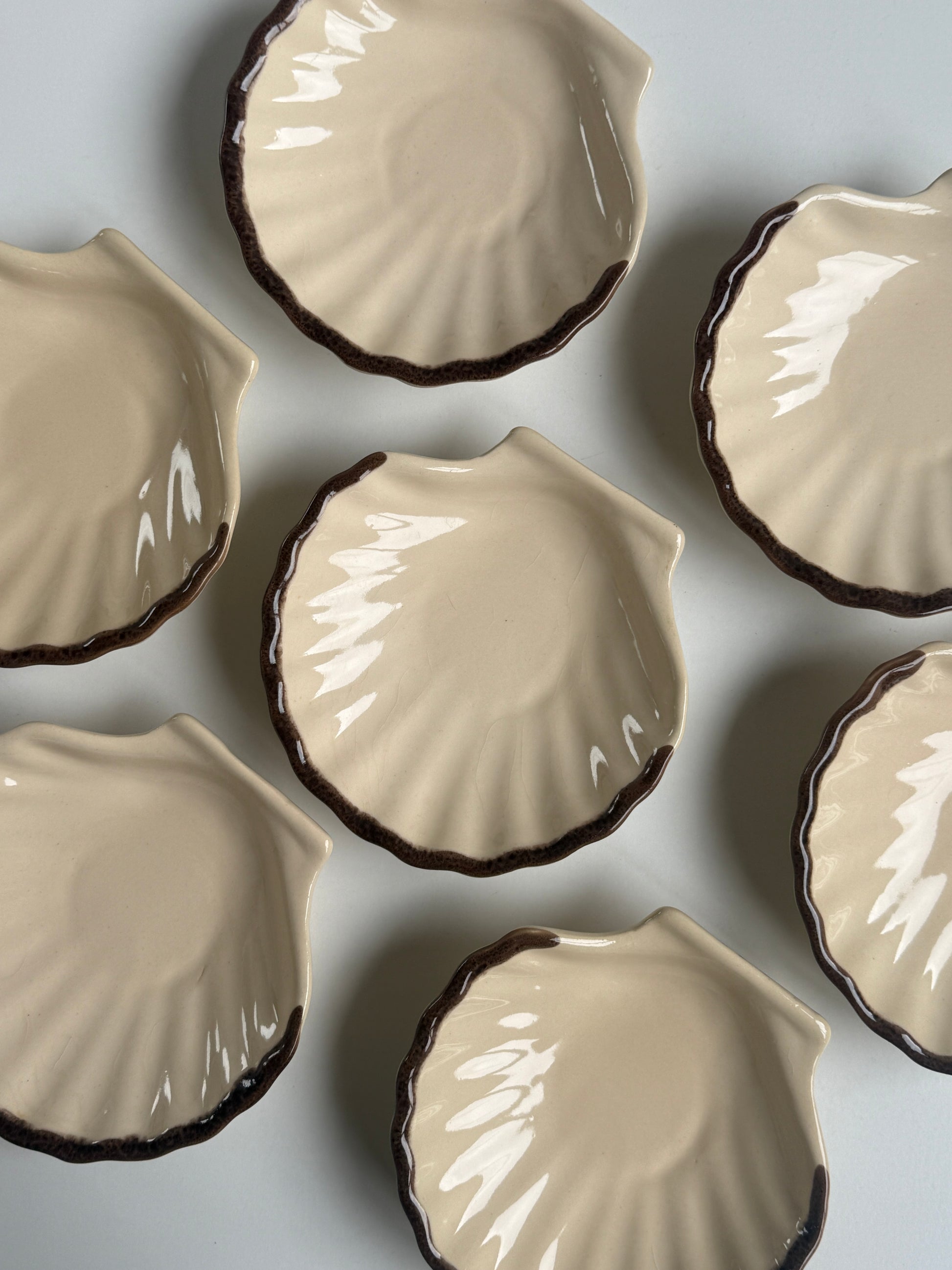 Smukke franske muslingeformede serveringsskåle fra Emile Henry, fundet i Alsace. Skålene er fremstillet af højbrændt burgundisk ler, og har den klassiske Coquille Saint-Jacques-form i varm beige med brun kant, som giver et autentisk, rustikt fransk udtryk. Perfekte til servering af skaldyr, små forretter, desserter eller som dekorative fade.