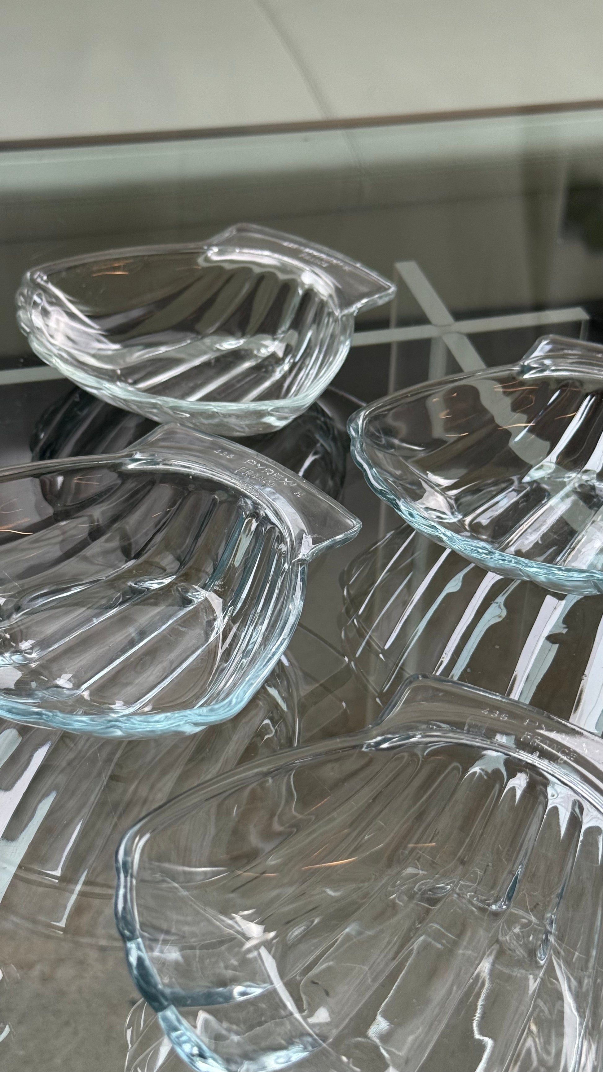 Smukke glasmuslingeskåle i klart glas med bløde, bølgende former inspireret af havets muslinger. Skålene har et elegant og tidløst udtryk, hvor glasset fanger lyset flot og giver et let, dekorativt spil på bordet.