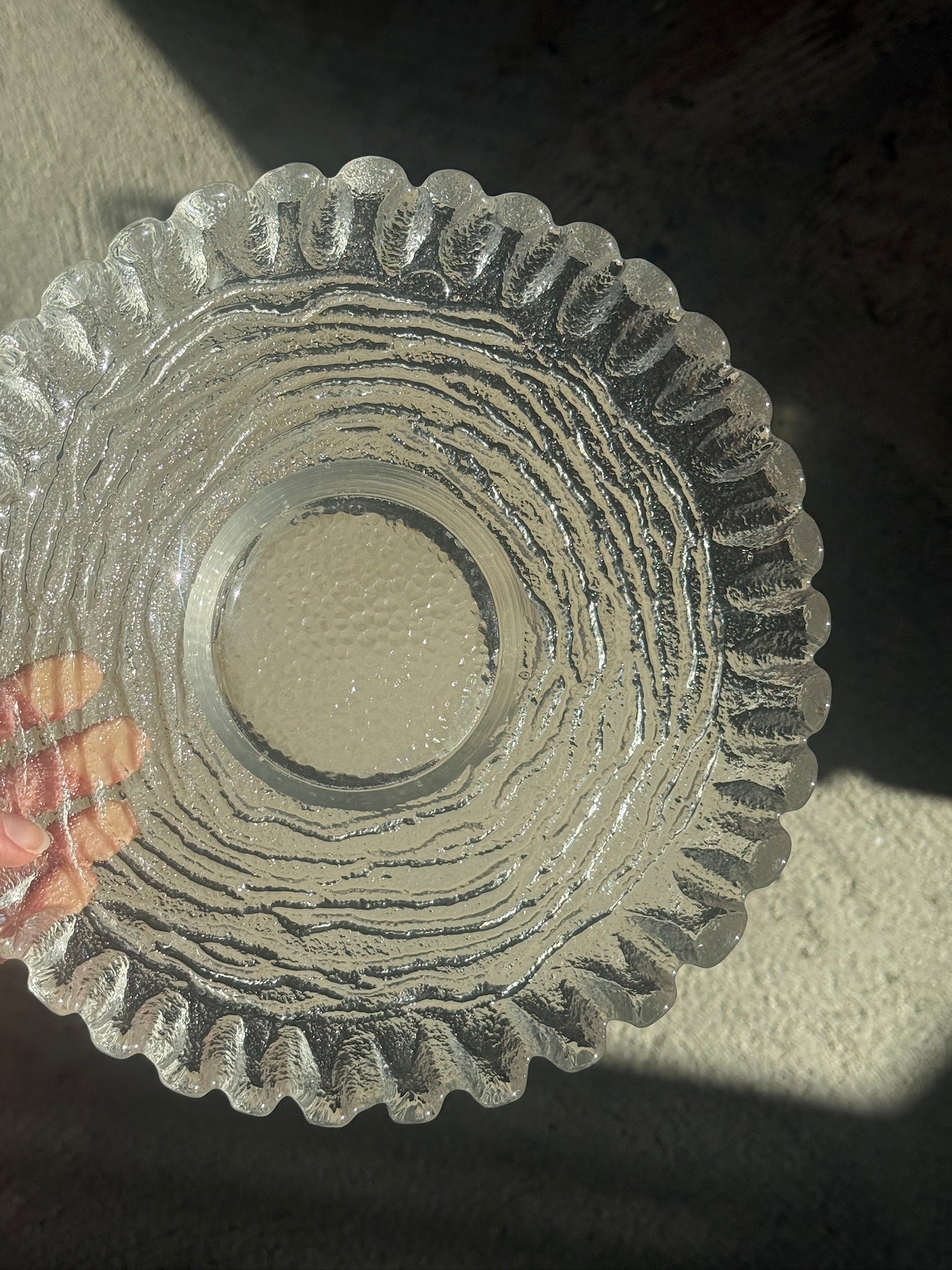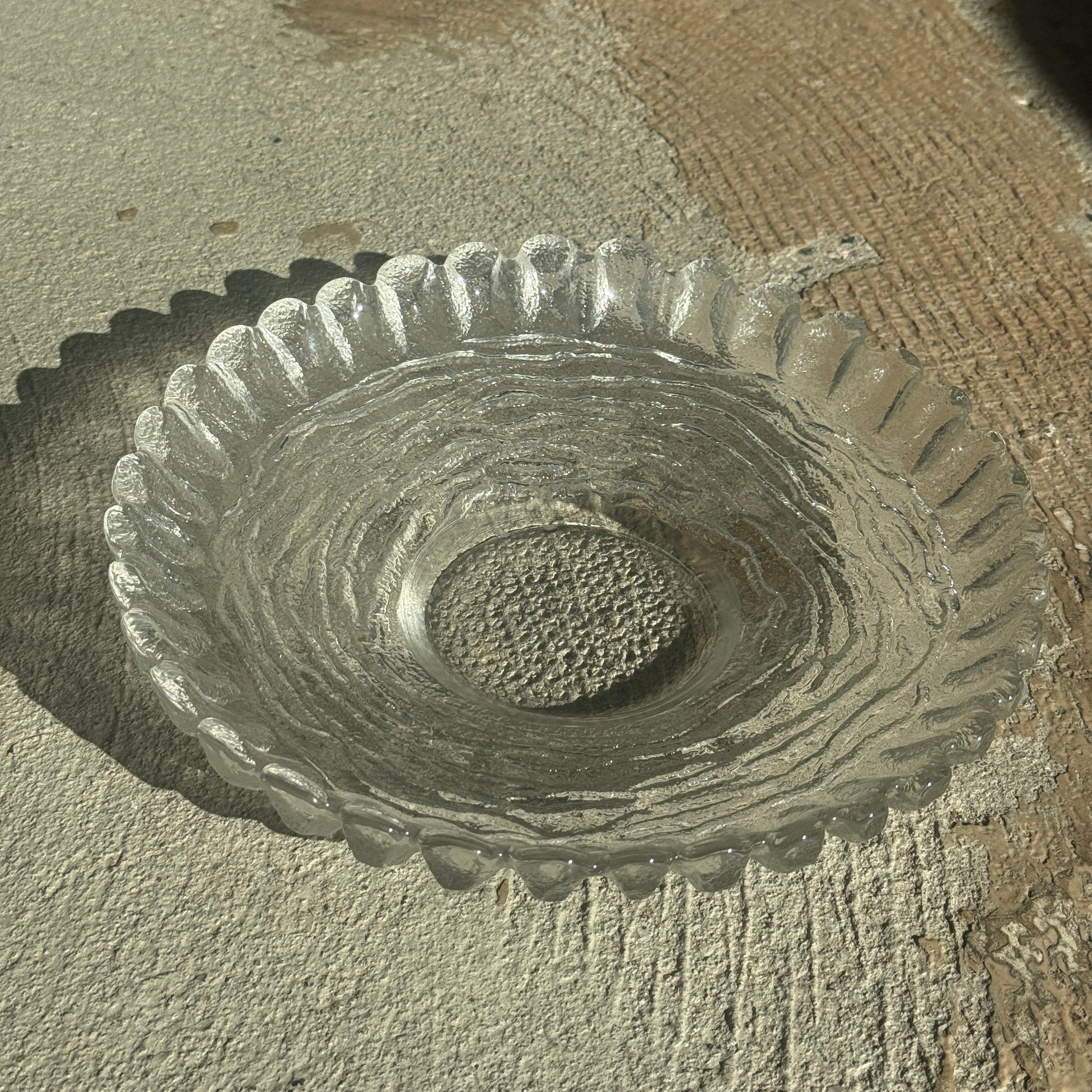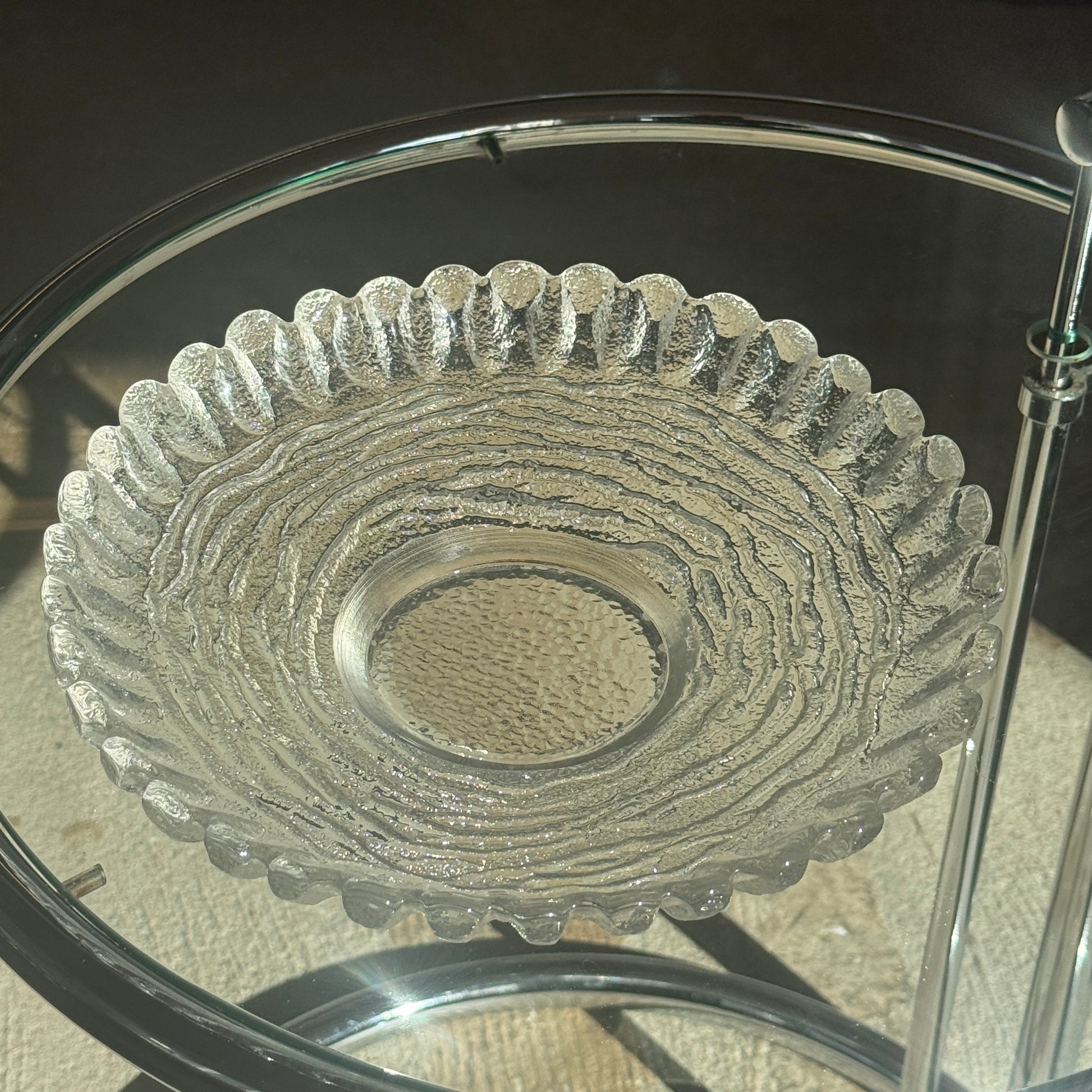 Stort glasfad fra norske Magnor, udført i krystal glas med dekorativt mønster, der ligner en solsikke. Designet giver et smukt spil i lyset og gør fadet både funktionel og dekorativ. Perfekt som serveringsfad, frugtskål eller som et markant element i indretningen.