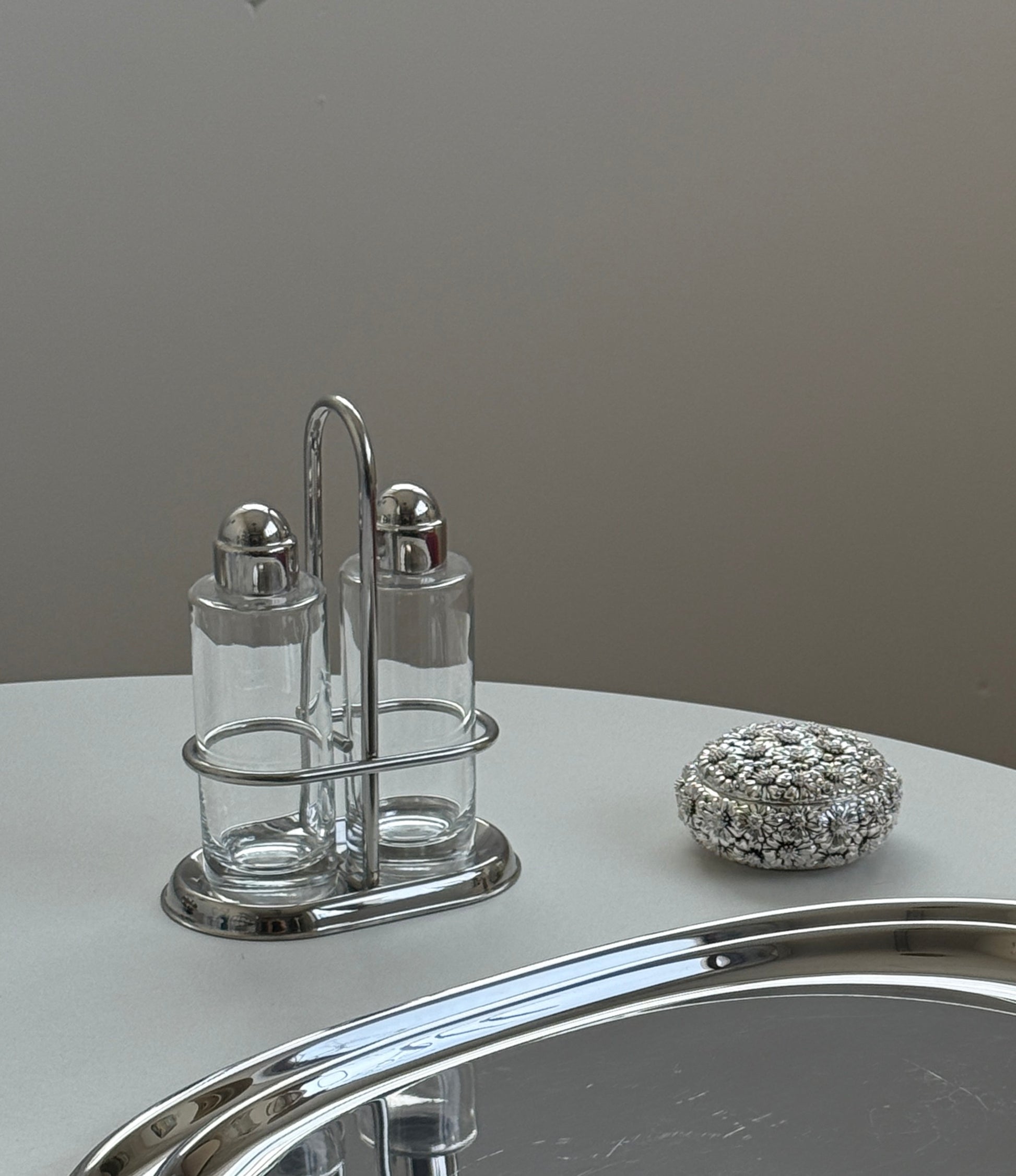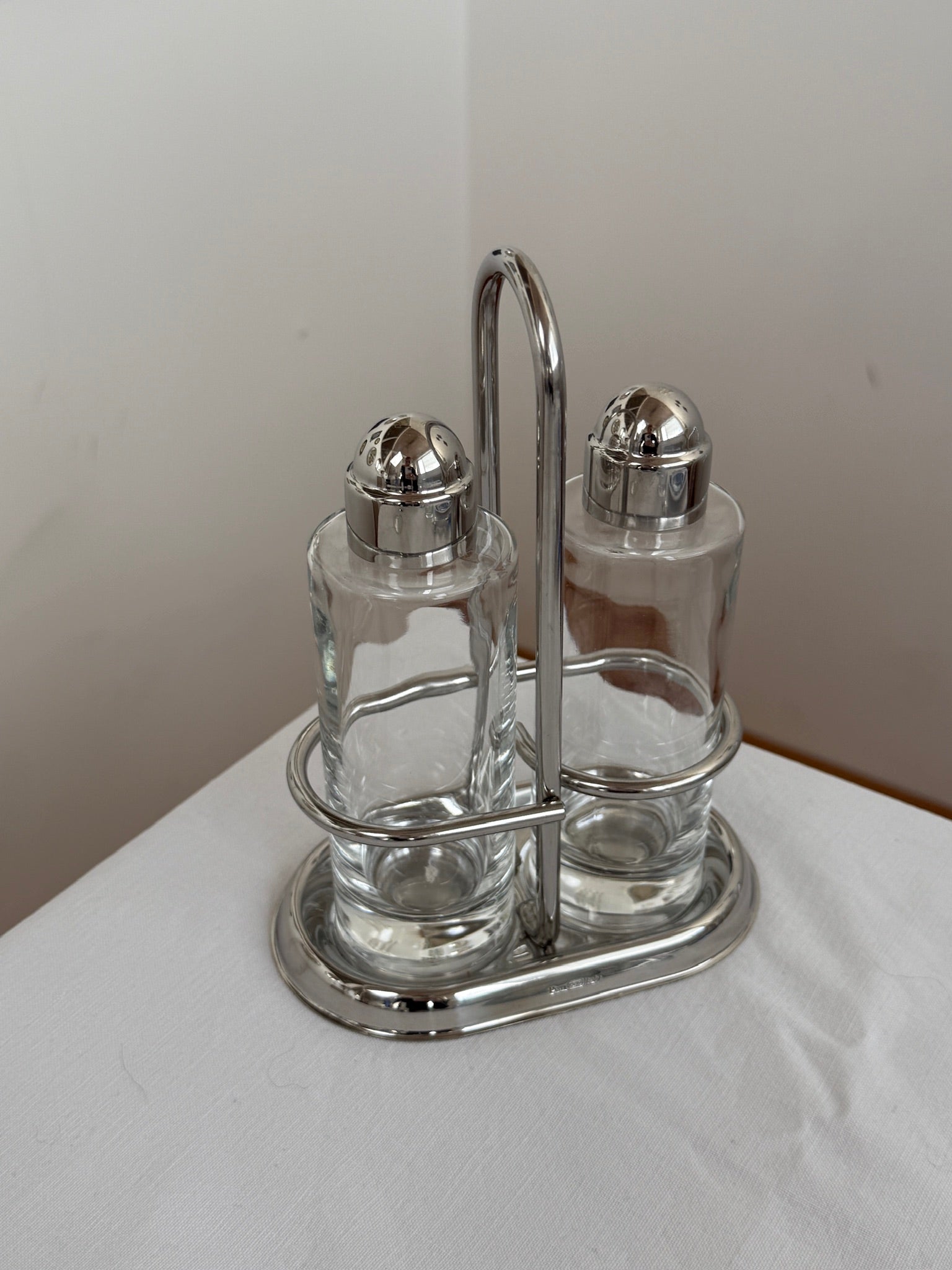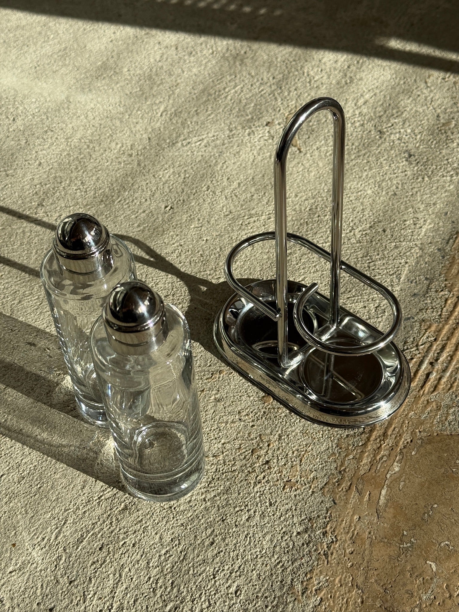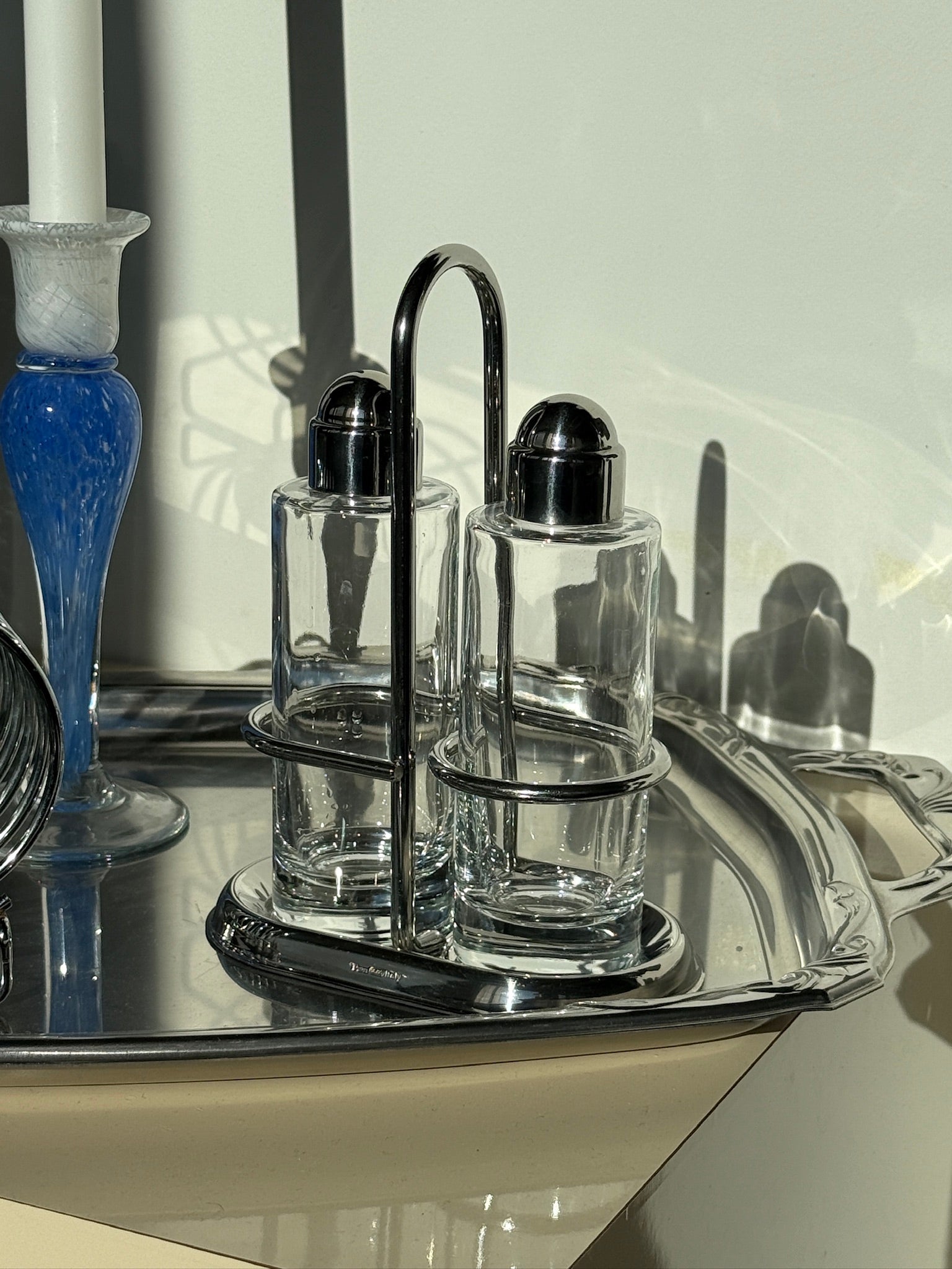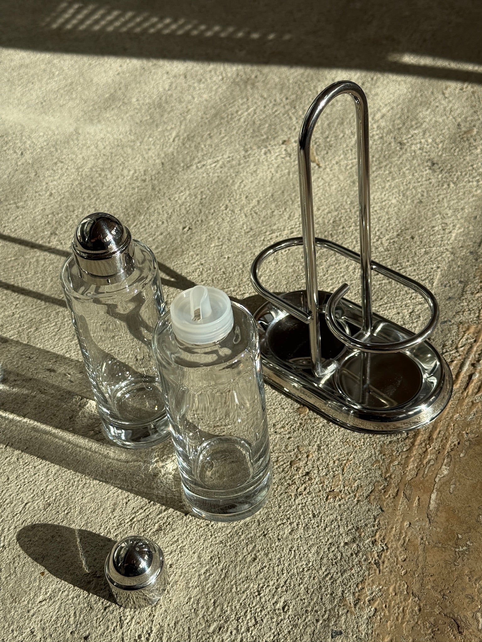 Sættet består af to glasflasker med elegante ståldesignede låg og tilhørende holder i blankpoleret stål.