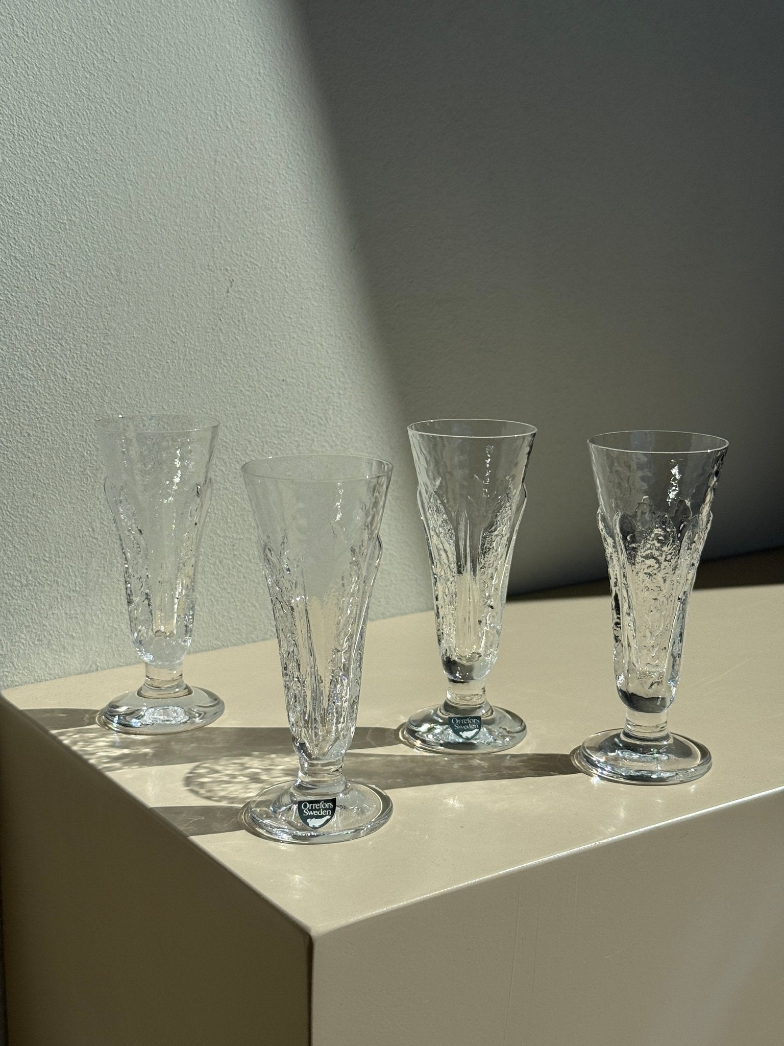 Sæt med fire smukke vintage snapsglas fra svenske Orrefors, designet af Lars Hellsten i serien Eden. Glassene har en organisk struktur, der giver en skulpturel, næsten frostsprængt overflade med masser af karakter. Formen er let tulipanformet med en solid fod, der giver et elegant og balanceret udtryk.