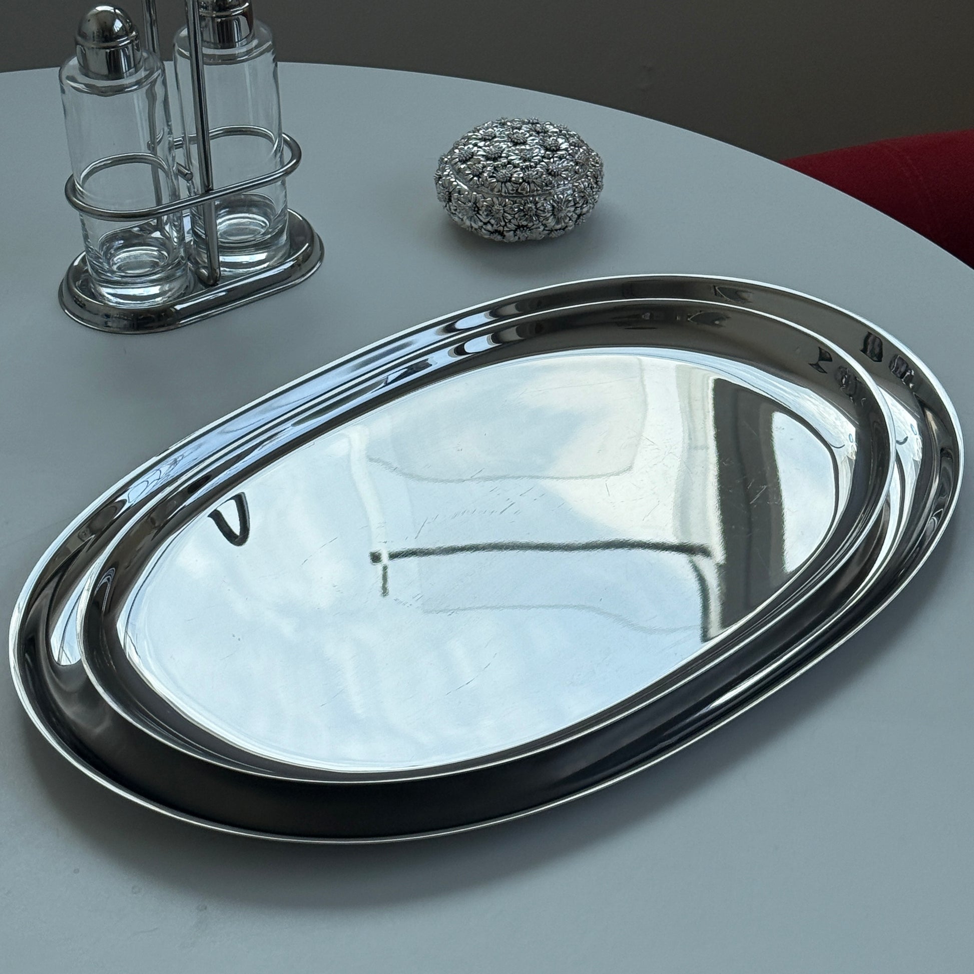 Sæt med to store ovale serveringsfade i rustfrit stål fra italienske Effepi. Fade i denne kvalitet og form er ideelle til servering af alt fra fisk og skaldyr til kødretter og salater. Det enkle og tidløse design gør dem velegnede både til hverdagsbrug og festlige anledninger.