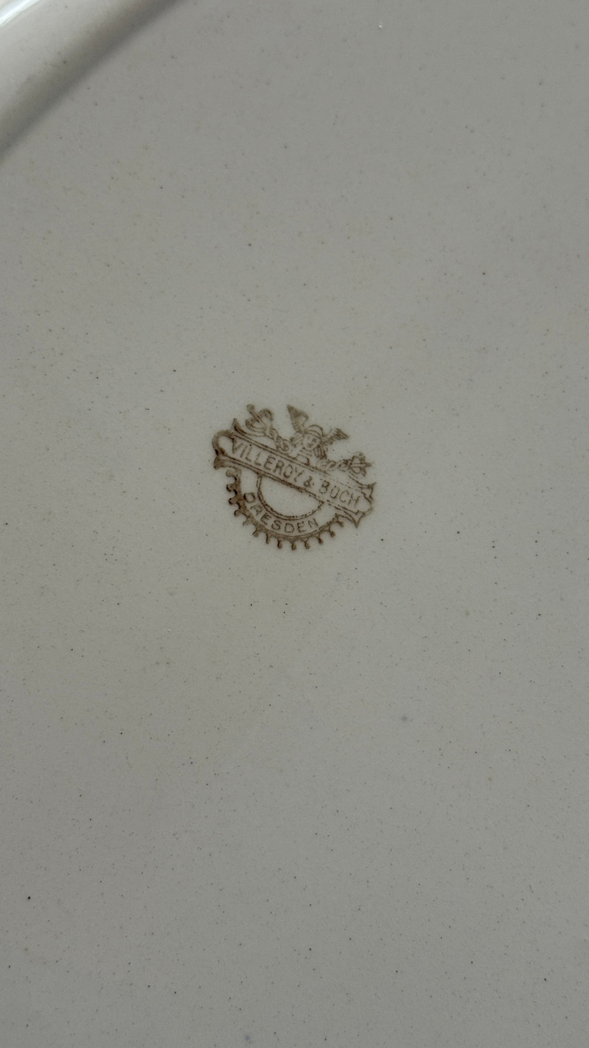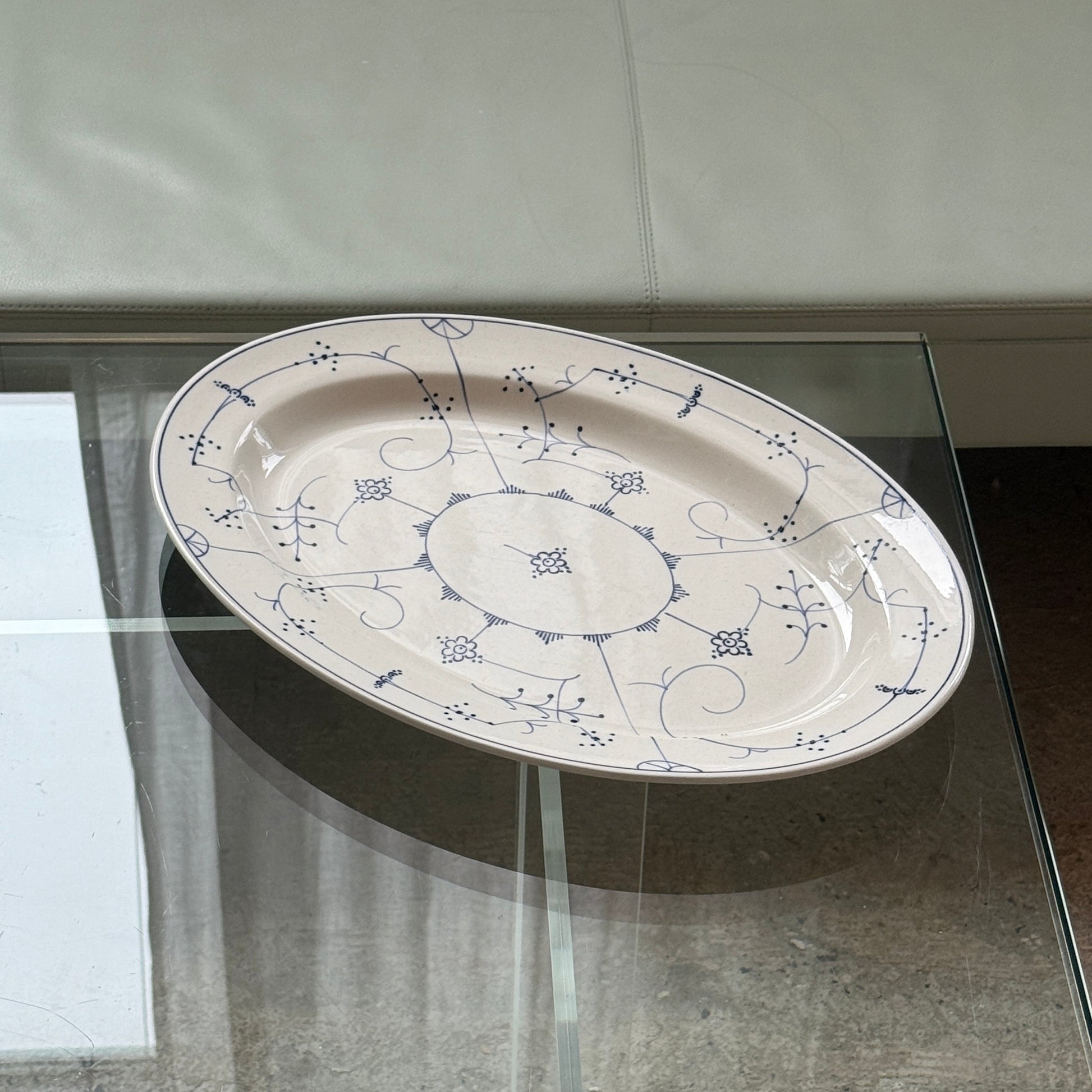 Stort, ovalt serveringsfad fra Villeroy & Boch, Dresden, dekoreret med et fint blåt ranke- og blomsterornament på lys bund. Et klassisk og elegant fad med god størrelse, der egner sig perfekt til servering af steg, fisk, salater eller som smukt midtpunkt på bordet.