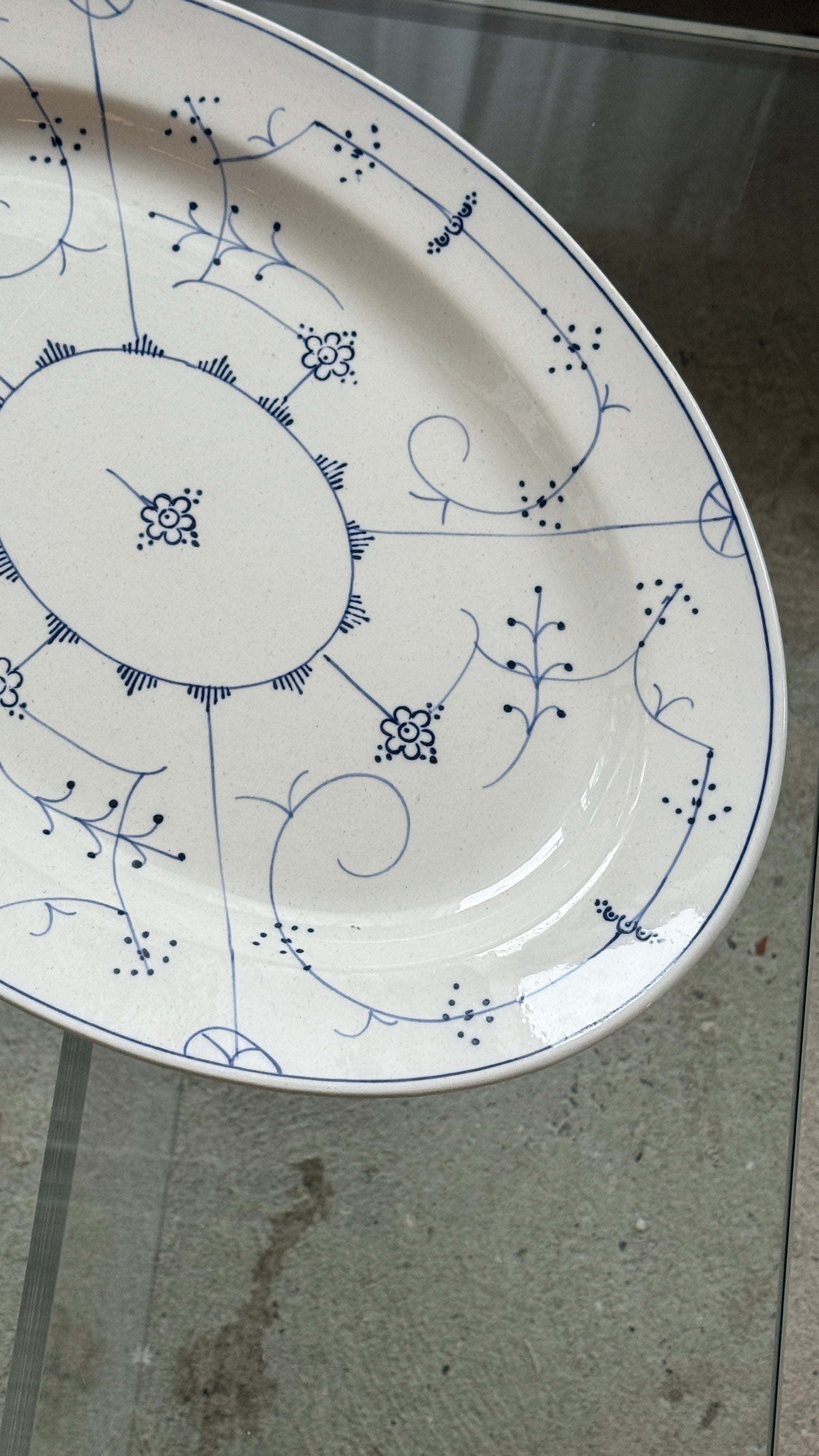 Det håndtegnede udtryk i dekorationen giver fadet lethed og charme, og det passer fint ind i både klassiske og mere afslappede borddækninger.
