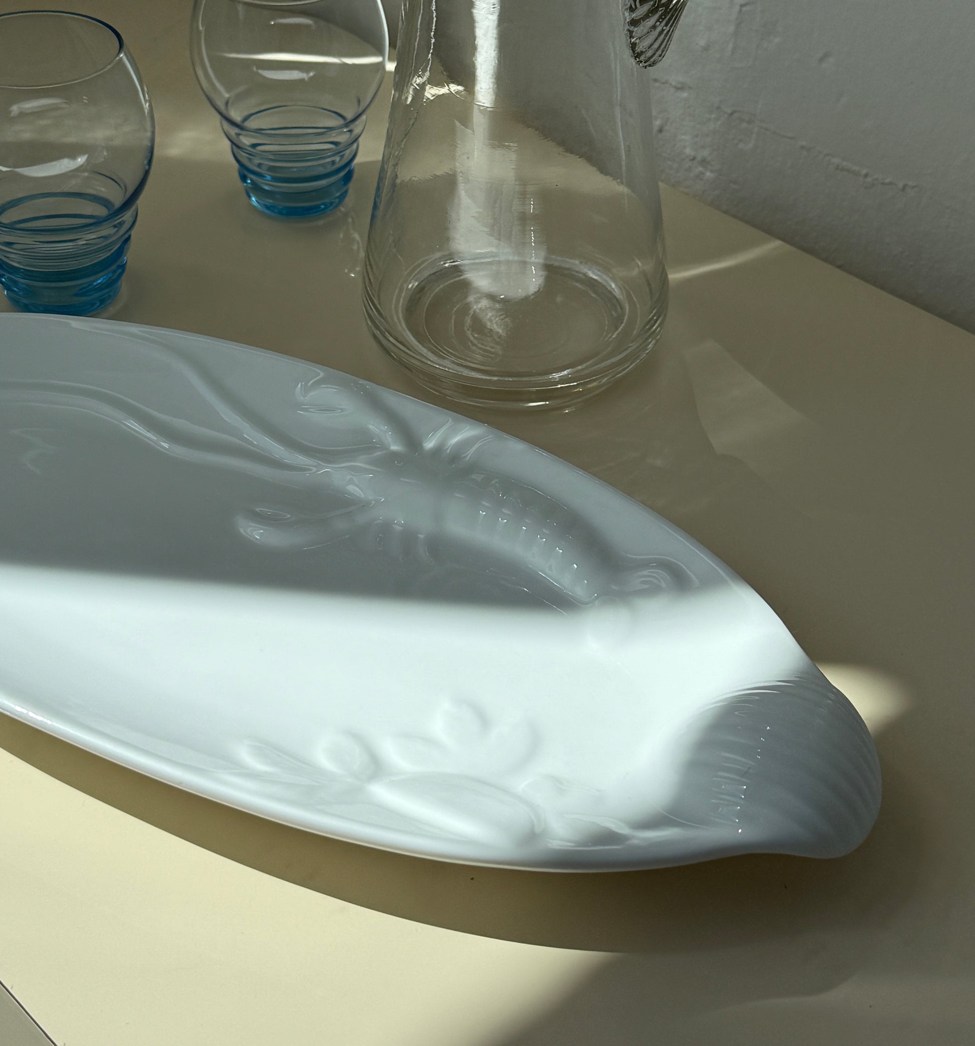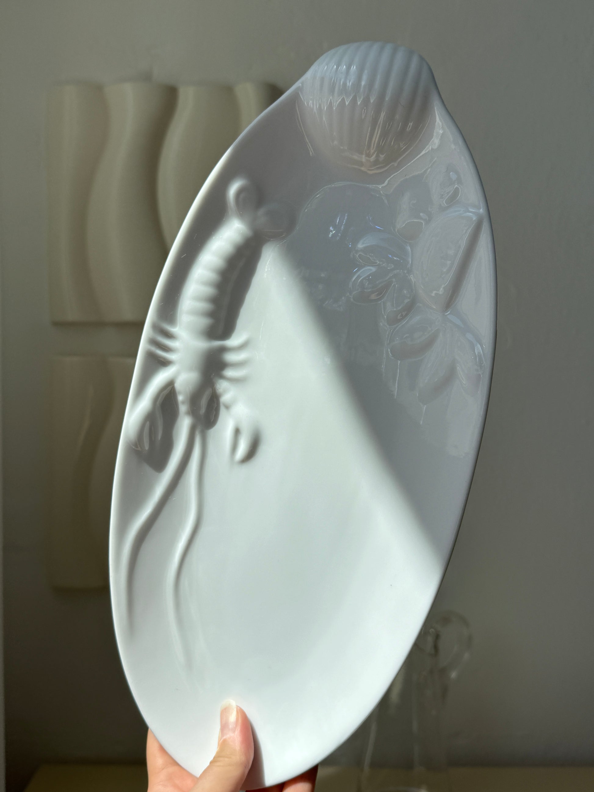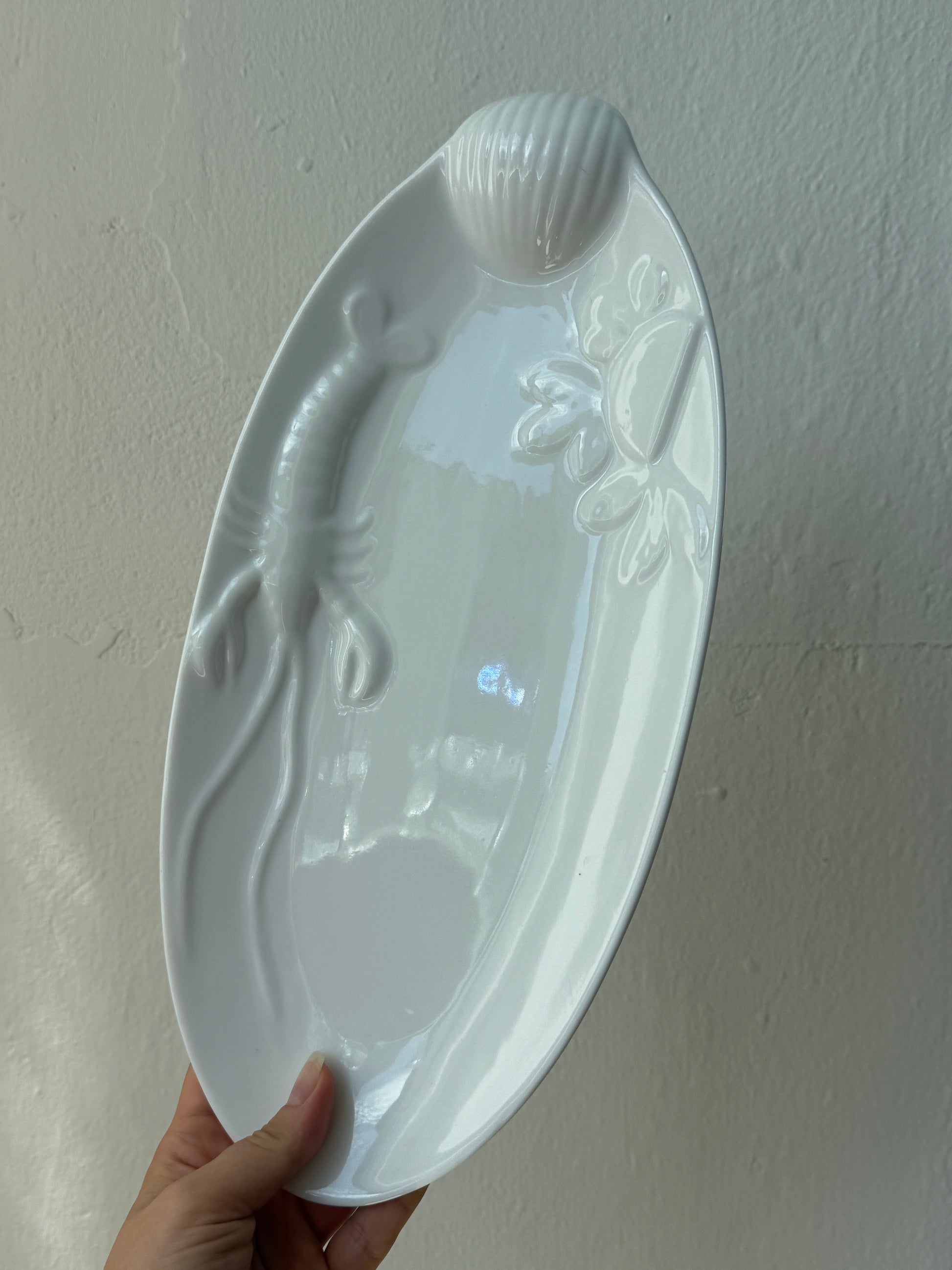 Elegant og detaljeret skaldyrsfad i hvid glaseret keramik med motiv af en musling, jomfruhummer og citron. Den aflange, ovale form gør det oplagt til servering af skaldyr, fisk, forretter eller tapas. Fundet i Italien.