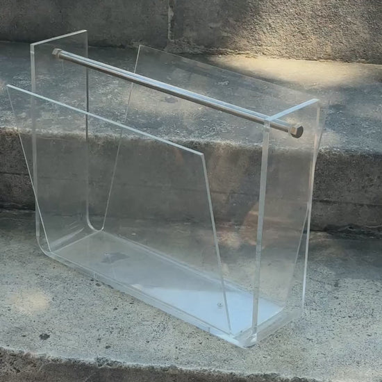 Vintage magasinholder i klar plexiglas med håndtag i metal, designet af David Lange for Roche Bobois i 1970’erne. Et ikonisk stykke fransk design, der kombinerer funktionalitet og et elegant, minimalistisk udtryk. Perfekt til opbevaring af magasiner, aviser eller bøger, hvor den transparente konstruktion giver et let og tidløst look.