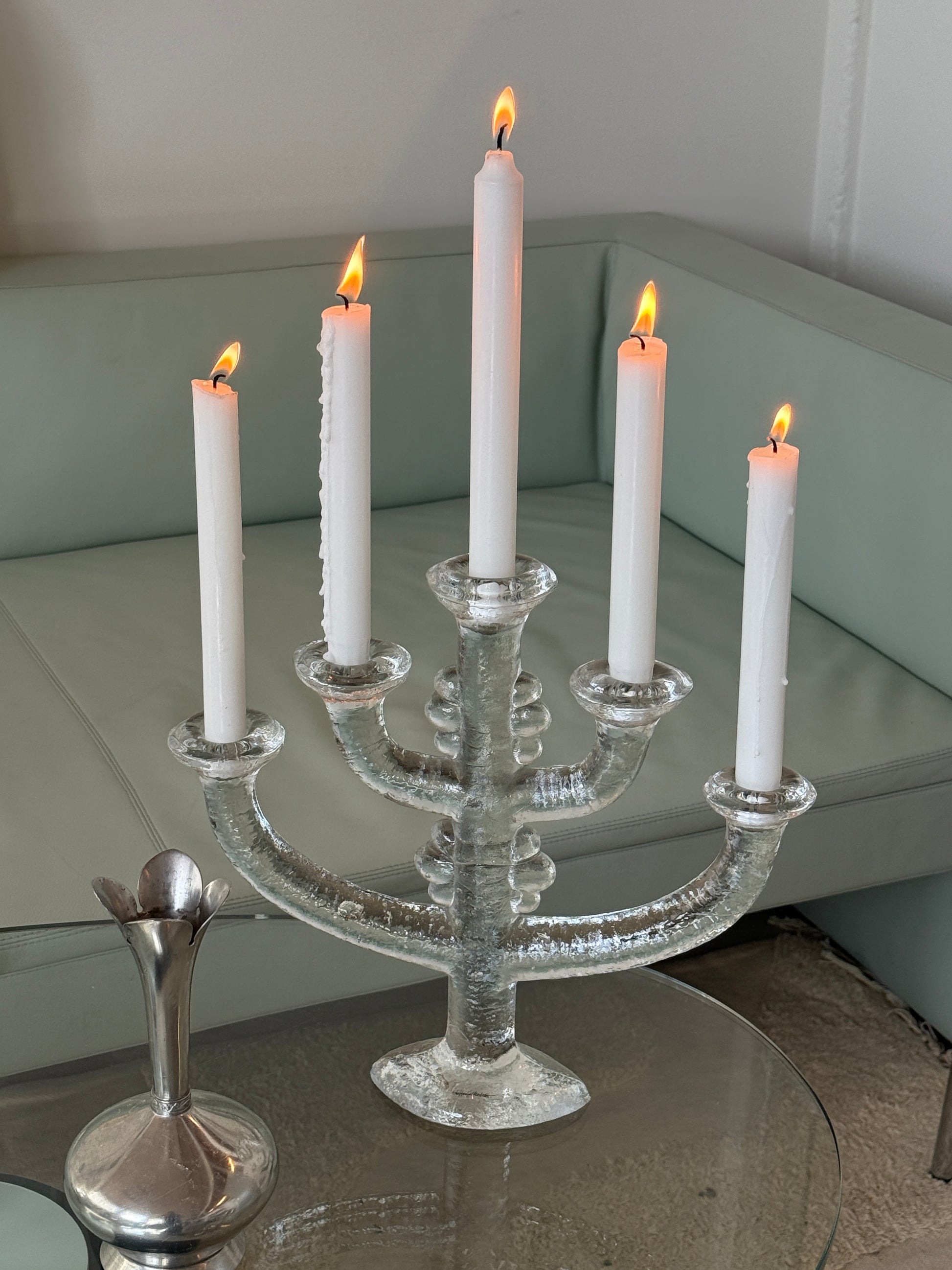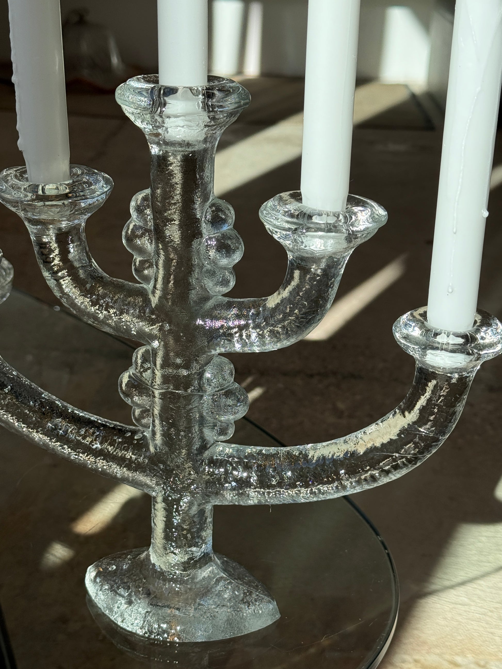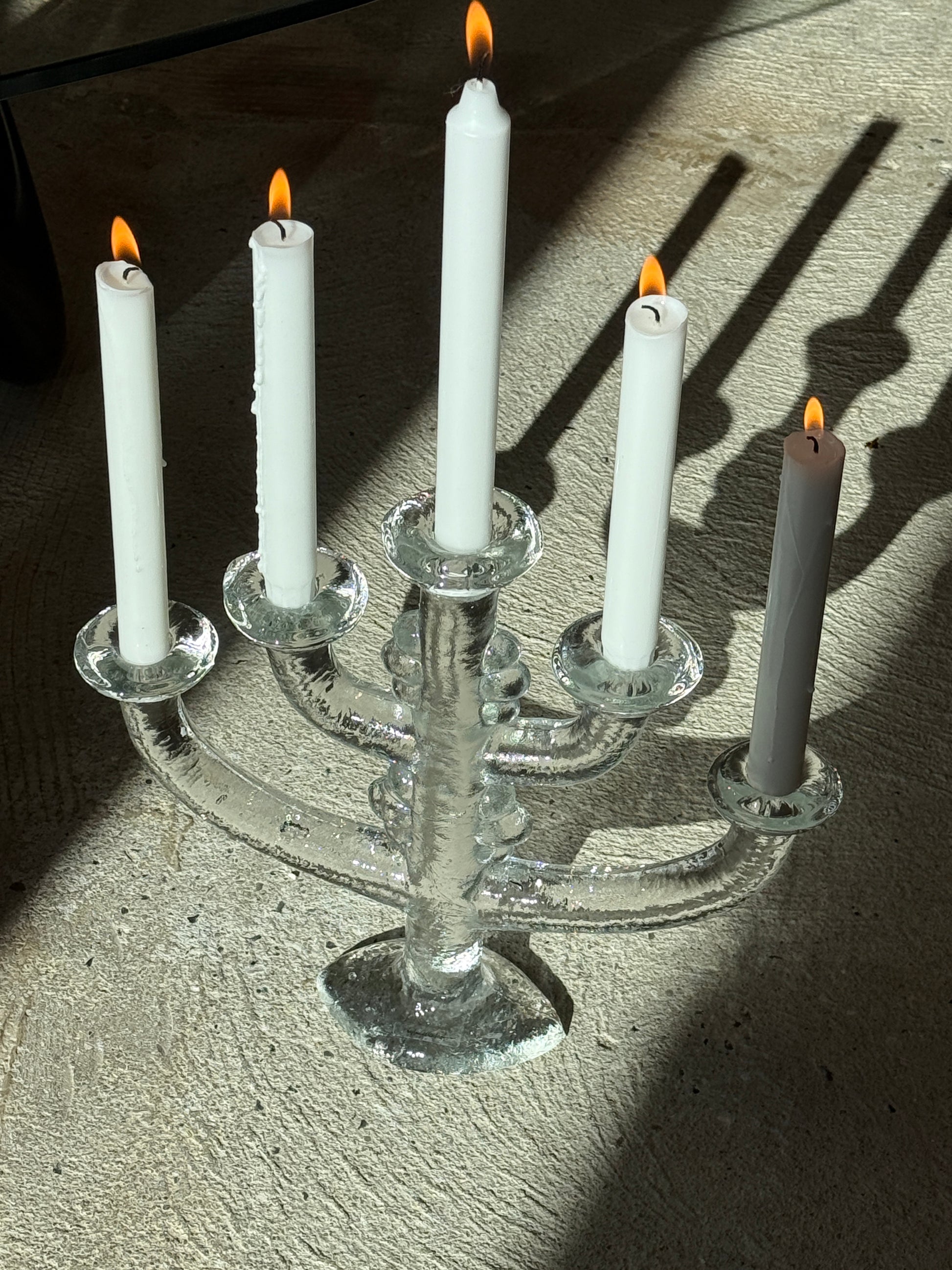 Kandelaberen er udført i kraftigt, struktureret klart glas med fem arme og en solid fod, der giver et skulpturelt og tidløst udtryk. Den isede overflade reflekterer lyset smukt og skaber en stemningsfuld glød, når lysene er tændt.