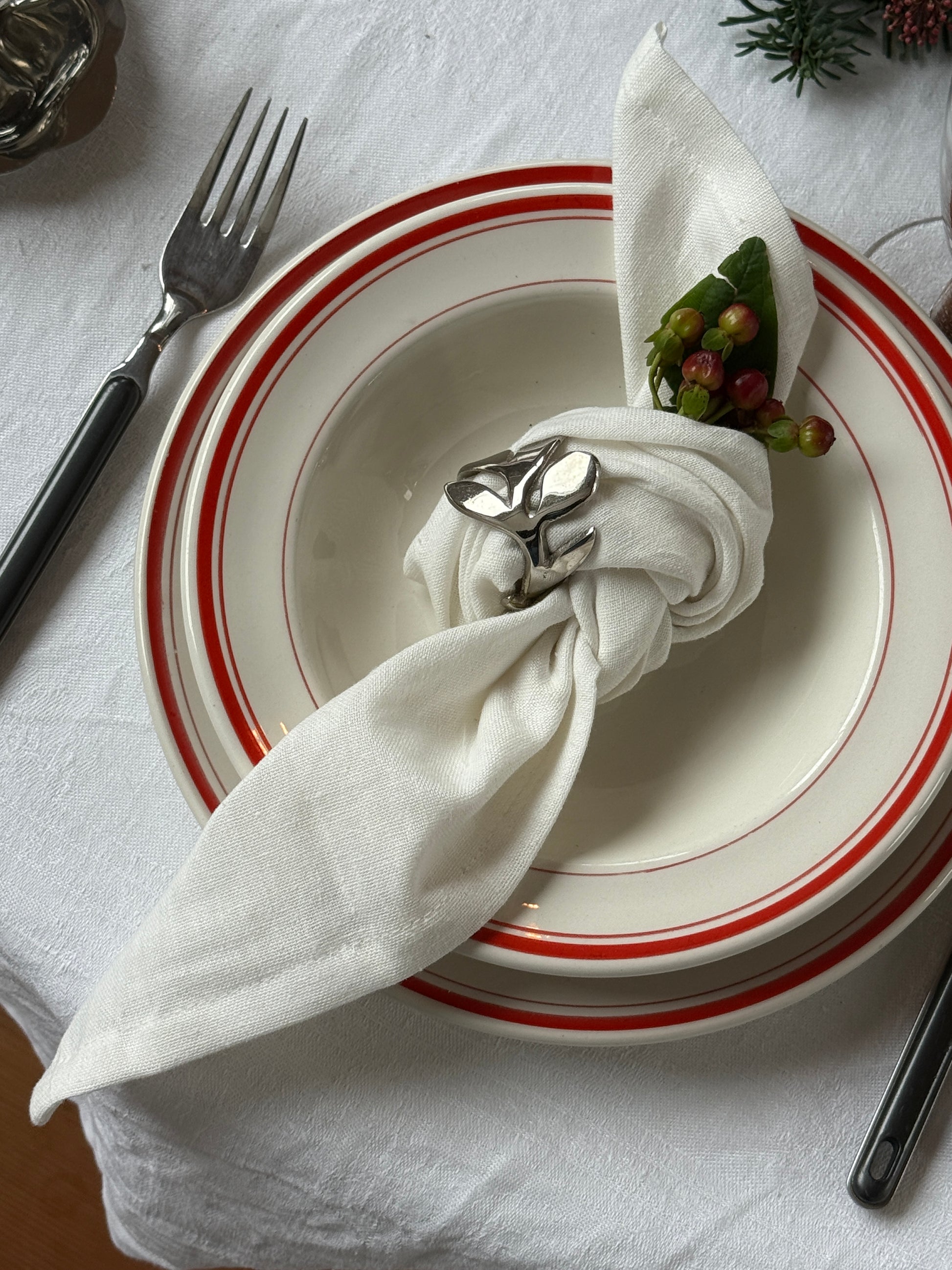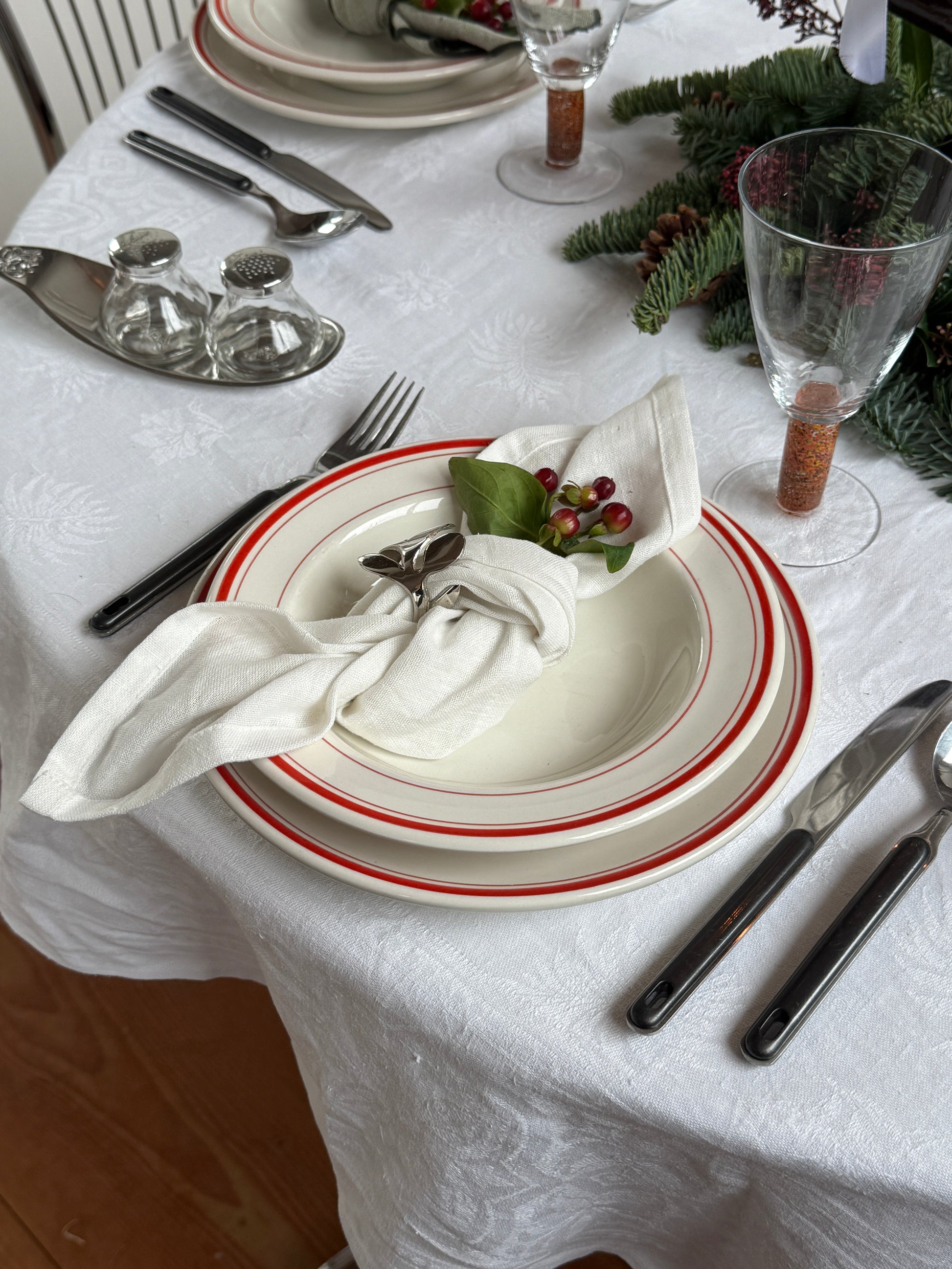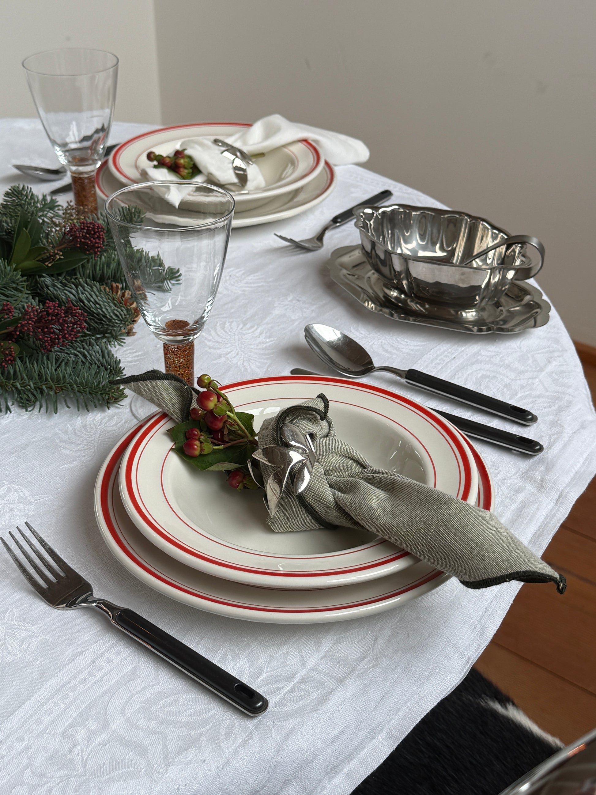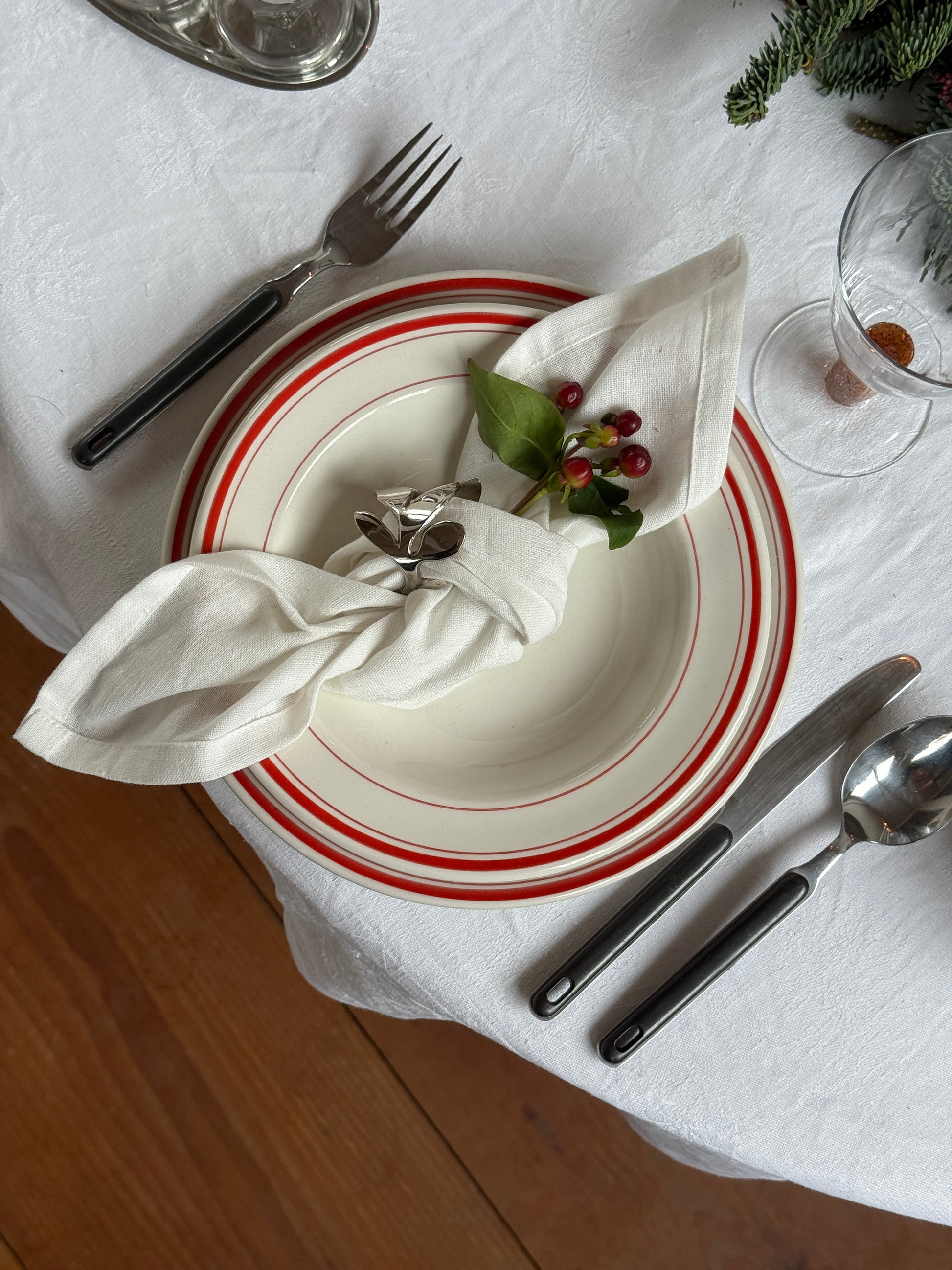 Den cremefarvede bund med den røde dobbeltstribe giver et smukt, nostalgisk udtryk og gør stellet perfekt til både hverdagsbordet og den dækkede julemiddag.