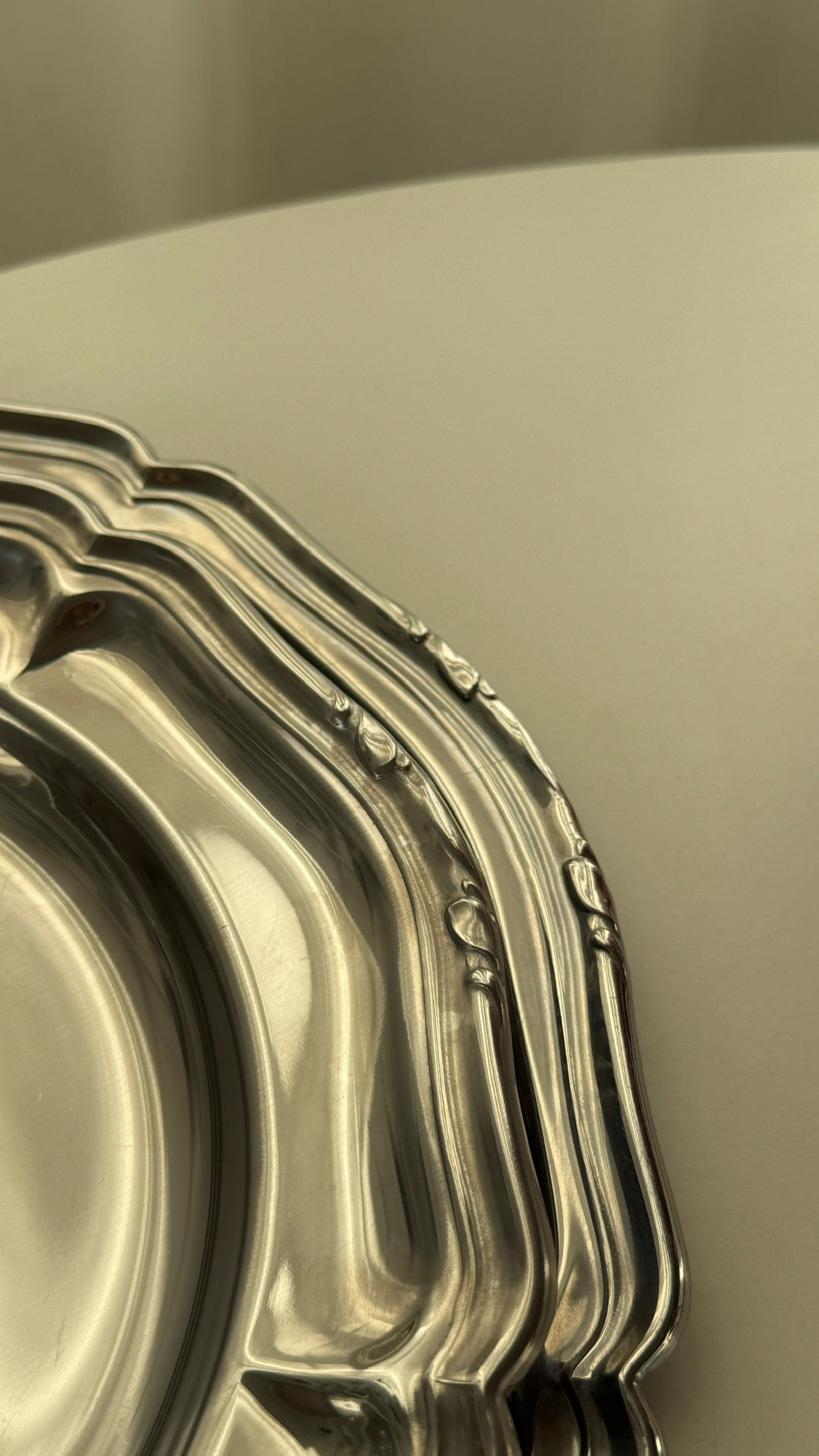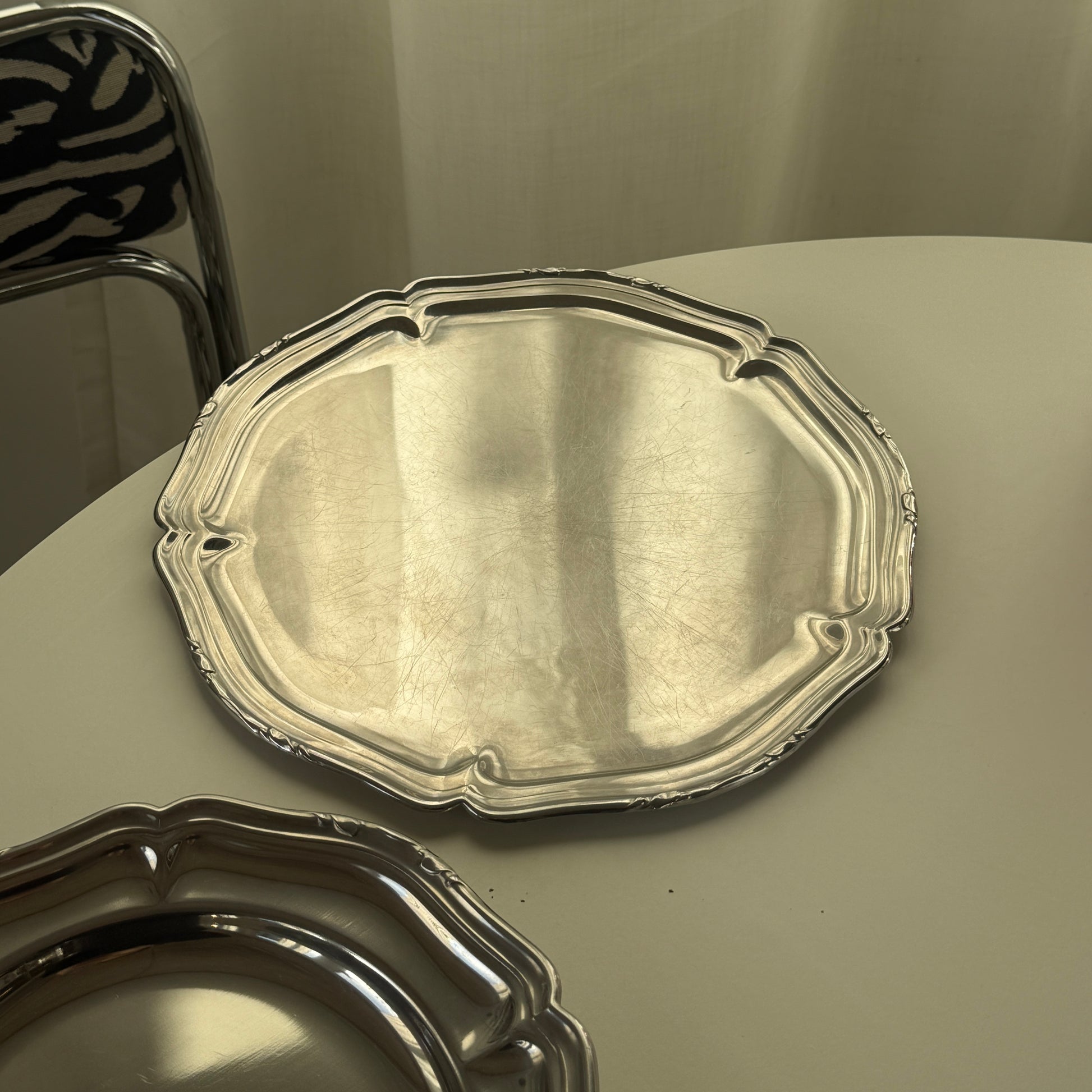 Smukt sæt bestående af to runde serveringsfade i rustfrit stål med elegant og dekorativ kant. Det blanke stål og de fine detaljer giver fadene et klassisk udtryk, som fungerer både til servering og som dekorative elementer på bordet.