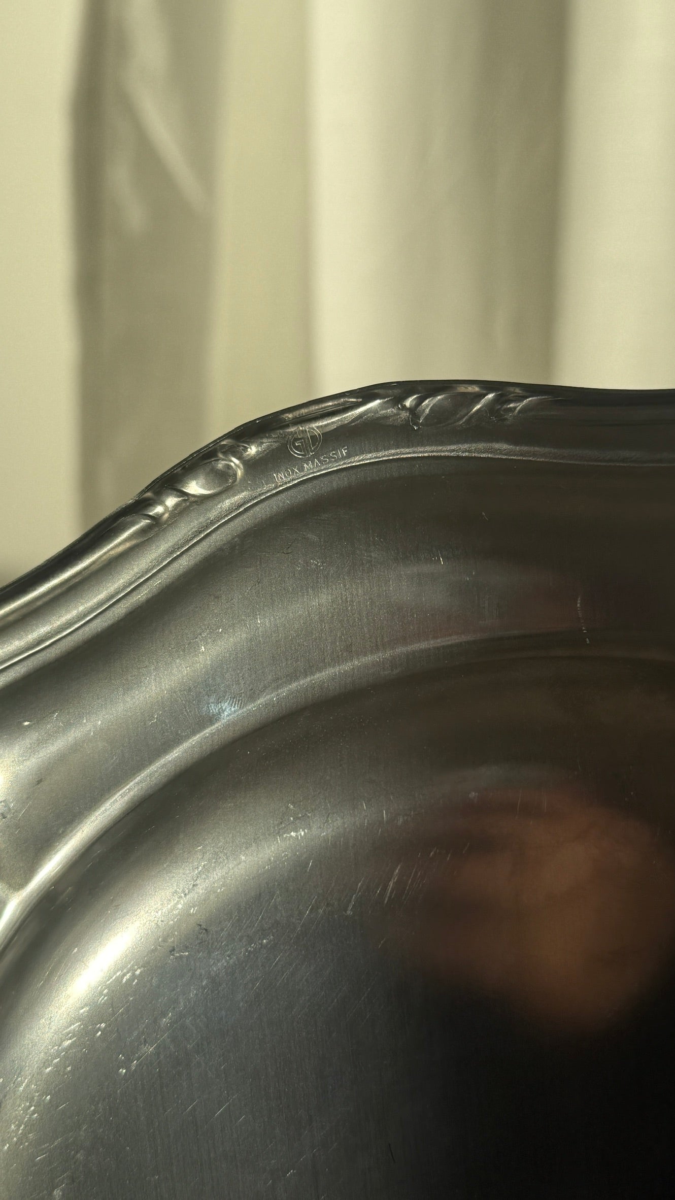 Det ene fad har flere brugsspor på overfladen end det andet, hvilket ses ved tættere kig. Begge fade fremstår dog med et flot helhedsudtryk og den patina, man forventer af brugt rustfrit stål.