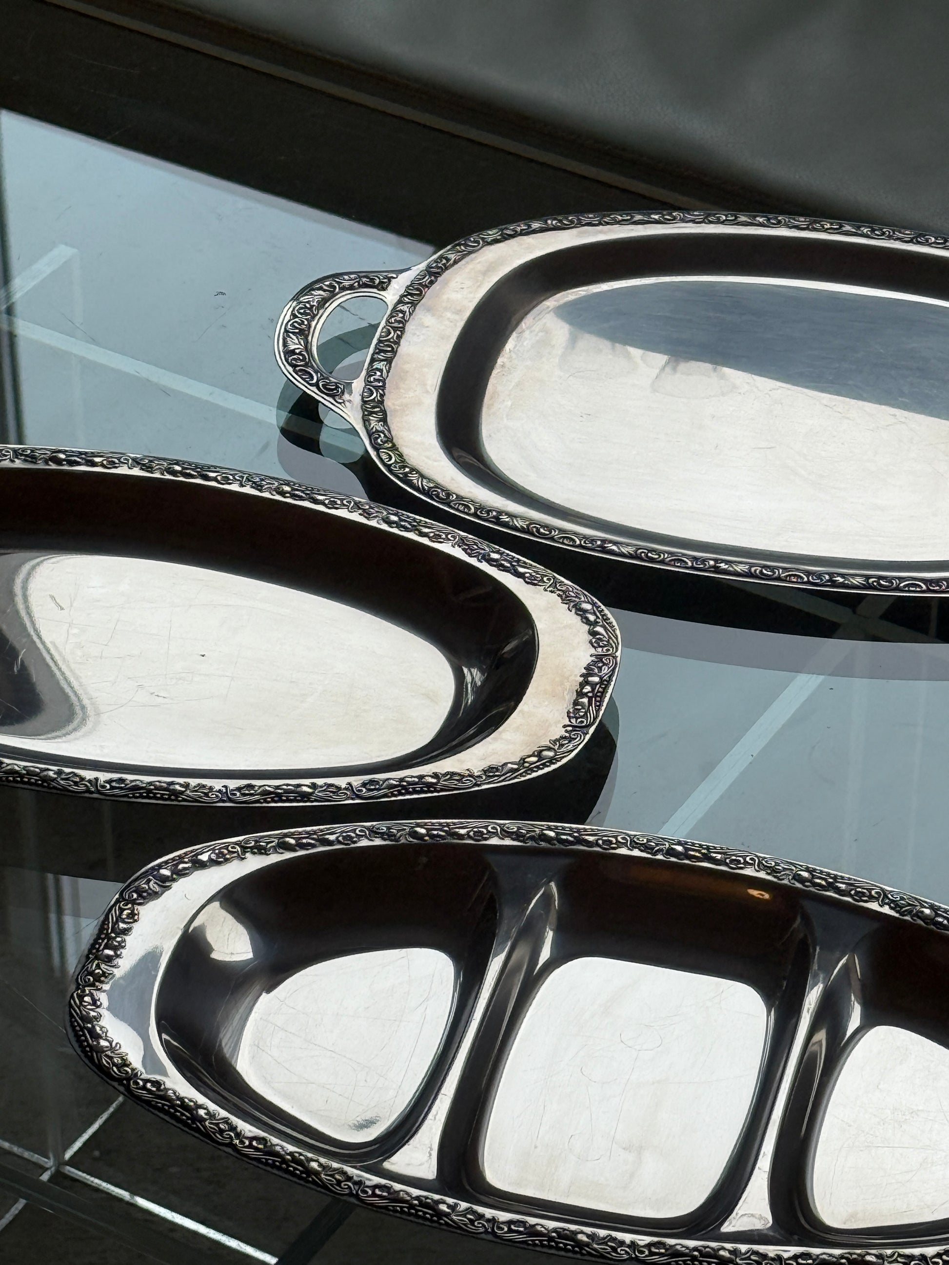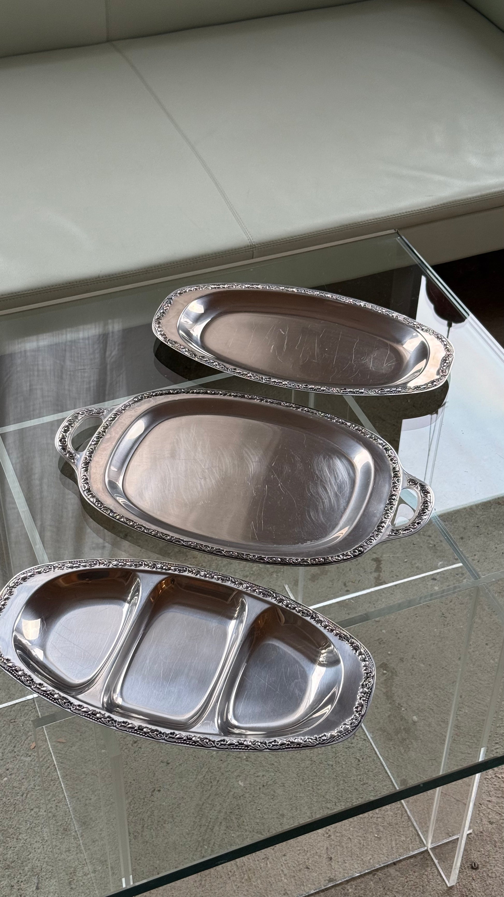 Elegant sæt med tre serveringsfade i rustfrit stål med smuk, dekorativ kant. Fadene har et klassisk og tidløst udtryk, hvor den blanke overflade kombineret med den fine ornamentering giver et eksklusivt præg – perfekt til både hverdag og festlige anretninger.