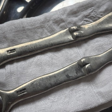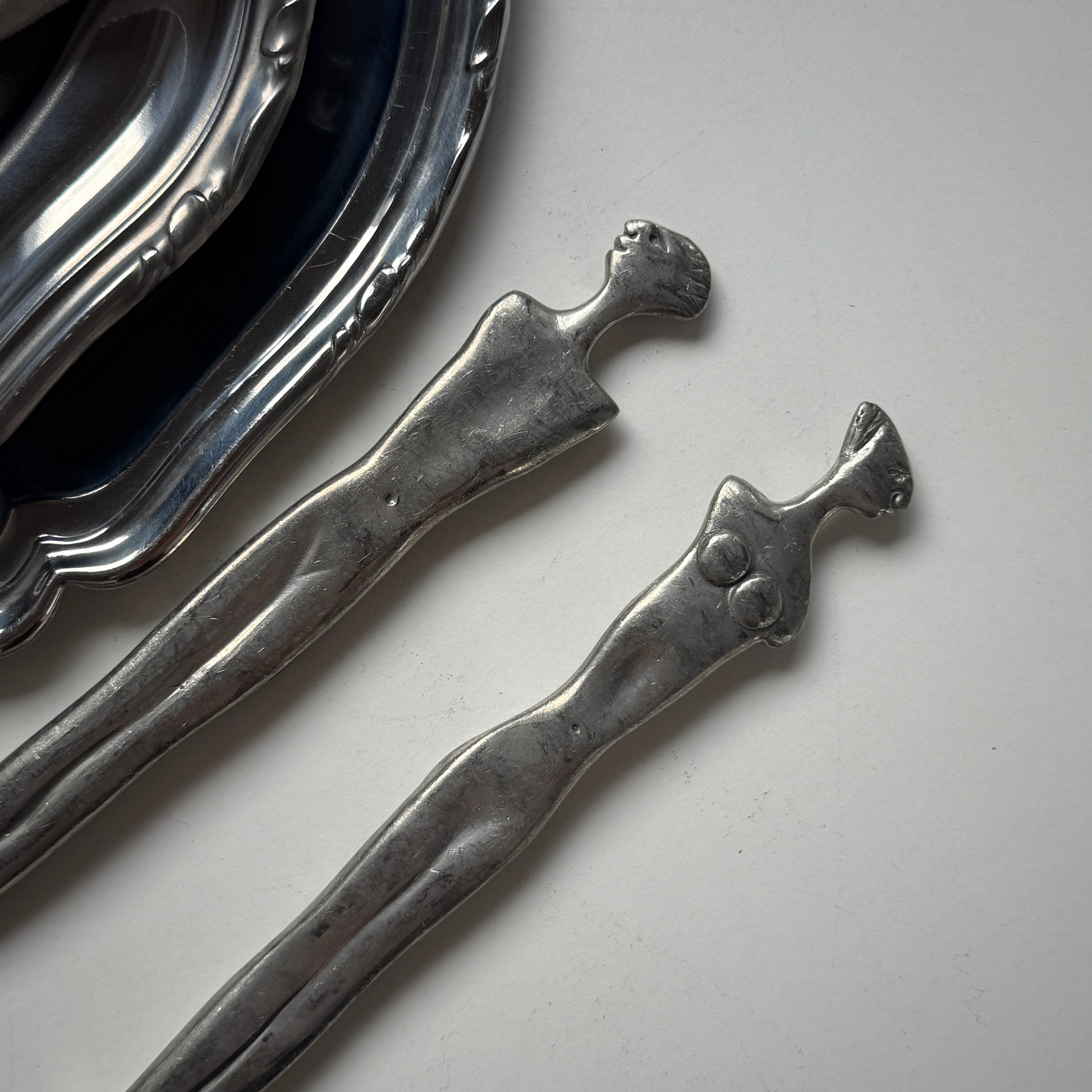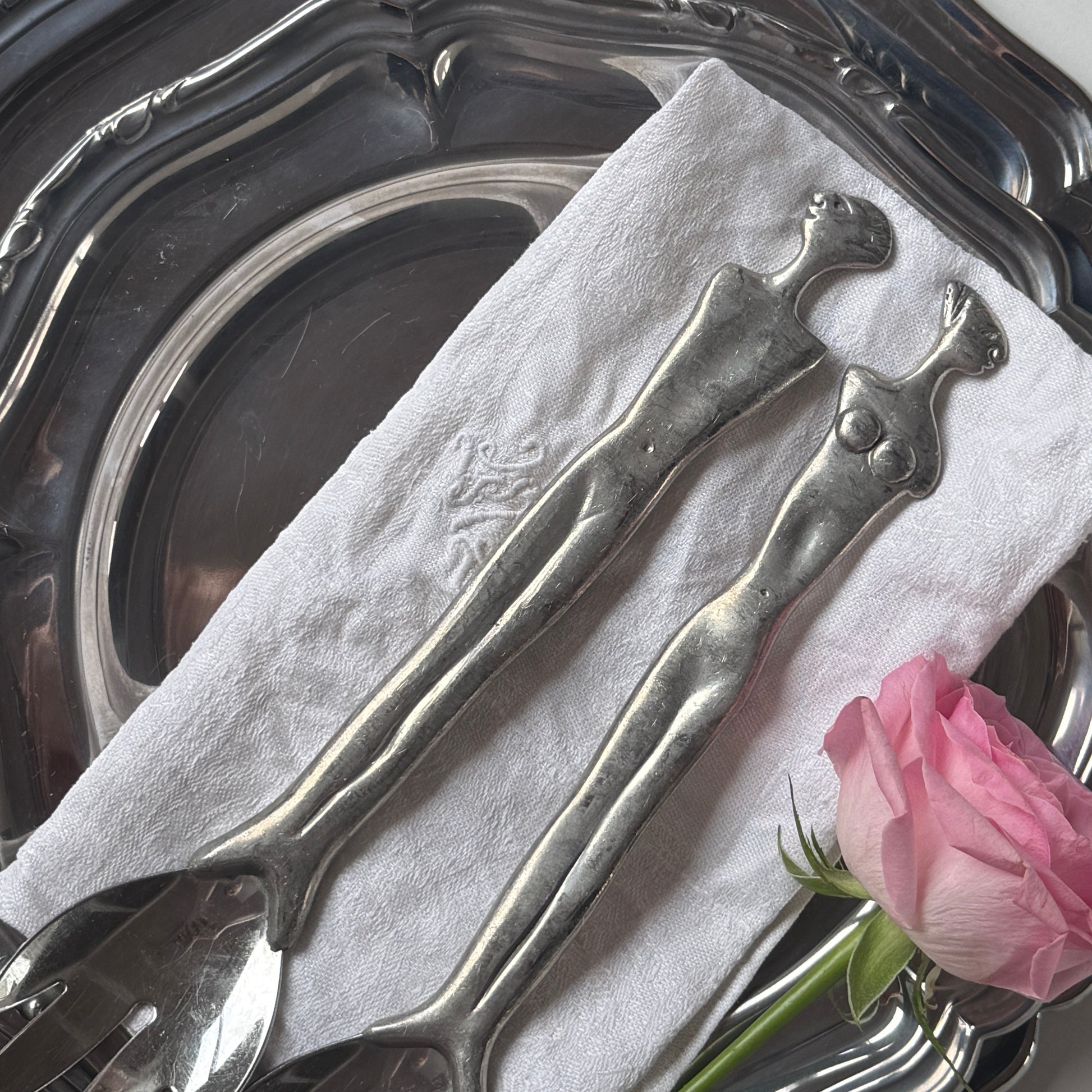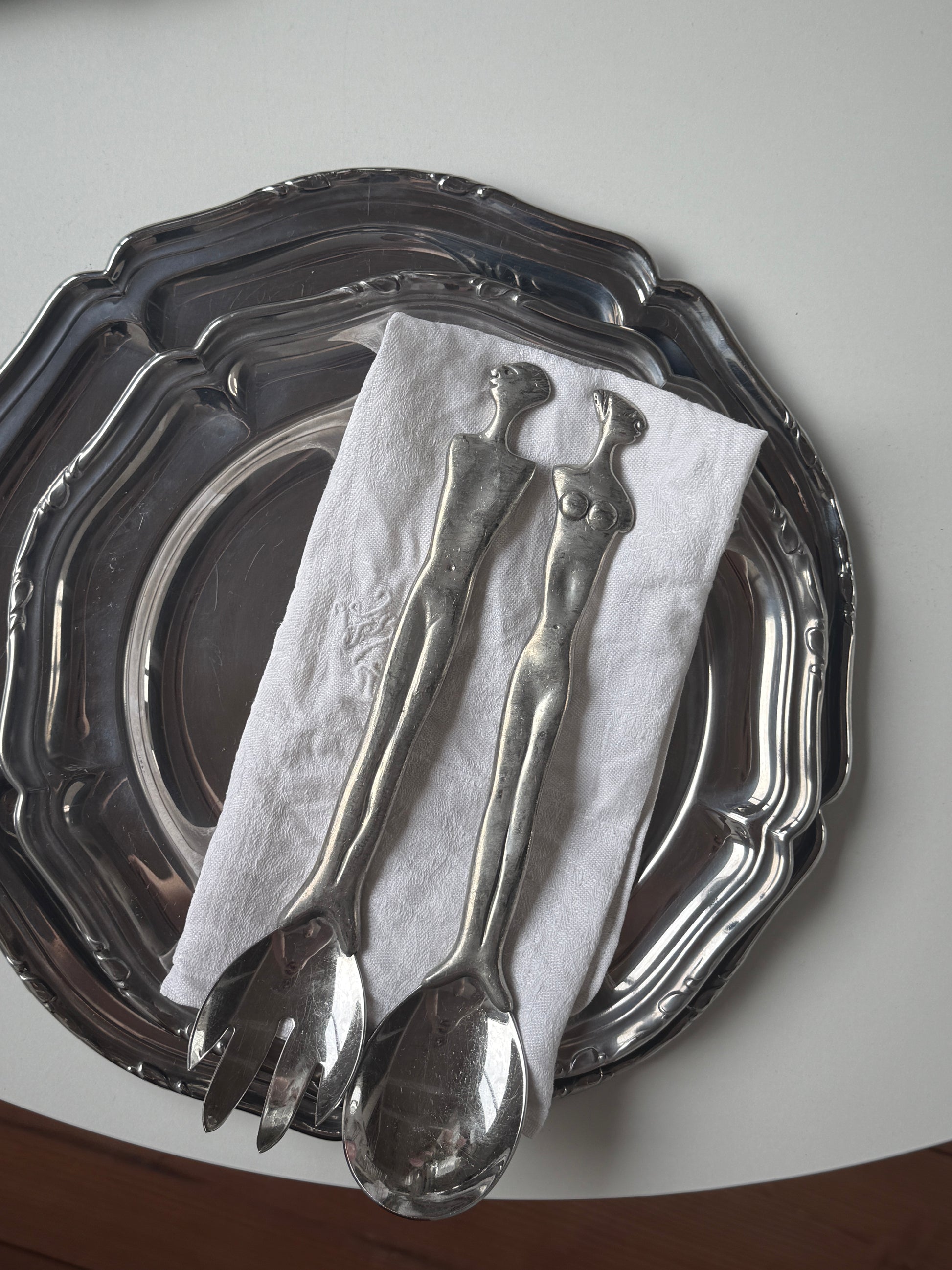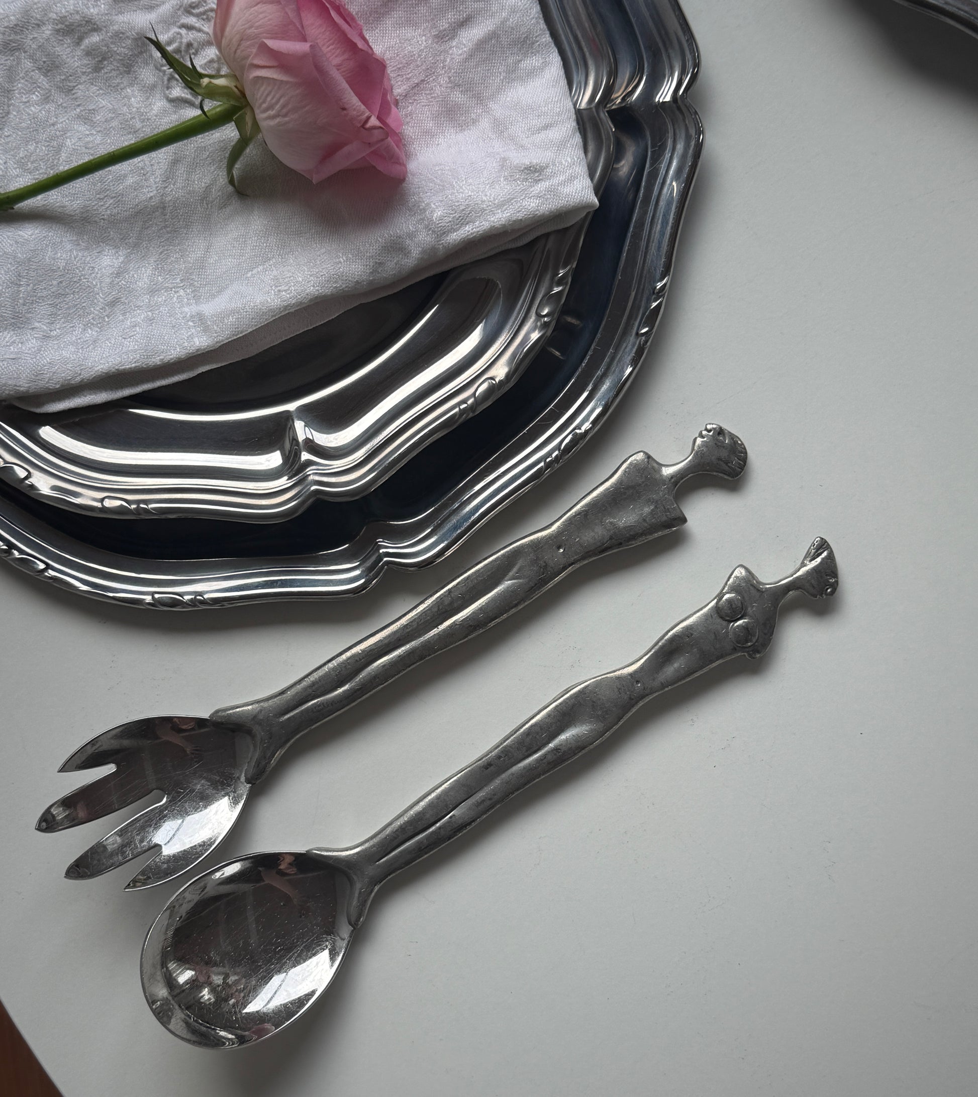 Unikt salatbestik i poleret tin fra Carrol Boyes, kendt for sine skulpturelle og humoristiske designs. Bestikket forestiller en mand og en kvinde i strakt form – et ikonisk og kunstnerisk udtryk, der gør serveringen både elegant og personlig.