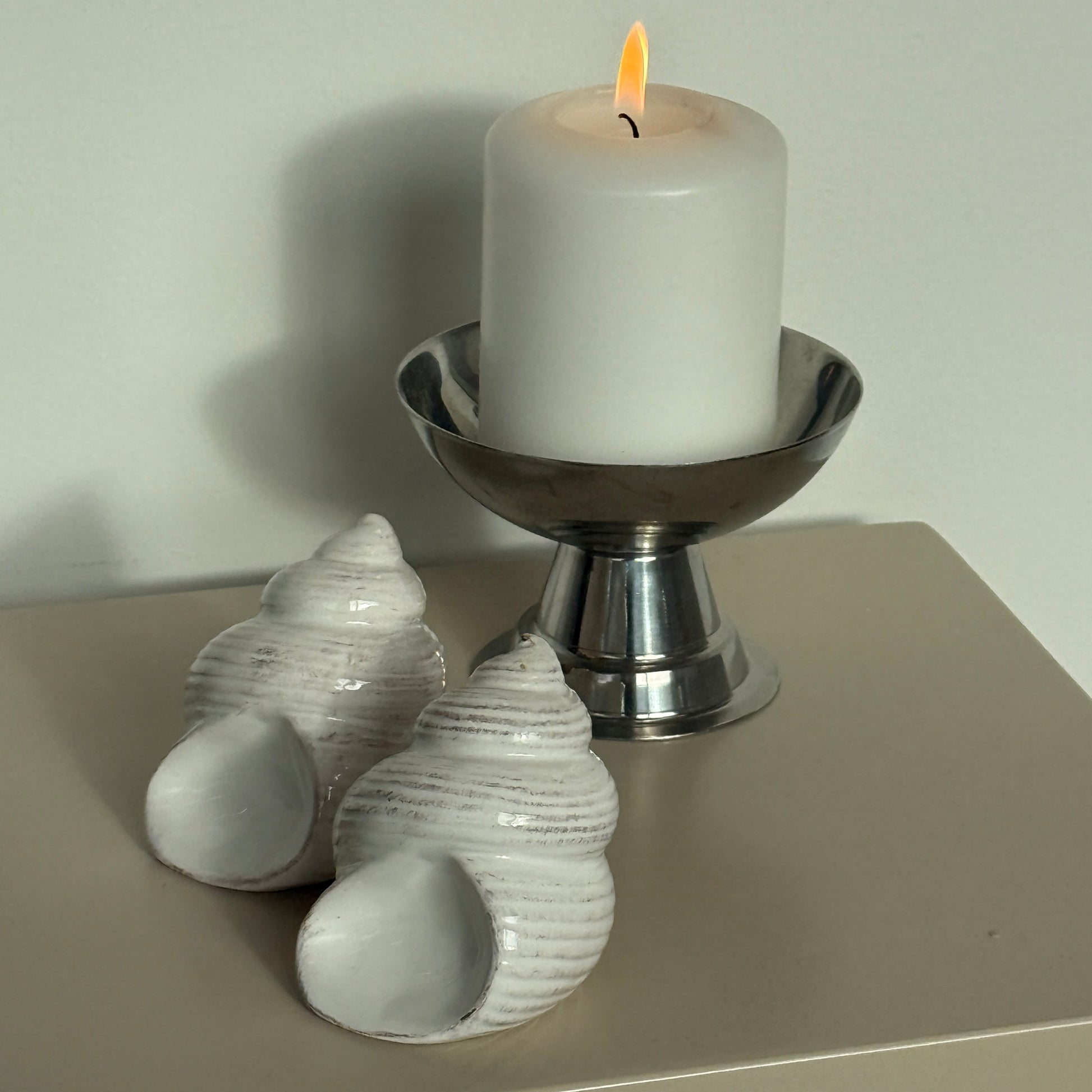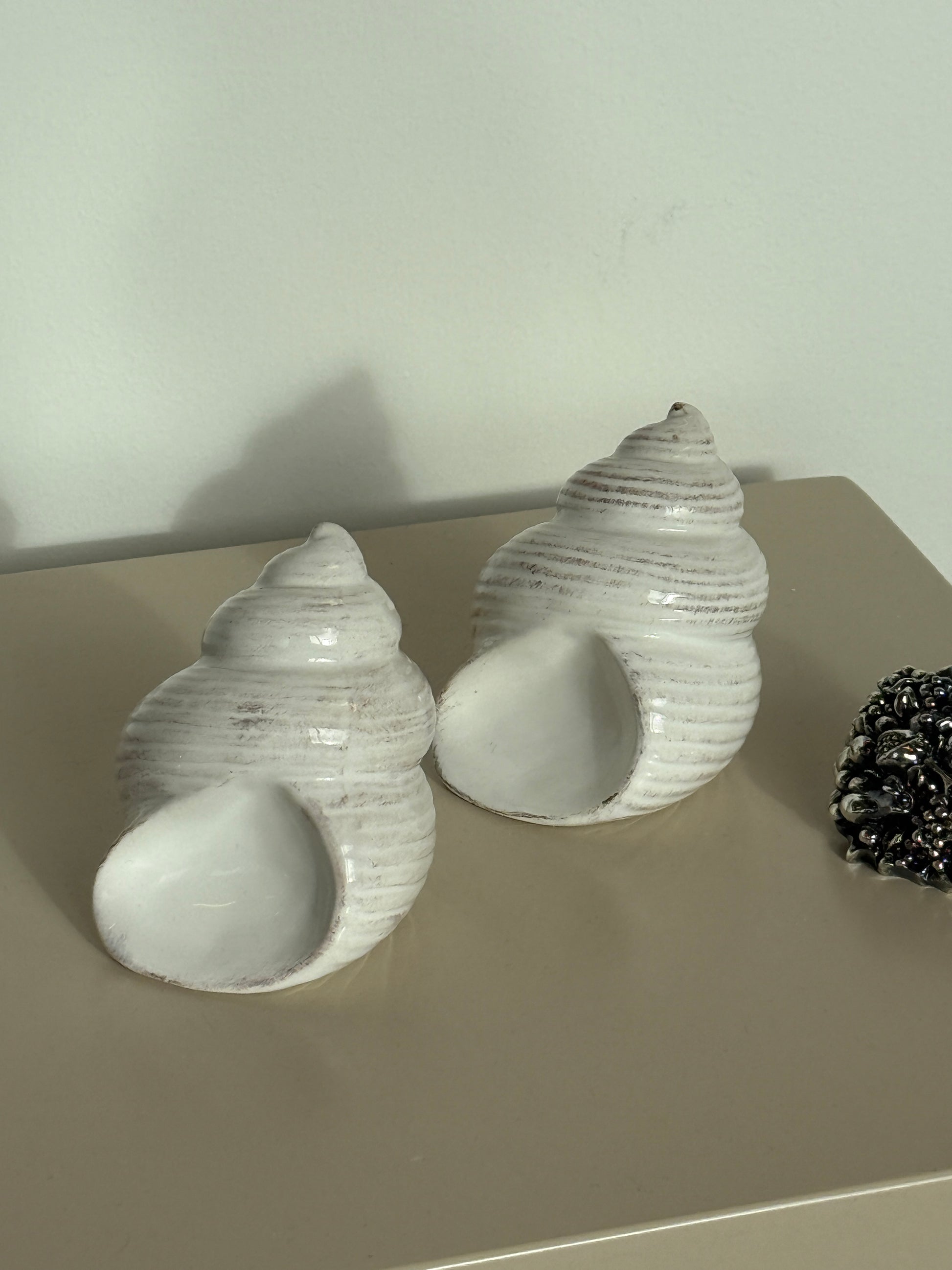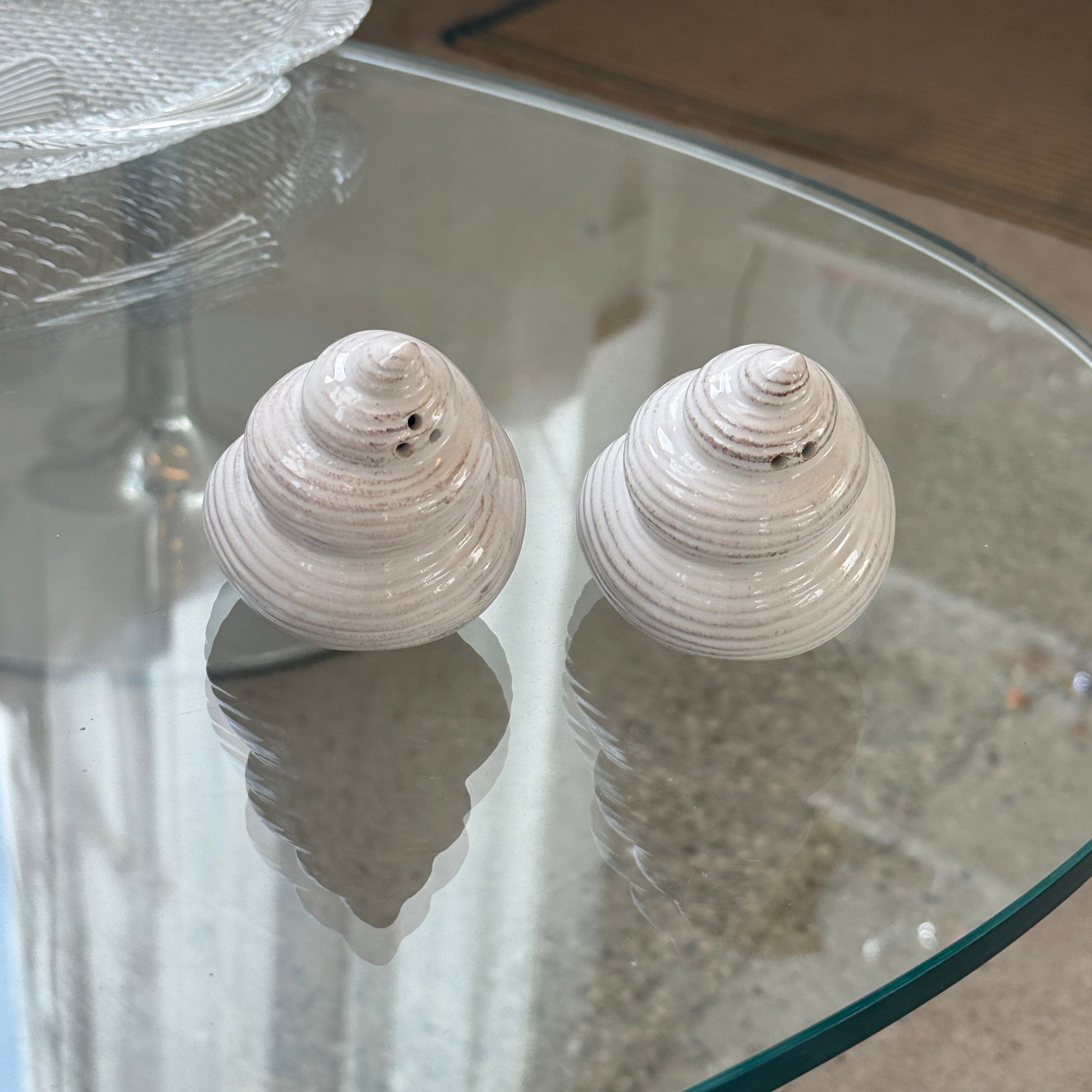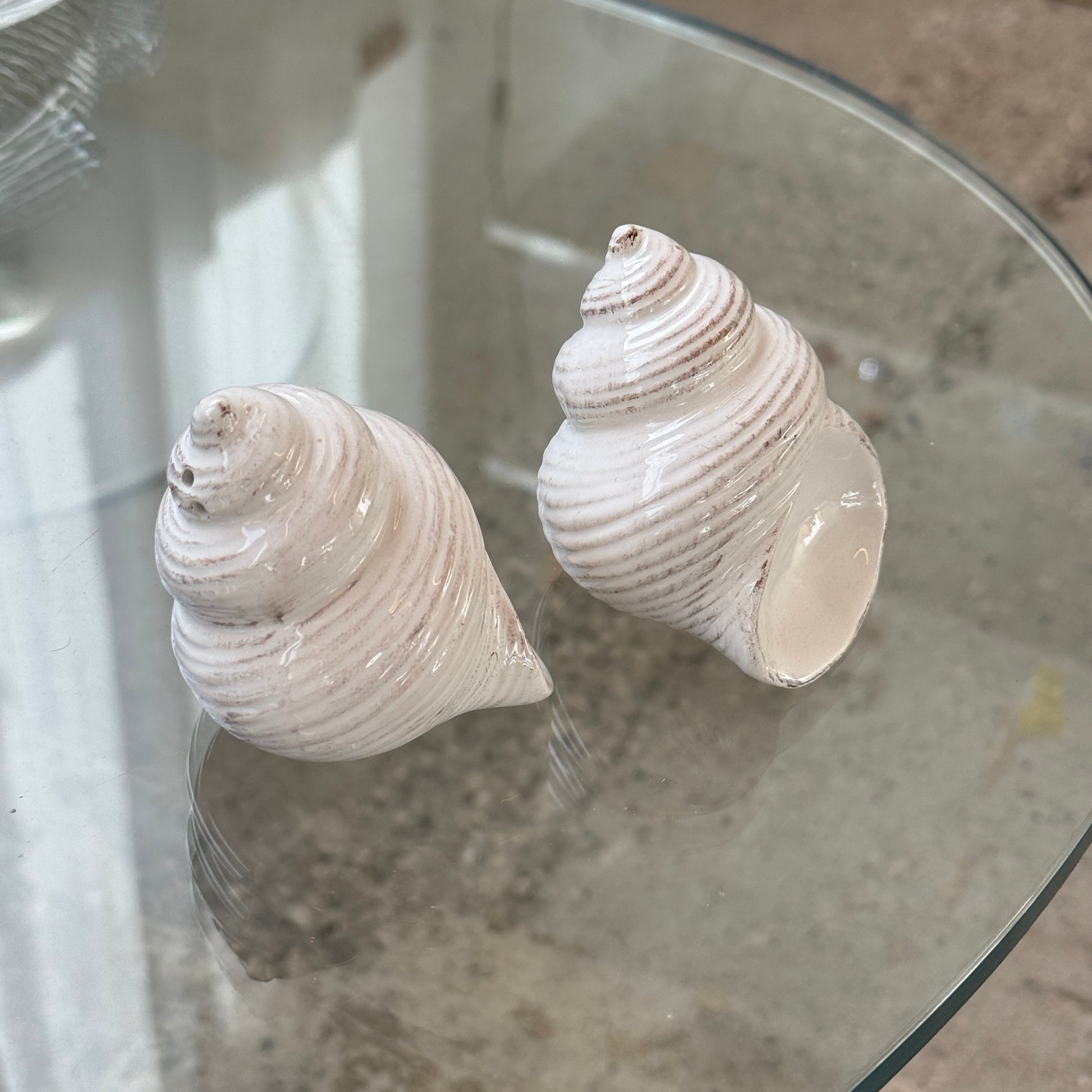 Charmerende vintage salt- og pebersæt formet som små sneglehuse. De bløde, snoede former og den let cremefarvede glasur med fine brunlige strøg giver dem et naturligt og varmt udtryk. Et dekorativt og humoristisk sæt, der tilfører personlighed til borddækningen. Fundet i Frankrig.