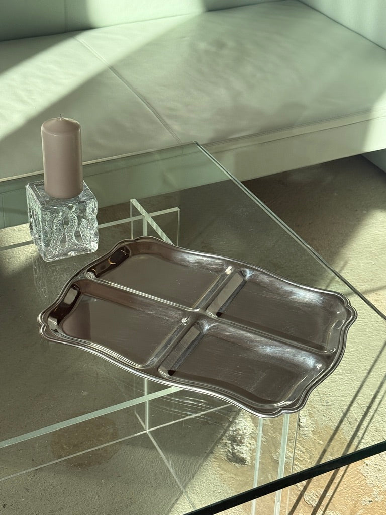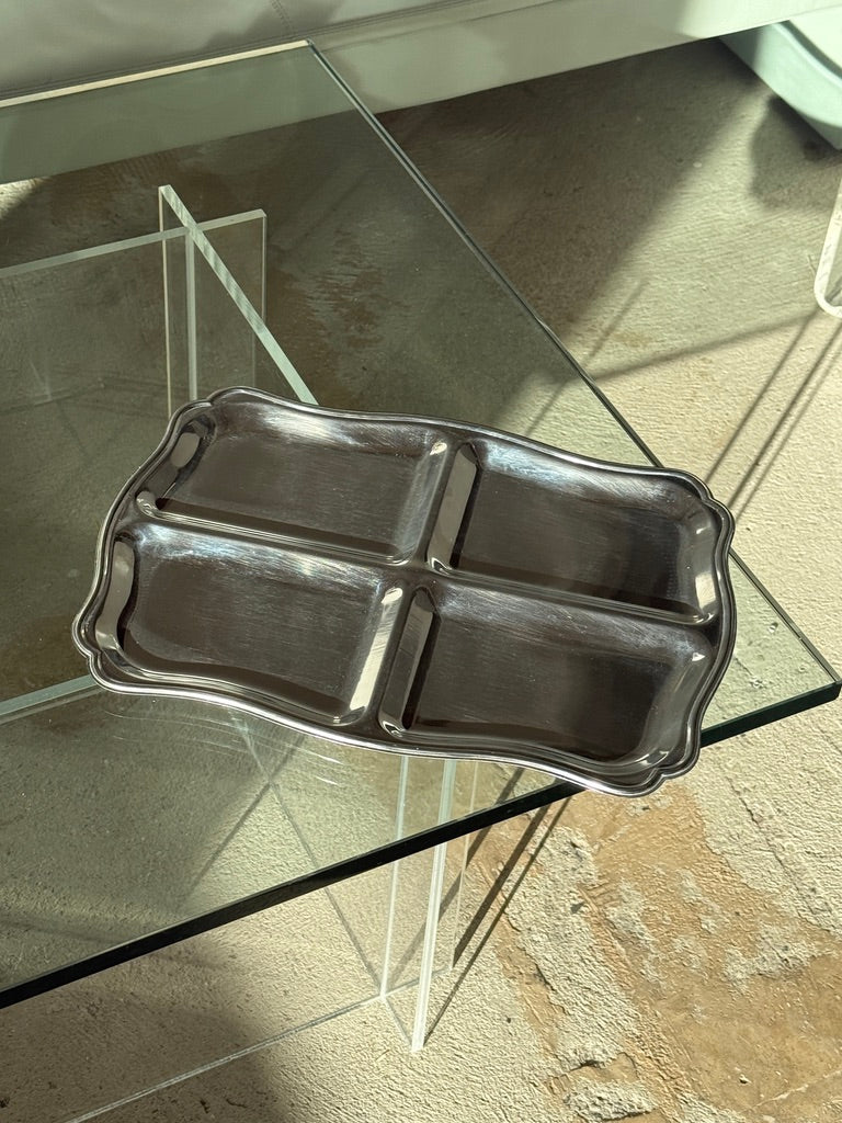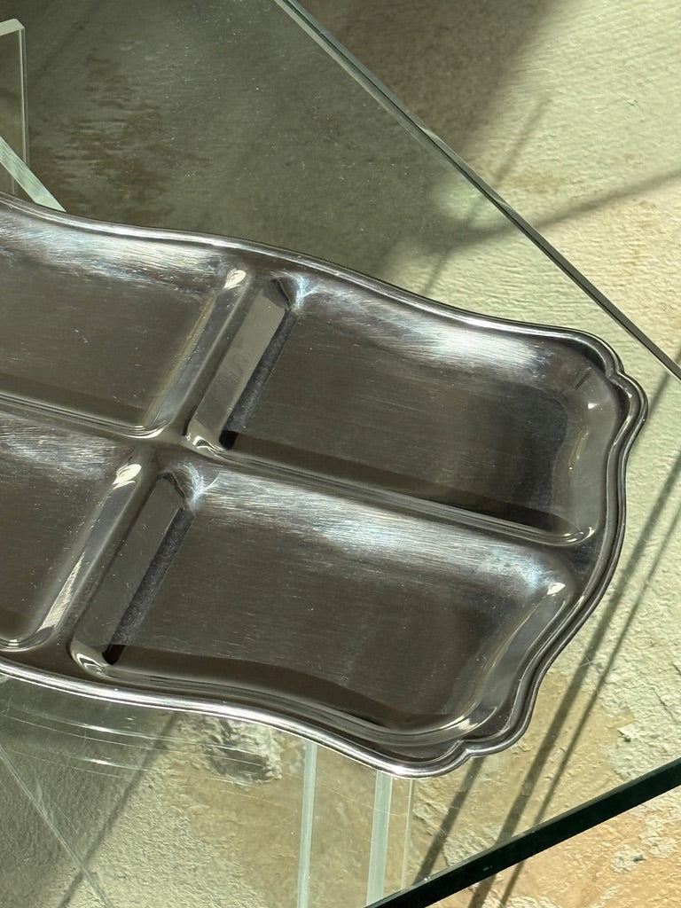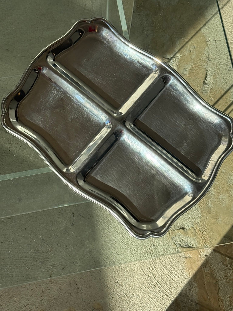 Elegant serveringsfad i rustfrit stål med fire adskilte rum og blødt bølget kant. Perfekt til servering af snacks, tapas, frugt eller tilbehør – eller som dekorativt element på bordet. Det blanke stål giver et tidløst og klassisk udtryk.