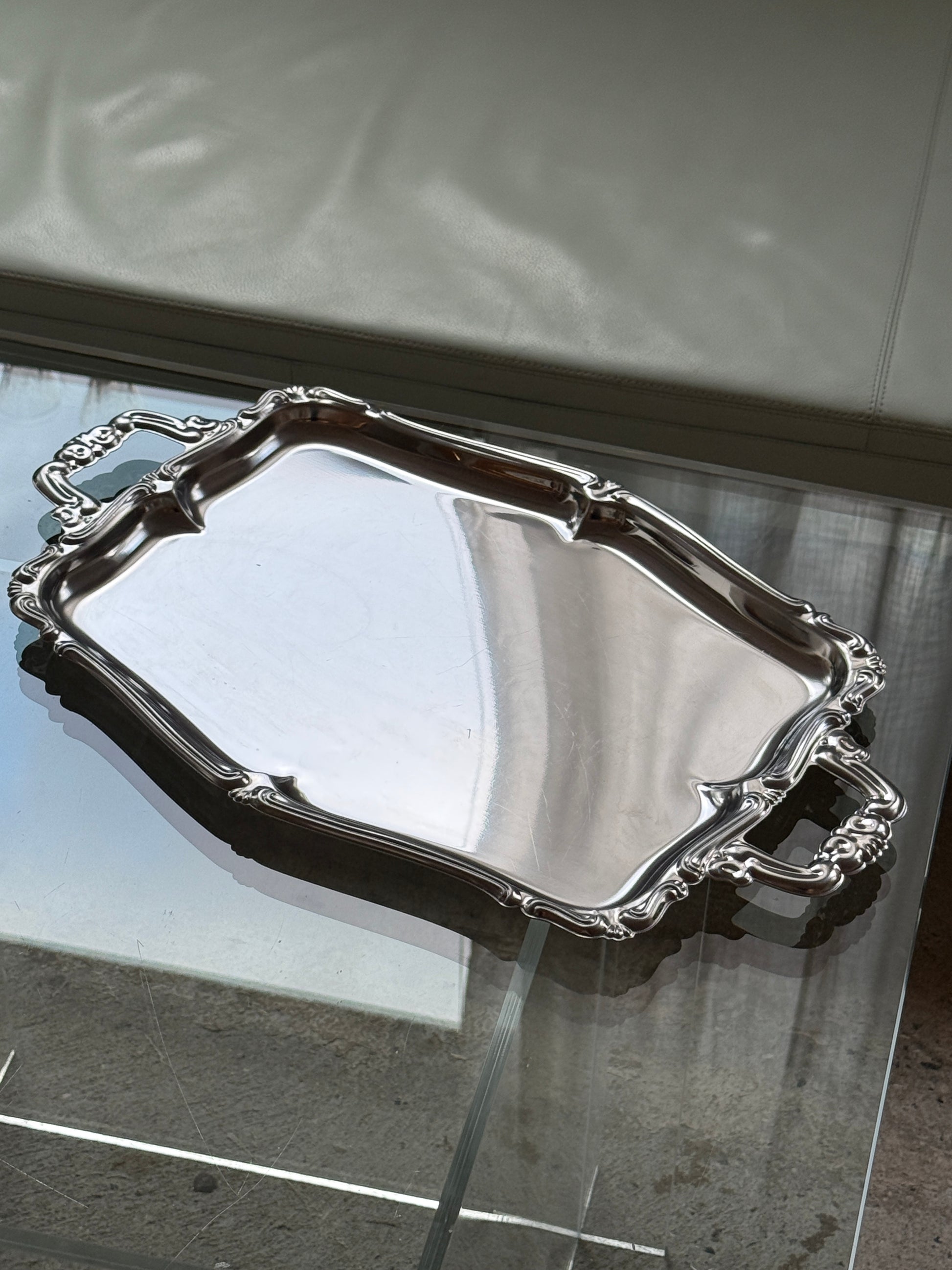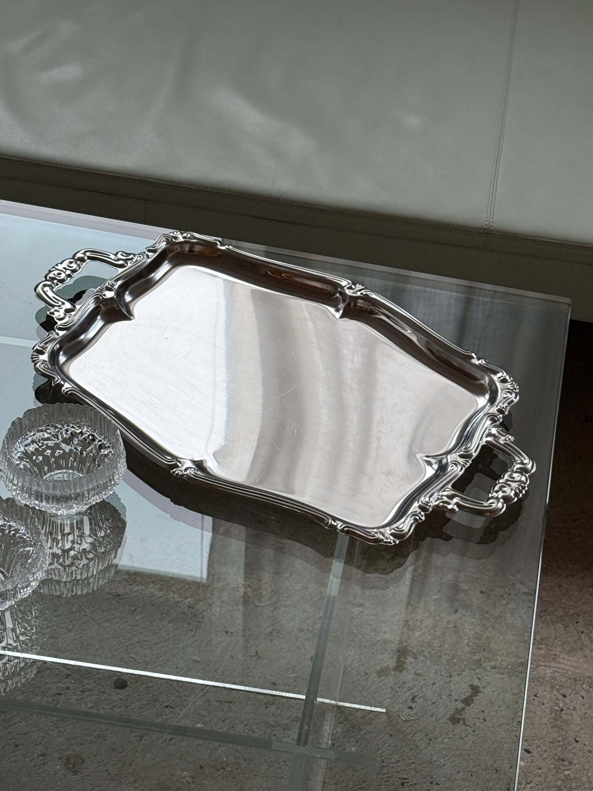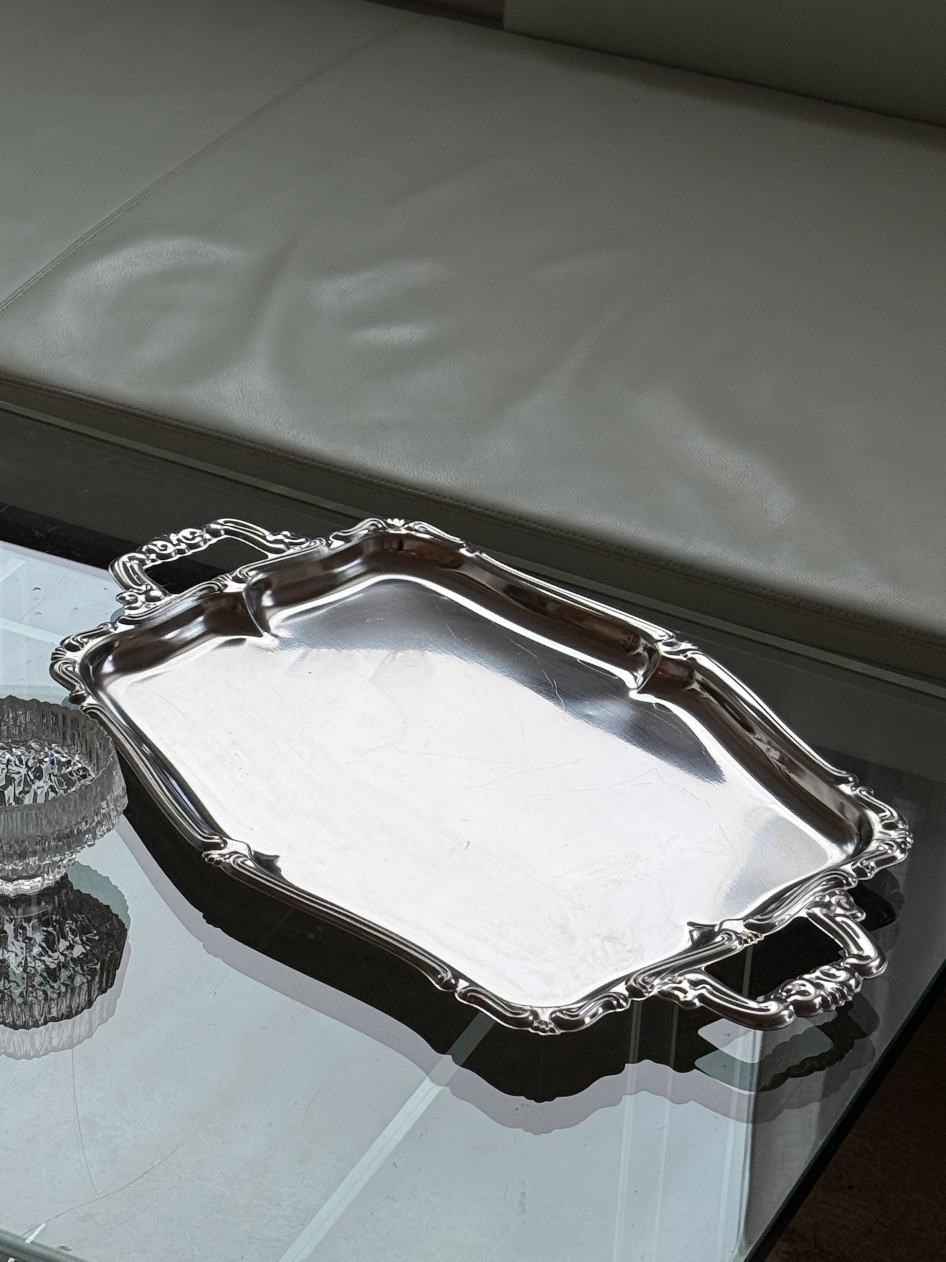 Elegant serveringsfad med smukt udformede håndtag og en dekorativ, let svungen kant. Fadet har et klassisk og tidløst udtryk, hvor de fine detaljer langs kanten og håndtagene giver et eksklusivt præg. Den blanke overflade gør det velegnet både til servering og som dekorativ bakke på et bord, en skænk eller i køkkenet.