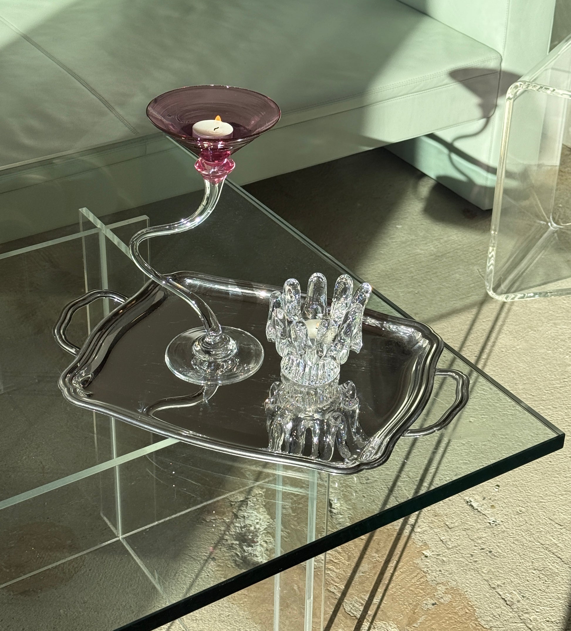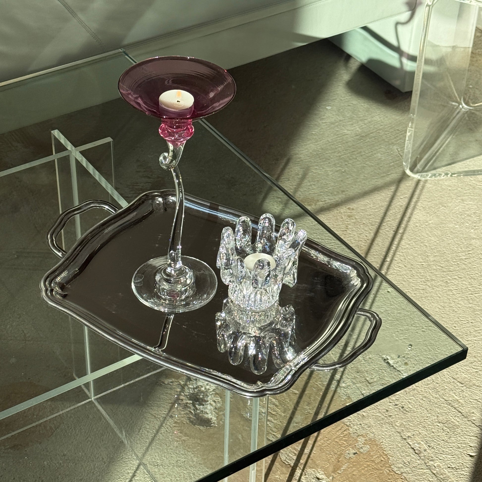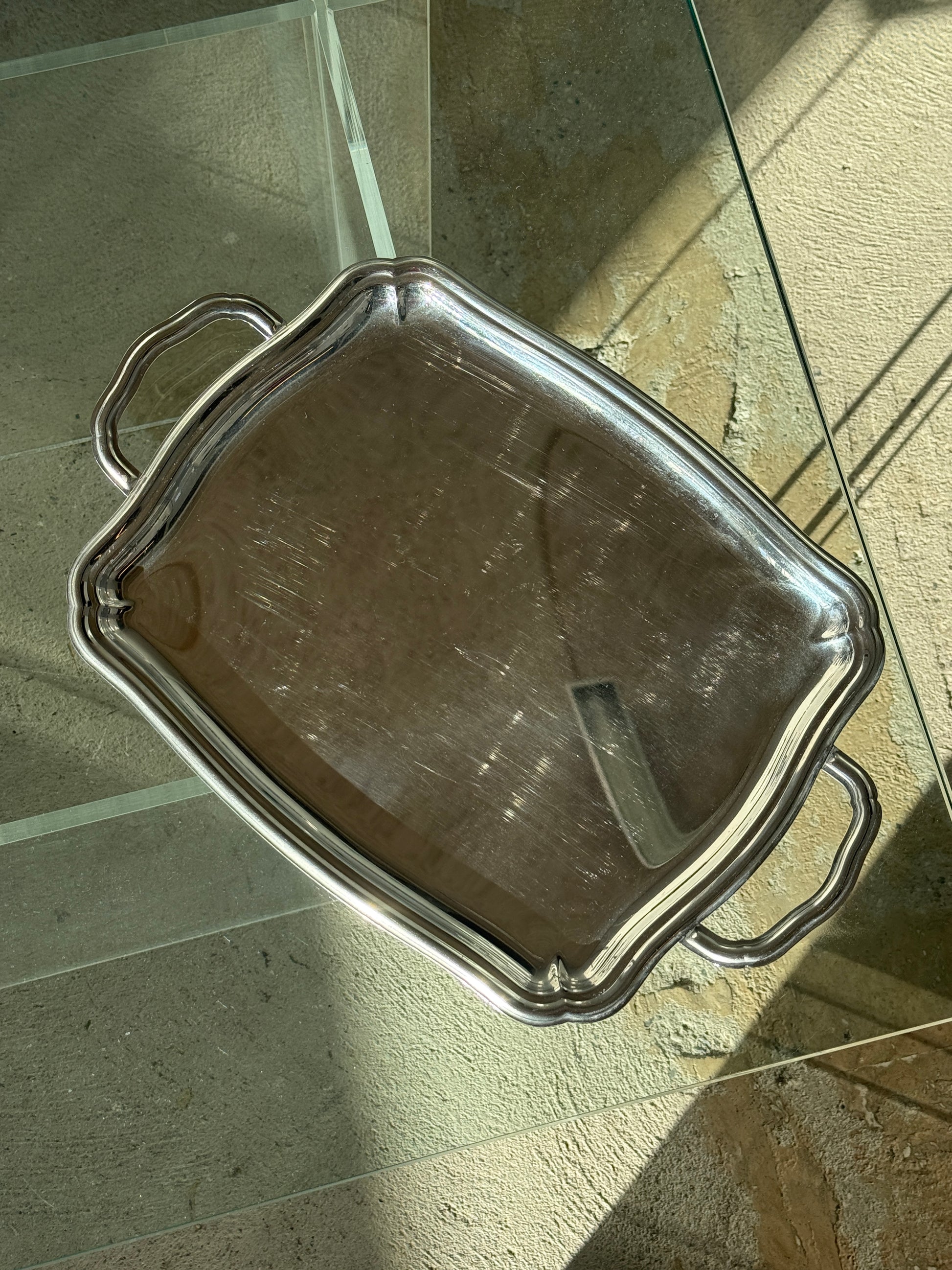Elegant rektangulært serveringsfad i blankt metal med dobbelte håndtag og let bølgende kant. Designet er klassisk og tidløst – perfekt til servering, som base for lys og dekorationer eller til at samle små objekter på et bord.