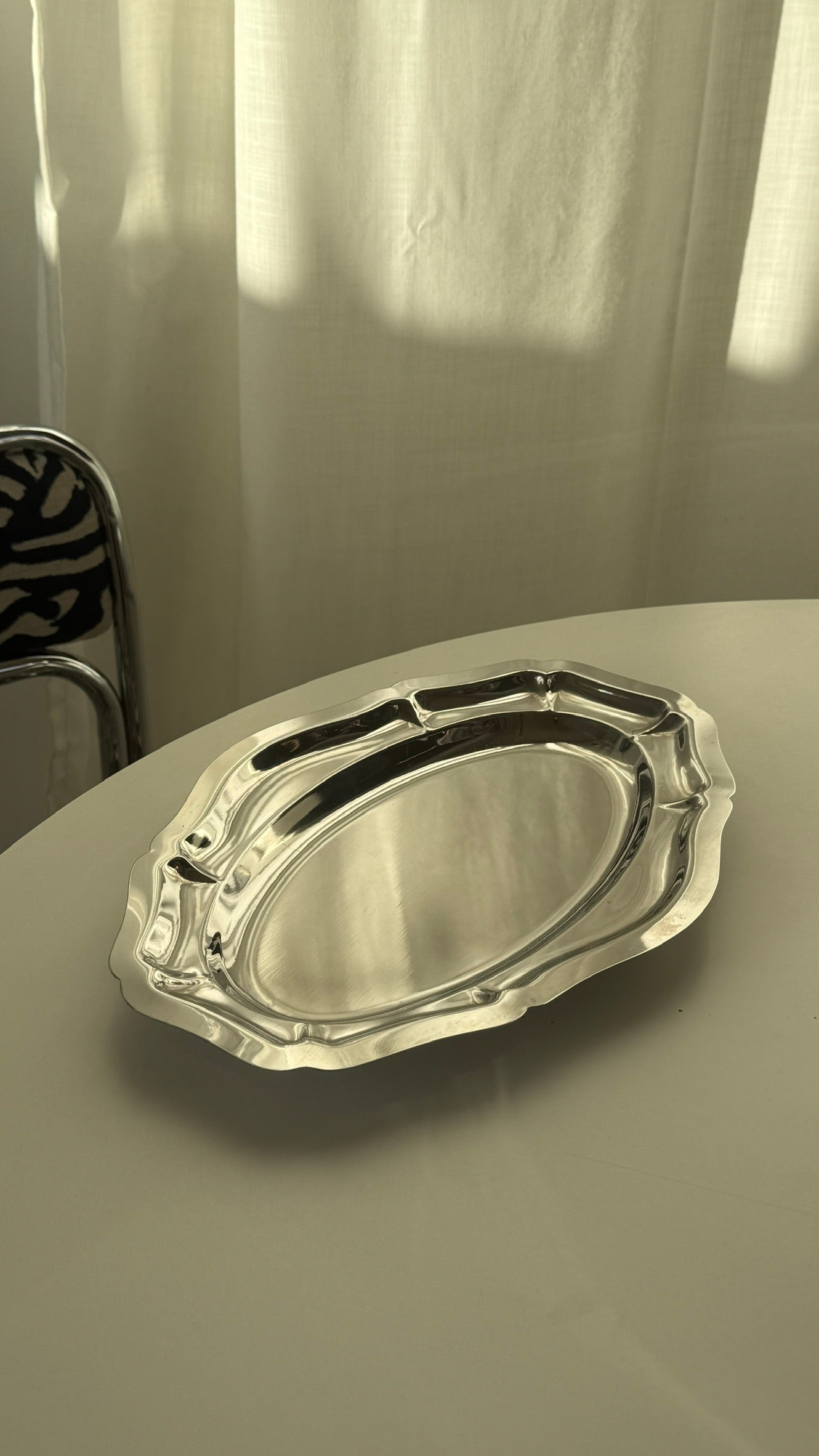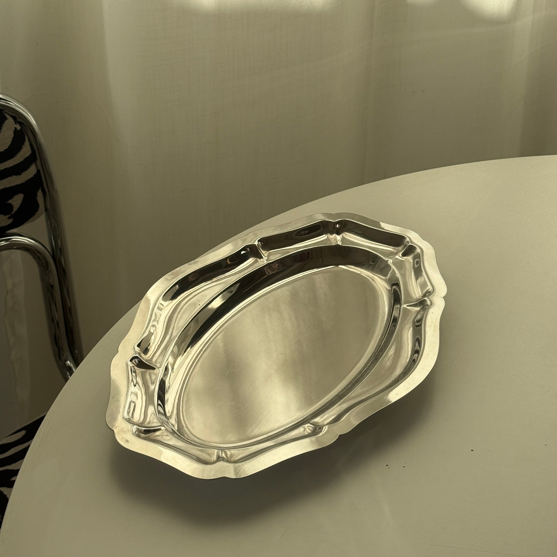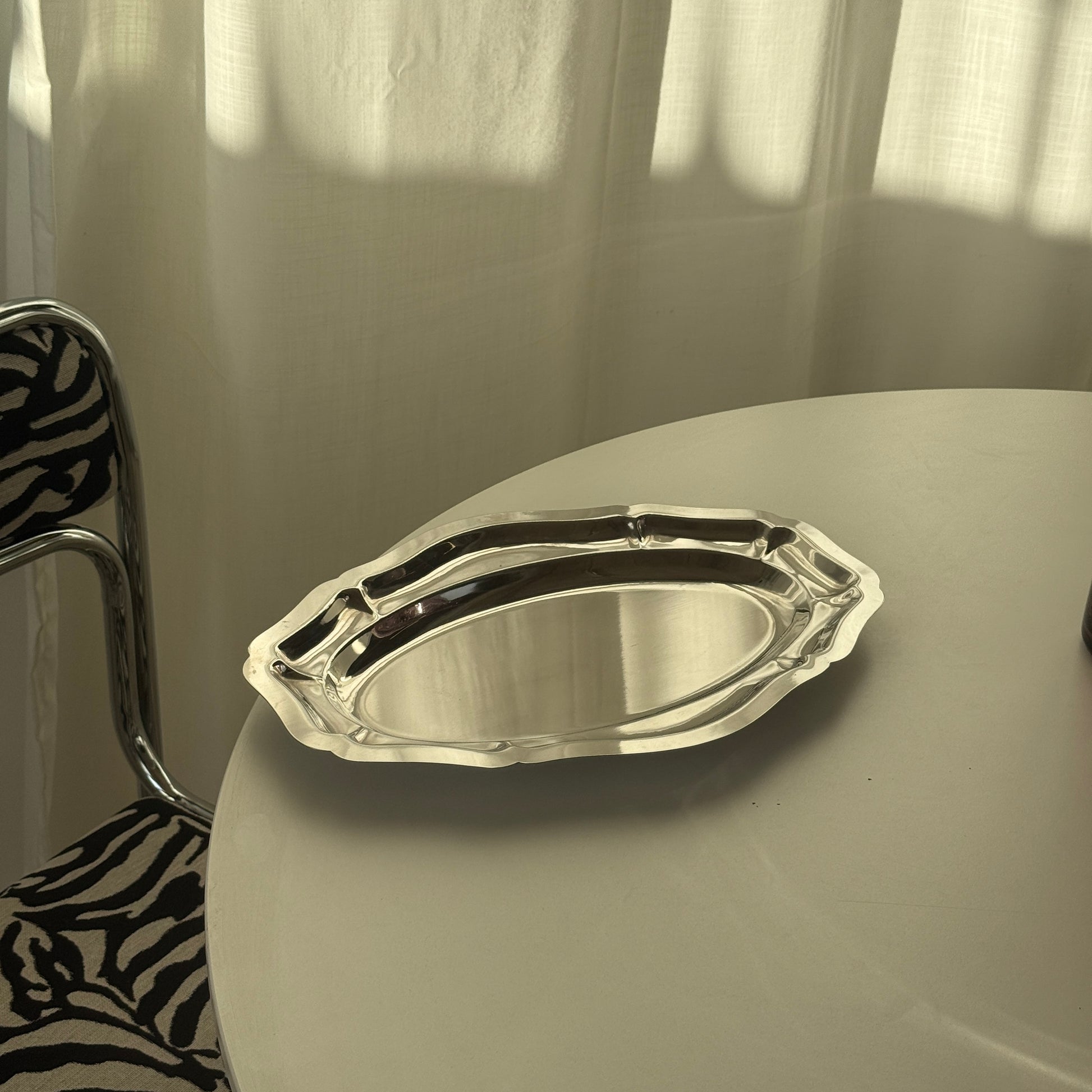 Elegant serveringsfad i rustfrit stål med klassisk bølgekant og blank overflade. Et alsidigt fad i en god mellemstørrelse, der egner sig perfekt til servering af kager, frugt, tapas eller mindre anretninger – men fungerer også smukt som dekorativt element på bordet.