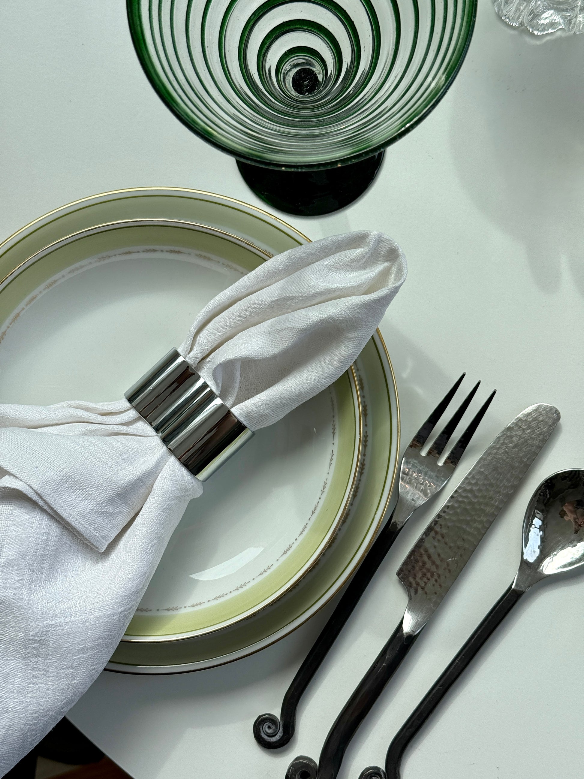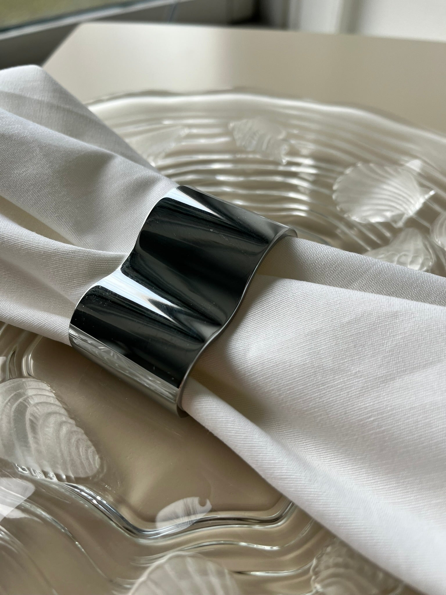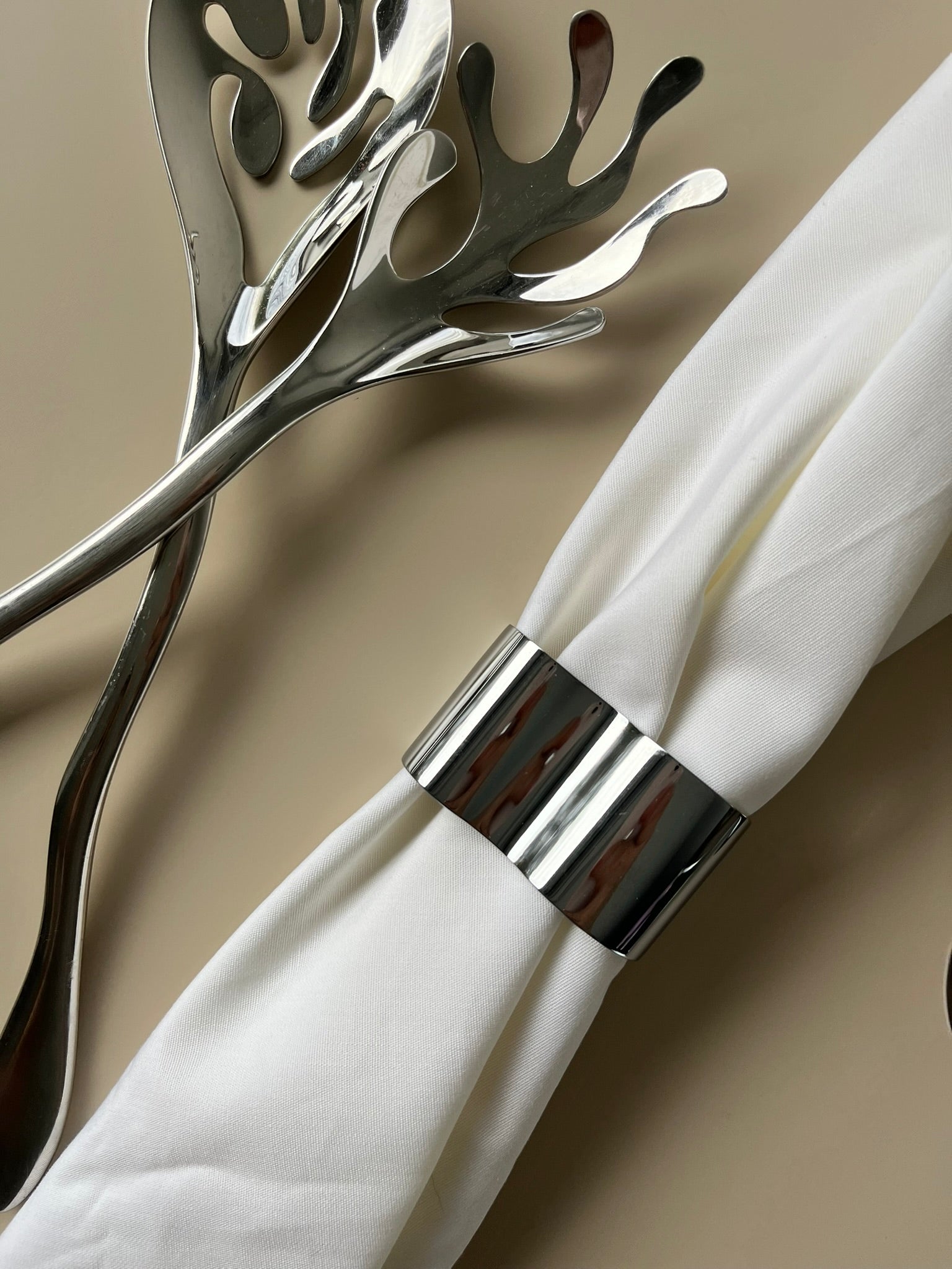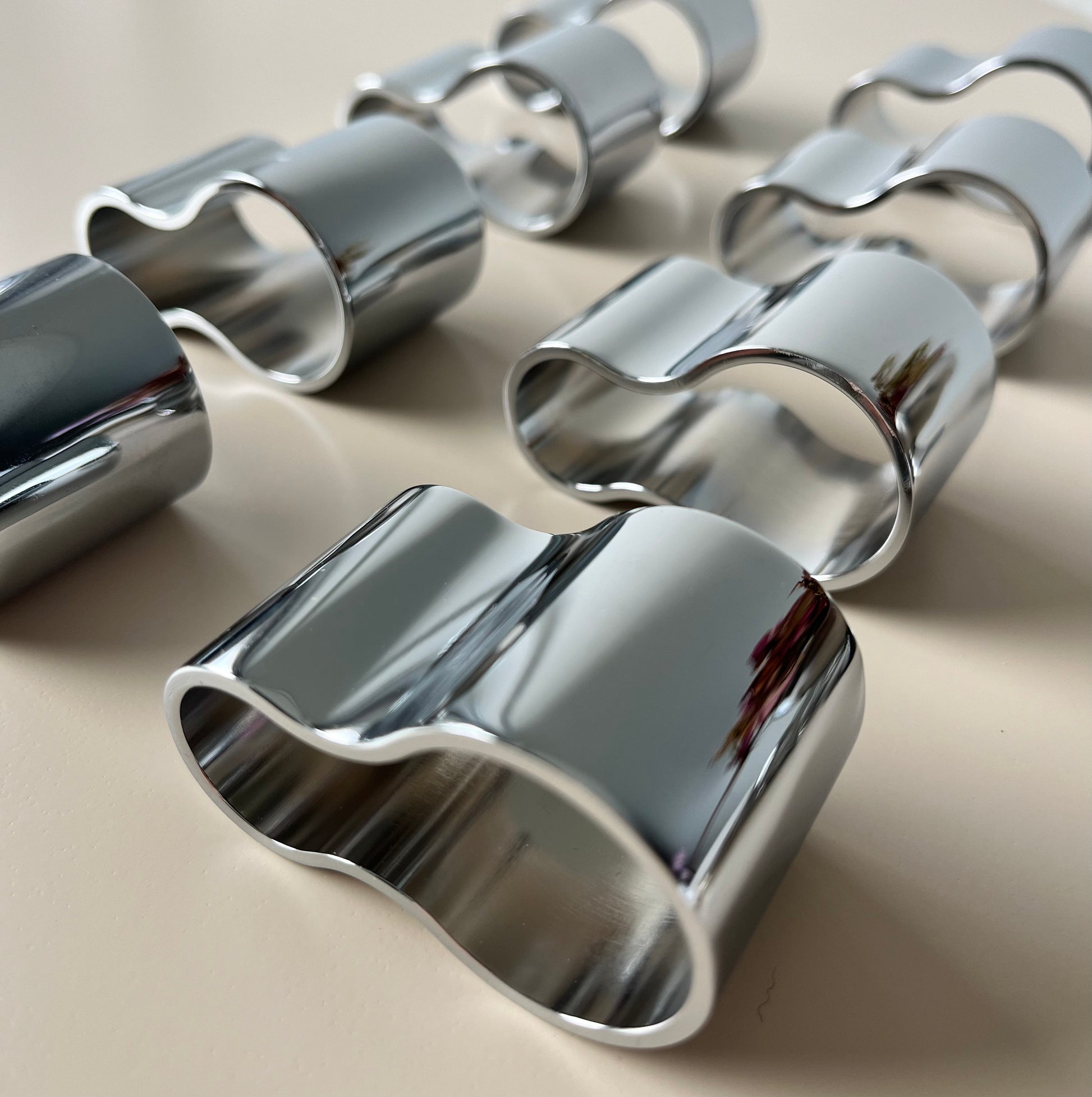 Elegante servietringe fremstillet i rustfrit stål. Har aldrig været i brug.