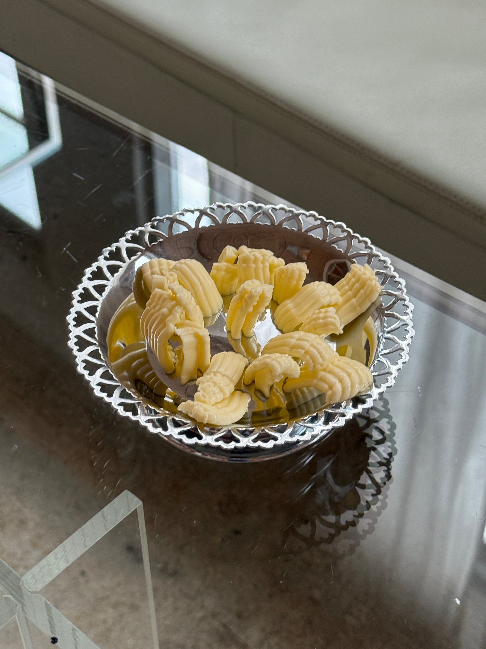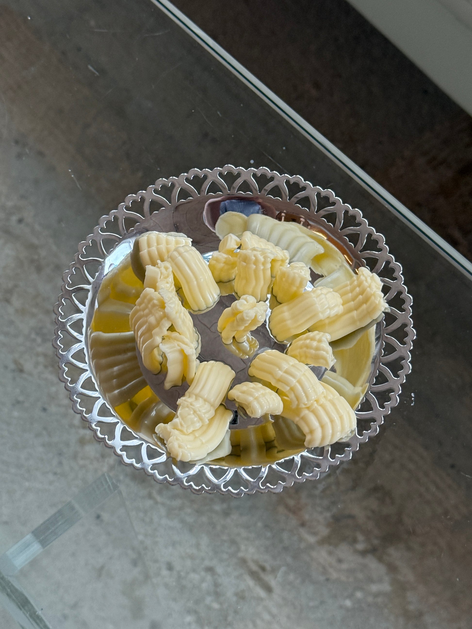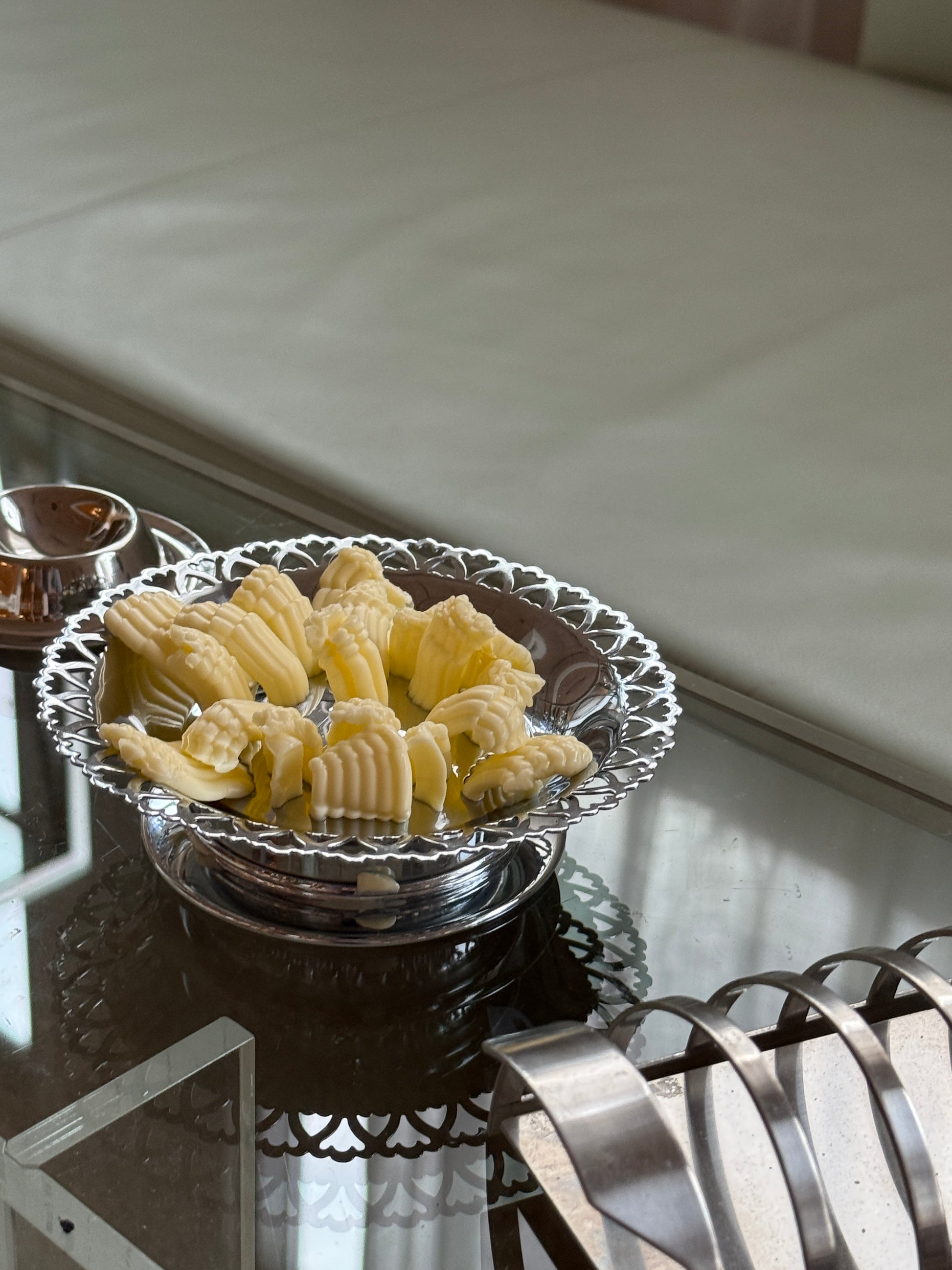 Elegant og dekorativ smørpresser i rustfrit stål fra Florador. Designet er klassisk og funktionelt med smukt gennembrudt bund og en fin, bølget kant, der giver et let og eksklusivt udtryk på morgenbordet. Perfekt til brunch, frokostbordet eller som en særlig detalje i køkkenet.