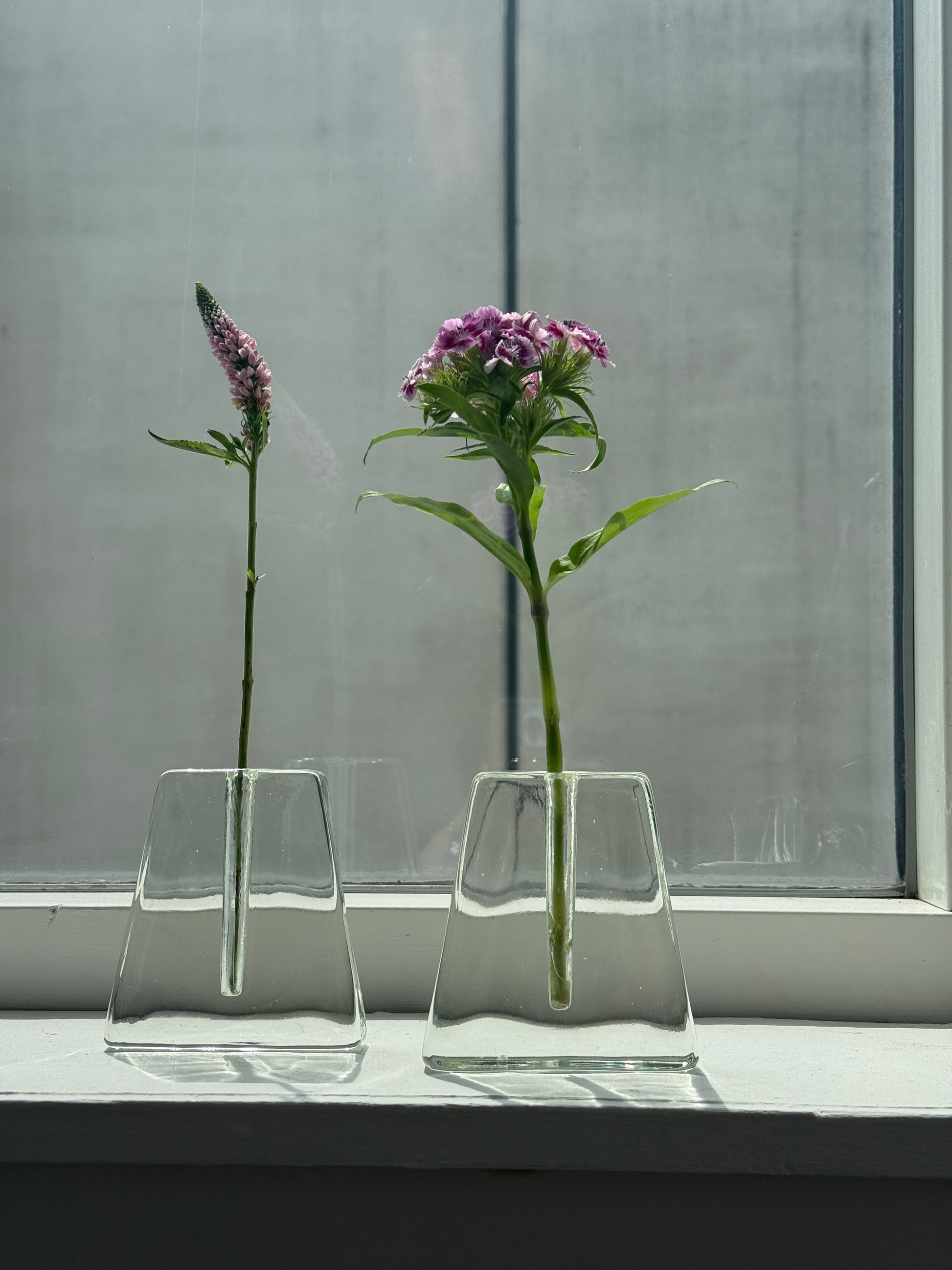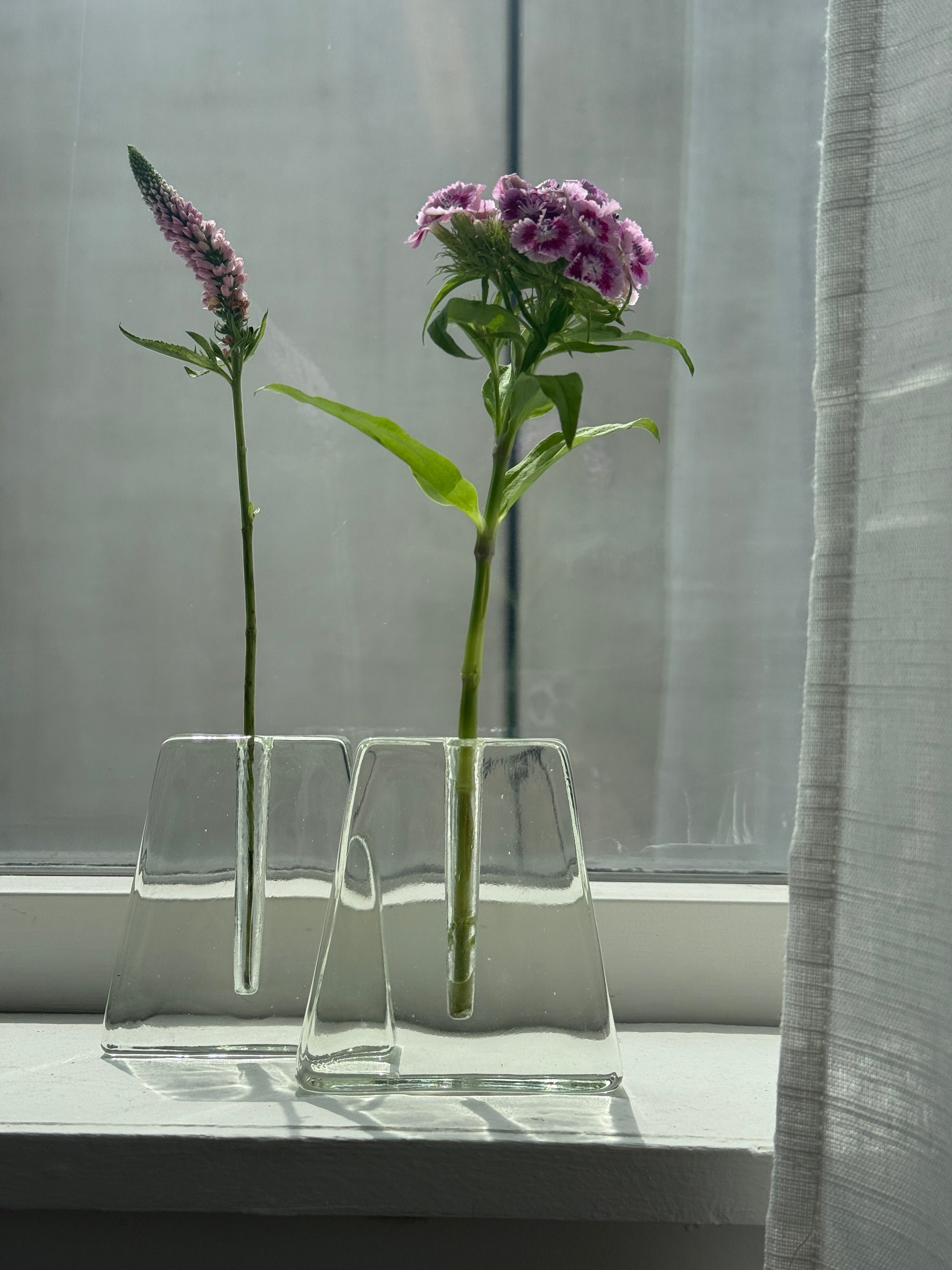Smukke og minimalistiske solifleur-vaser i klart glas, perfekt til én enkelt stilk eller en lille buket. De enkle, geometriske former giver et moderne udtryk og lader blomsten få fuld opmærksomhed.