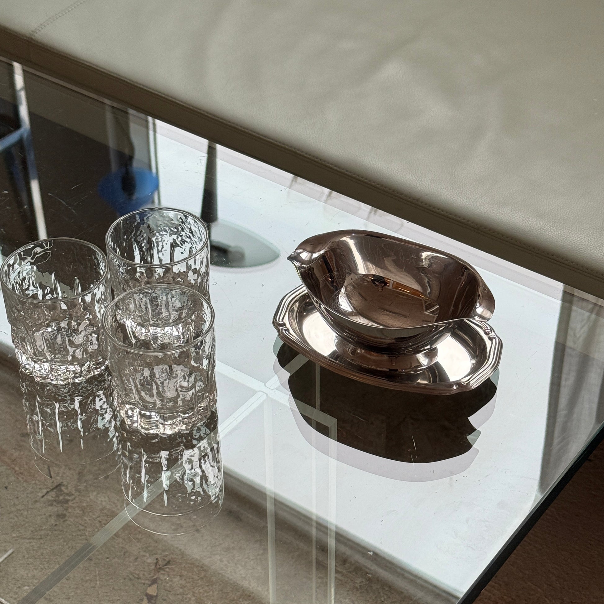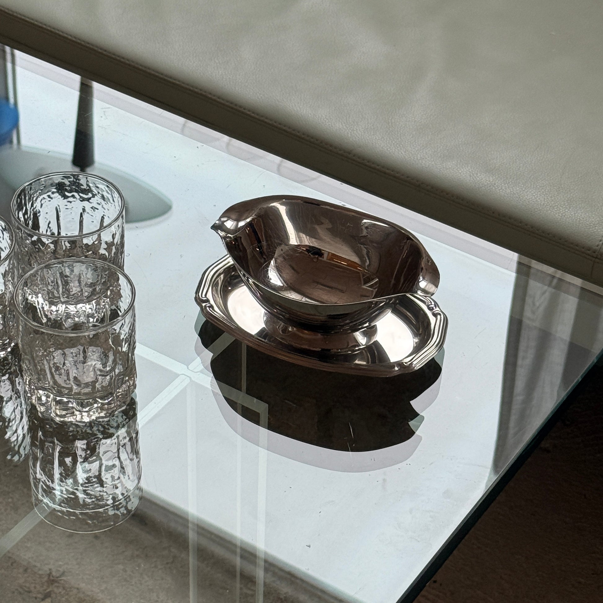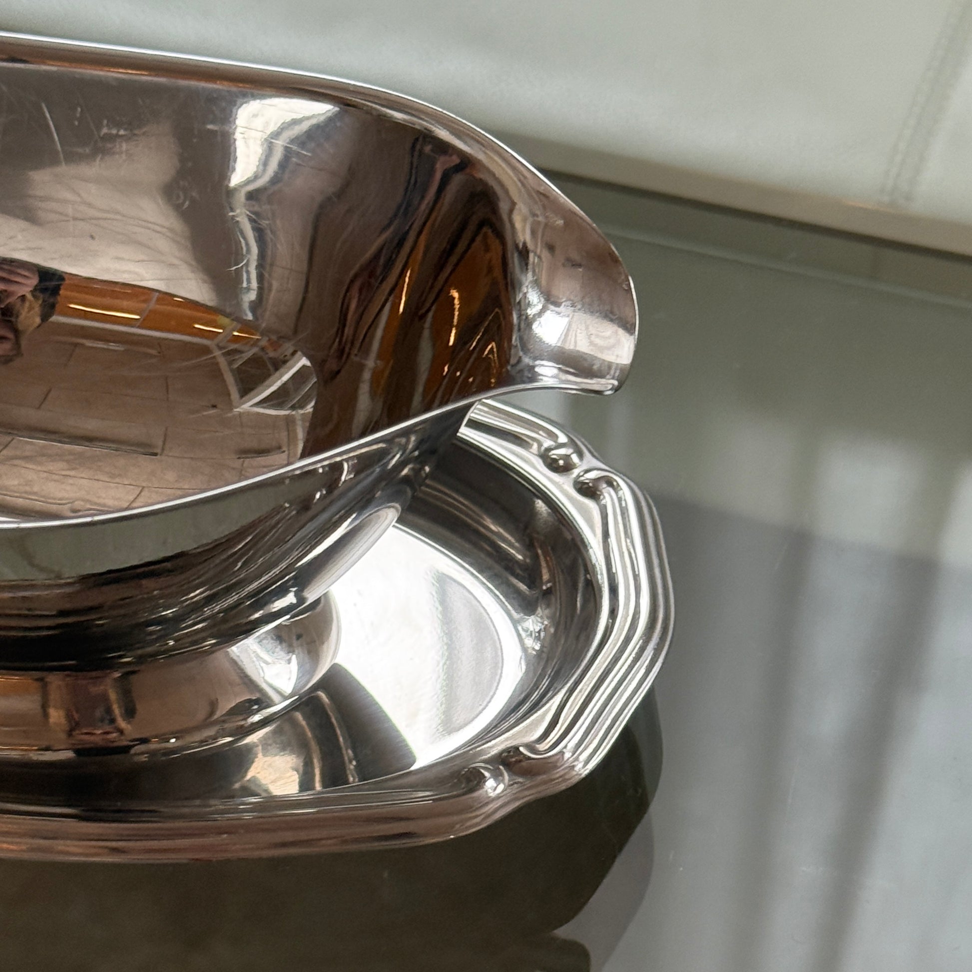 Klassisk sovseskål i rustfrit stål med tilhørende fad, hvor skålen sidder fast. Det giver et harmonisk og stabilt udtryk på bordet og gør den nem at bruge ved servering. Det enkle og tidløse design passer både til hverdag og mere formelle opdækninger. Skålen er velegnet til sovs, dressing eller andre saucer.