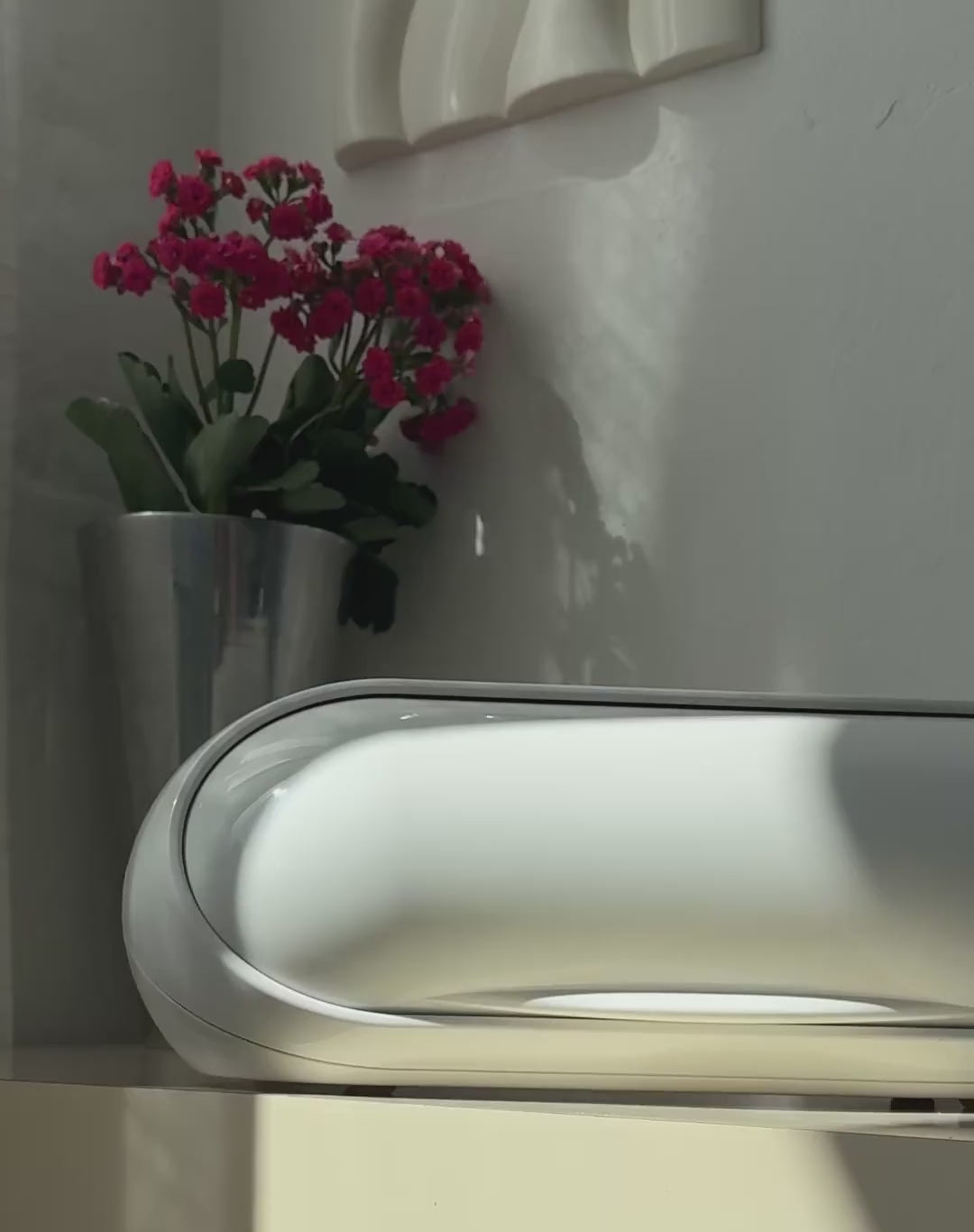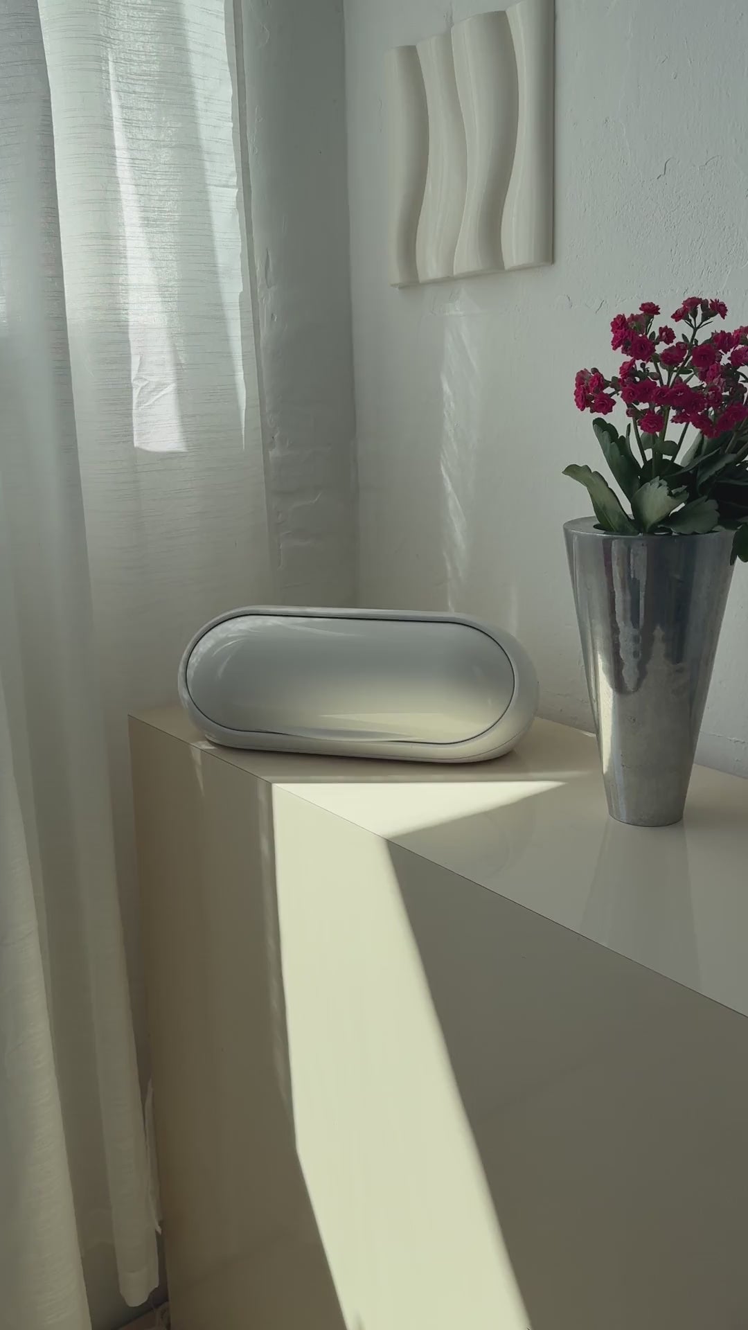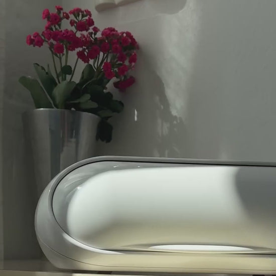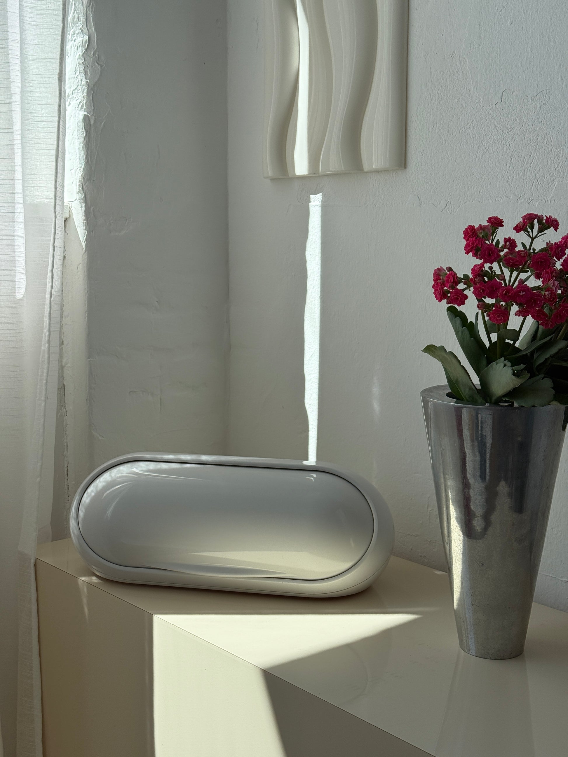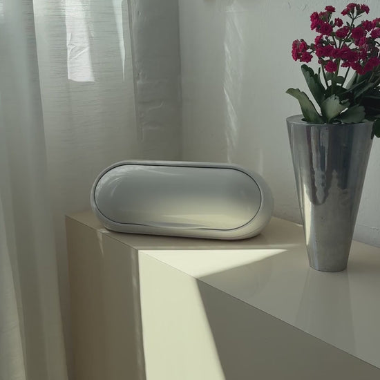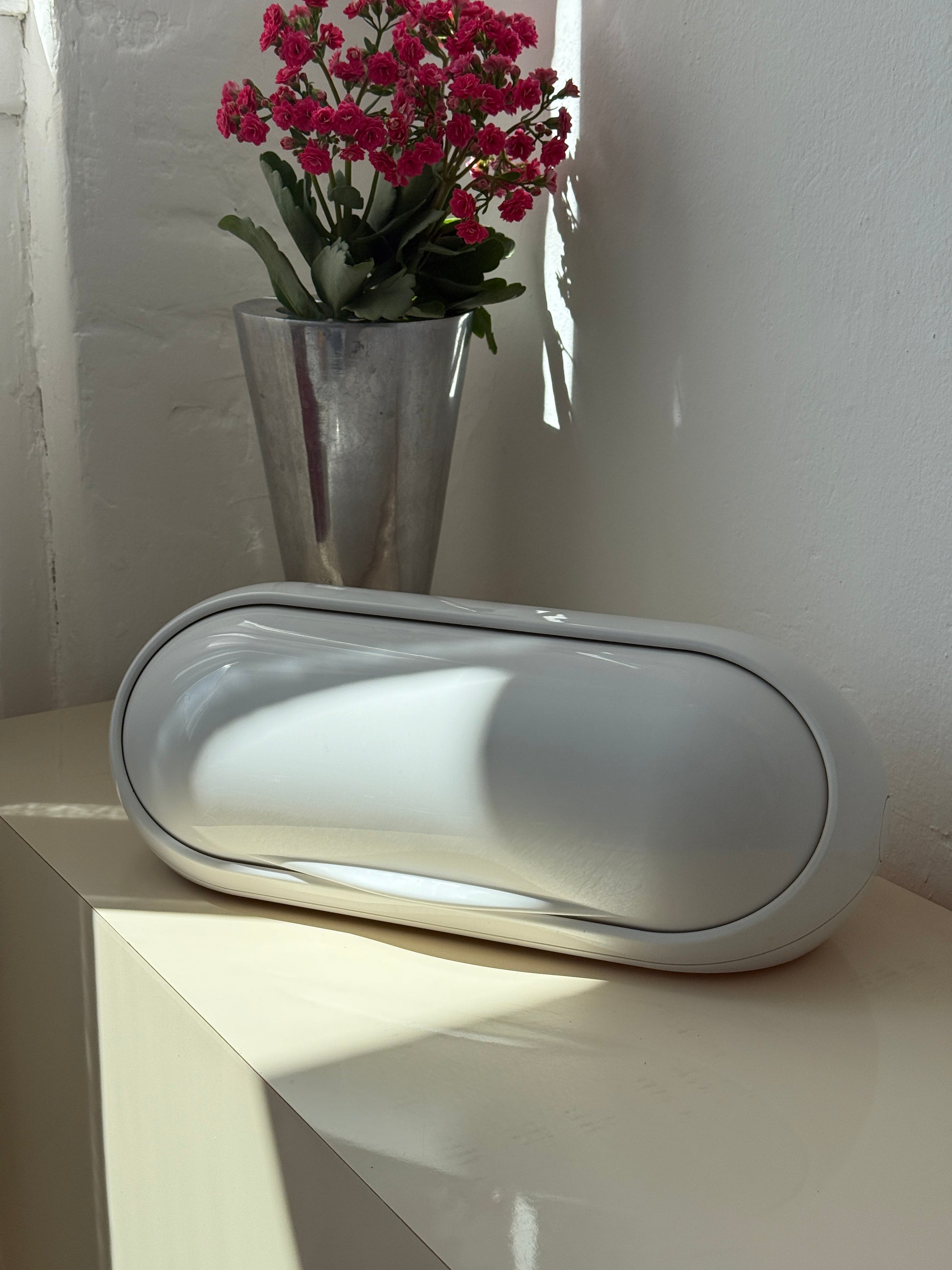 Stor hvid brødkasse lavet i glansfuld plast i en oval form – et ægte space age design, der emmer af 60’er-70’er og funktionel elegance. Låget åbnes med et diskret greb, og indersiden har god plads til opbevaring af brød.