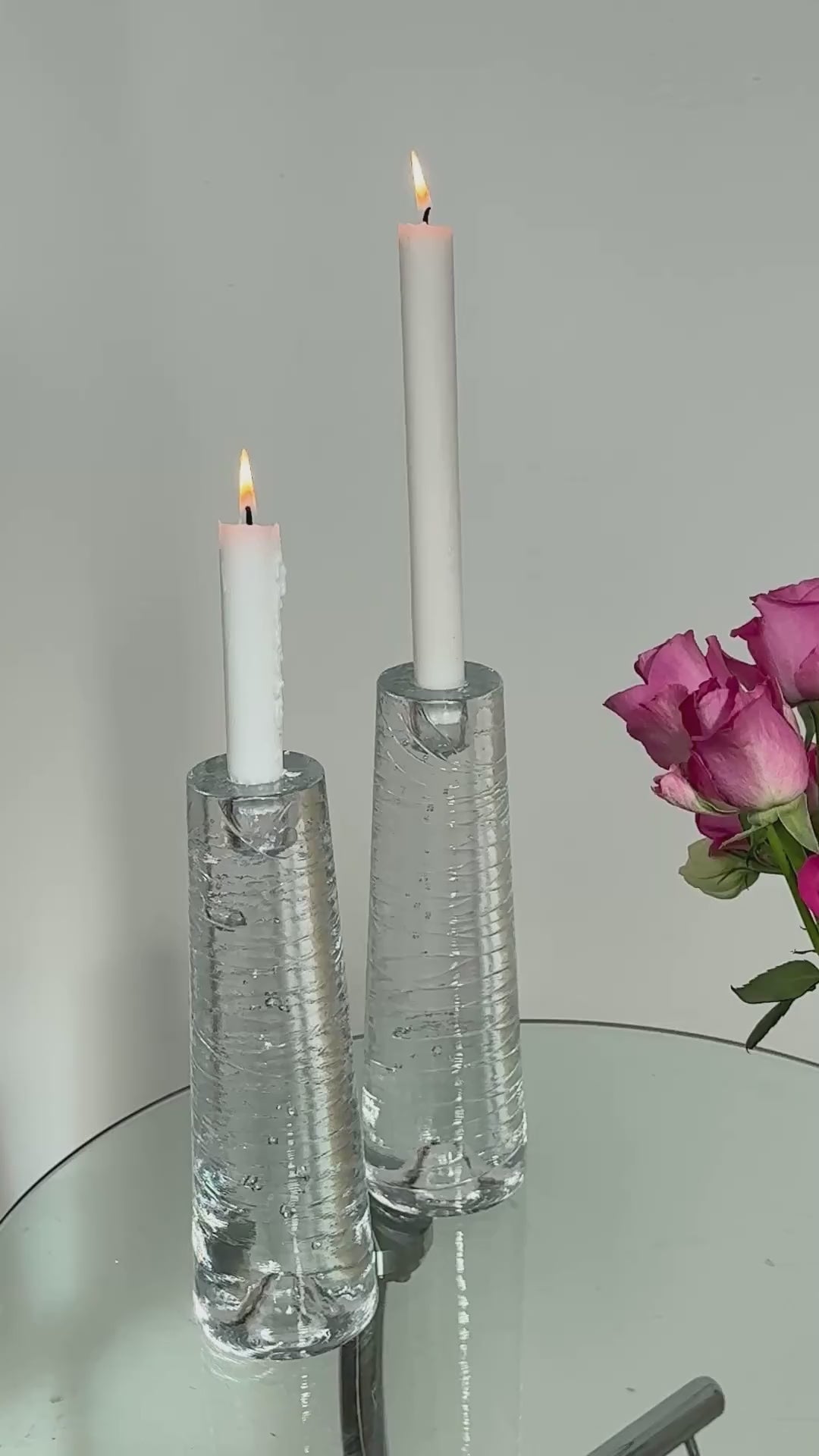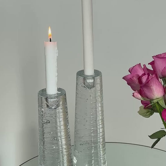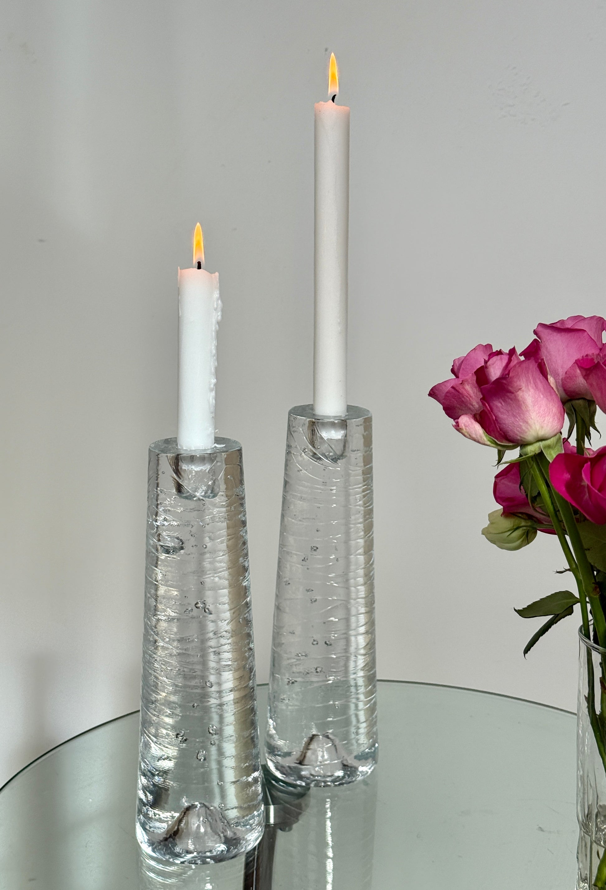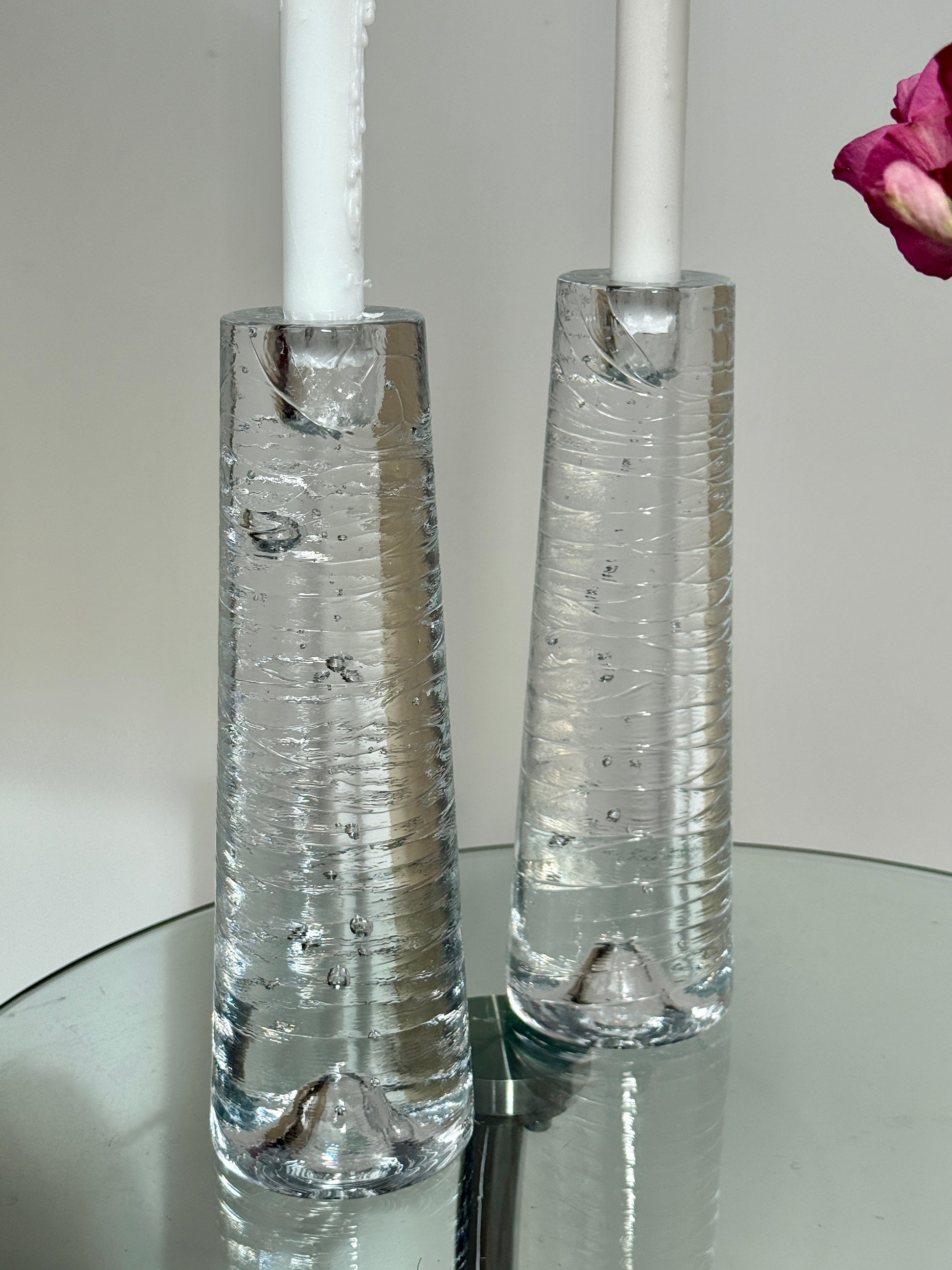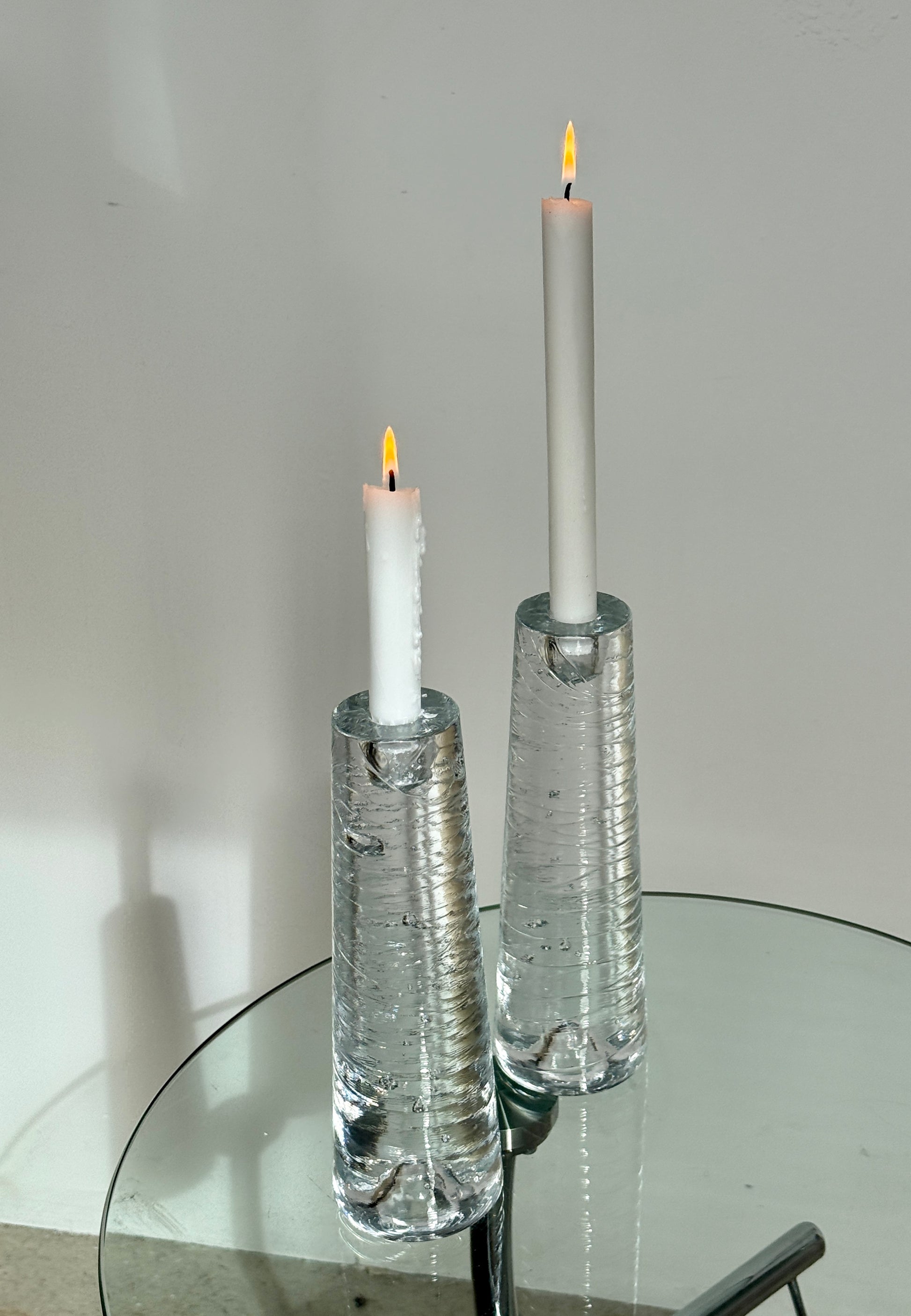 Et smukt sæt tunge glaslysestager designet af Anna Ehrner for Kosta Boda. De har en elegant, konisk form, hvor det klare glas er fyldt med små luftbobler, der giver et levende og organisk spil, når lyset rammer. Stagerne er tunge og solide med en vægt på ca. 2,1 kg pr. stk., hvilket giver flot tyngde og stabilitet.
