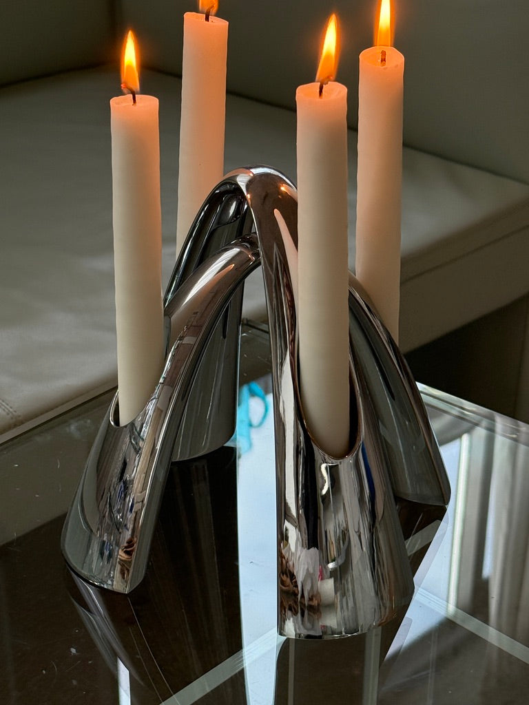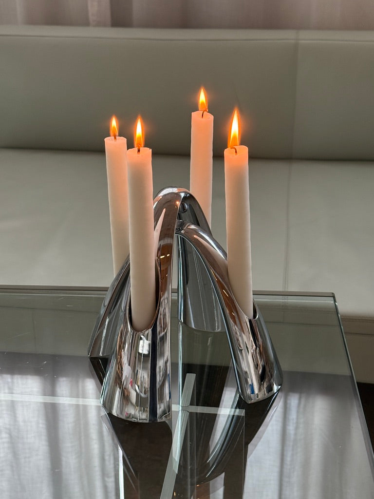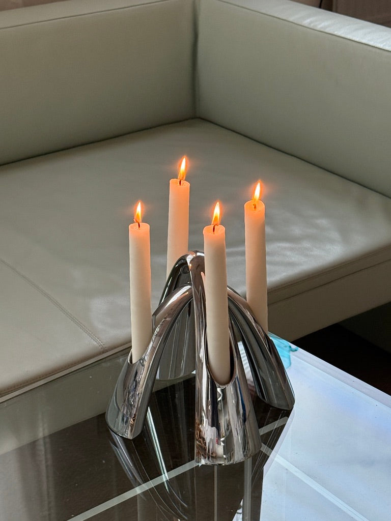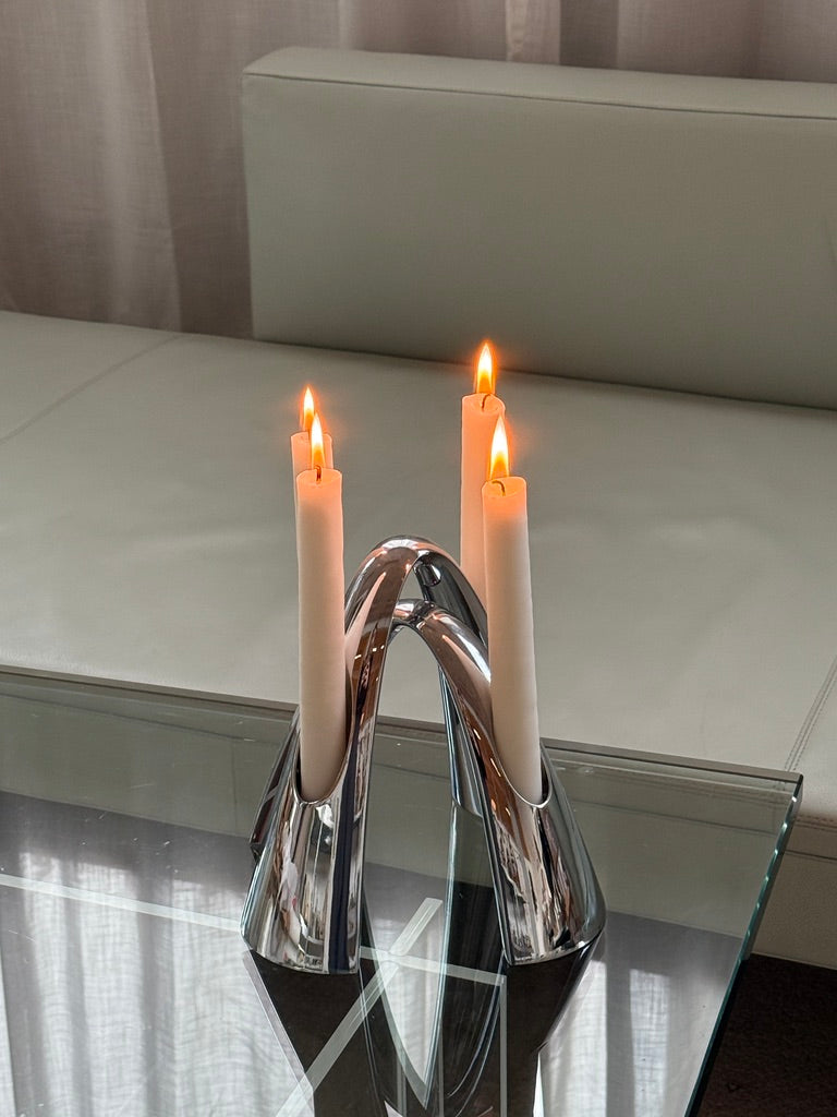 Smukt sæt Twilight lysestager fra Stelton, udført i poleret rustfrit stål. Designet er elegant og skulpturelt med de karakteristiske buede former og passer perfekt ind i en stilren, skandinavisk indretning.
