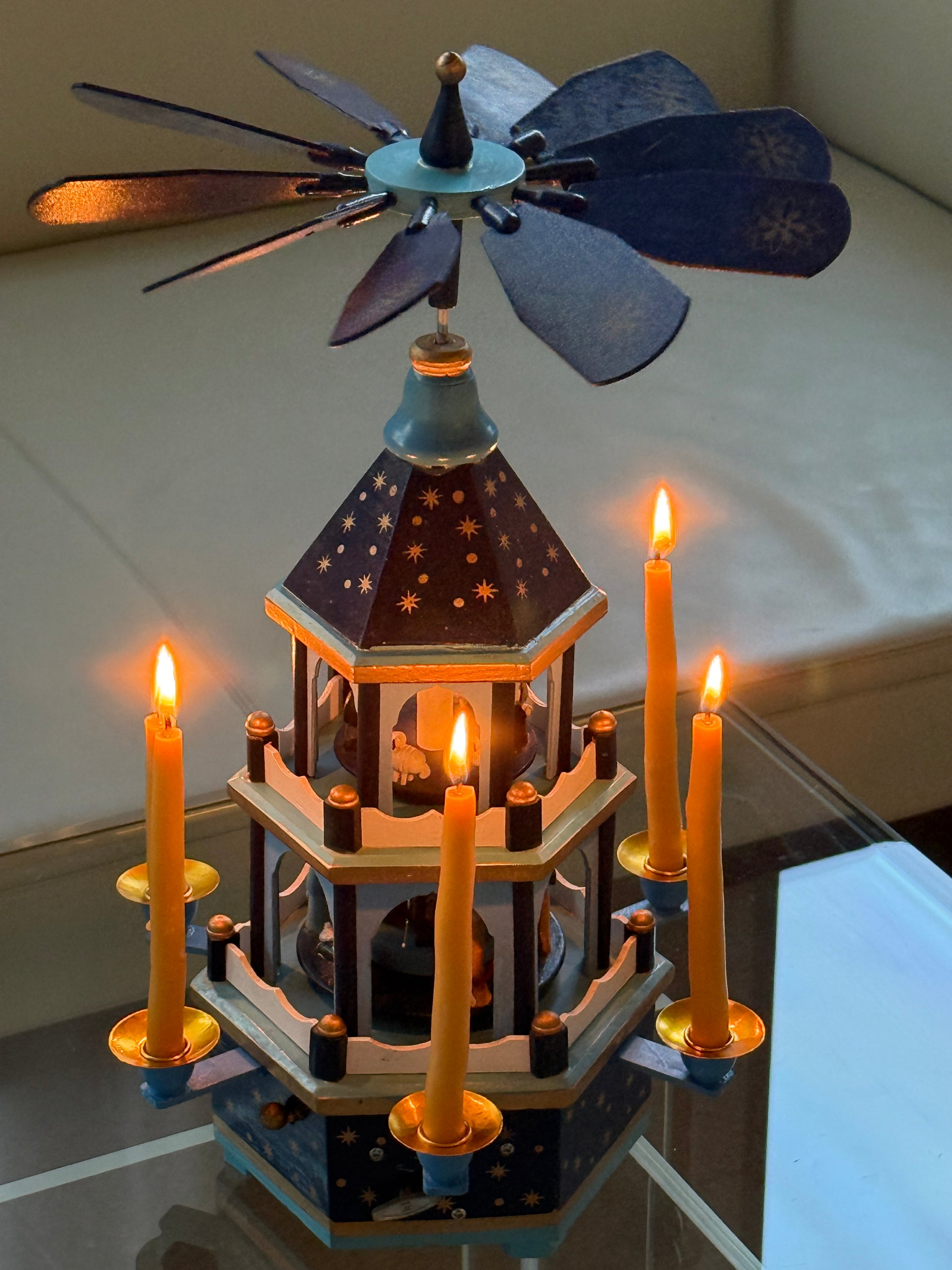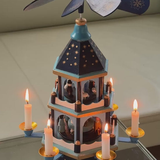Smuk, vintage julekarrusel i klassisk tysk julepyramide-stil, dekoreret i dybe blå nuancer med guldstjerner og fine håndmalede detaljer. Pyramiden har flere etager med små figurer – blandt andet julekrybbescenen – som roterer, når lysene er tændt og sender varm luft op mod propellen.