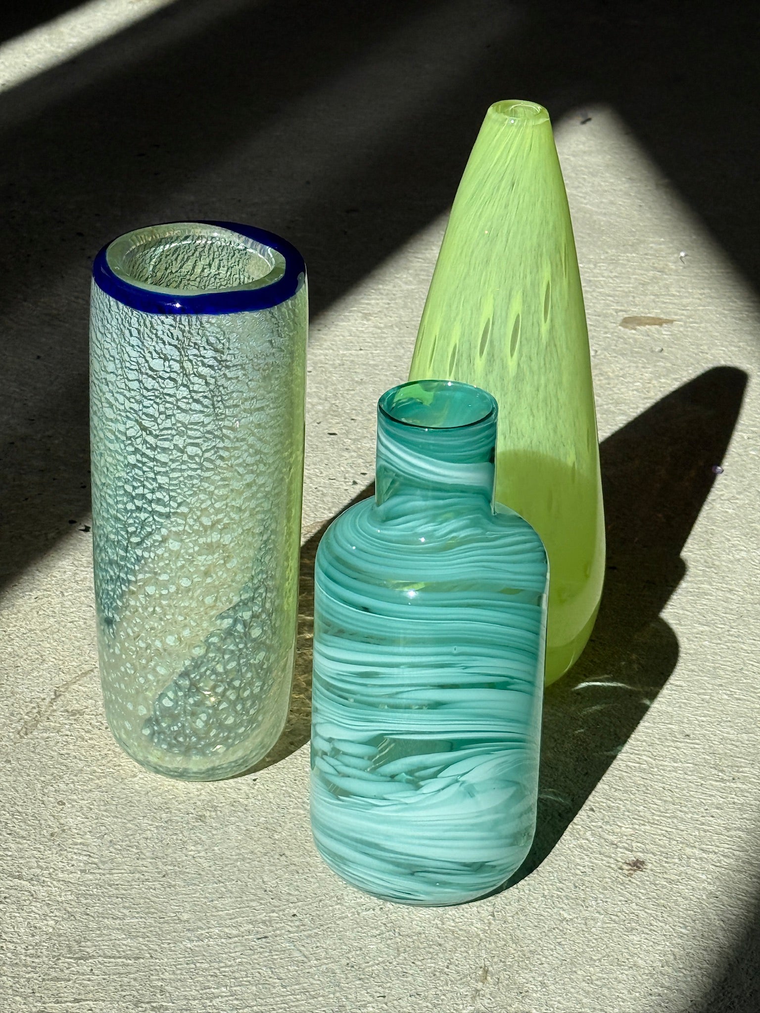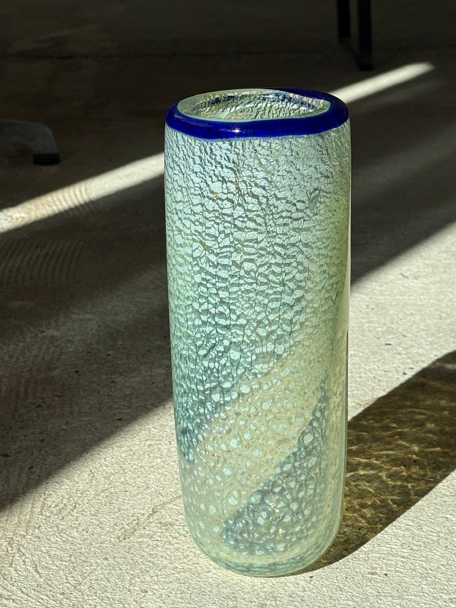 Smuk mundblæst vase i grønguligt og klart glas, afsluttet med en markant blå kant foroven. Glasset har en levende struktur med et spil mellem det grønne og det transparente, som giver vasen et unikt og elegant udtryk. Den passer perfekt både til blomster og som dekorativt indslag i hjemmet.