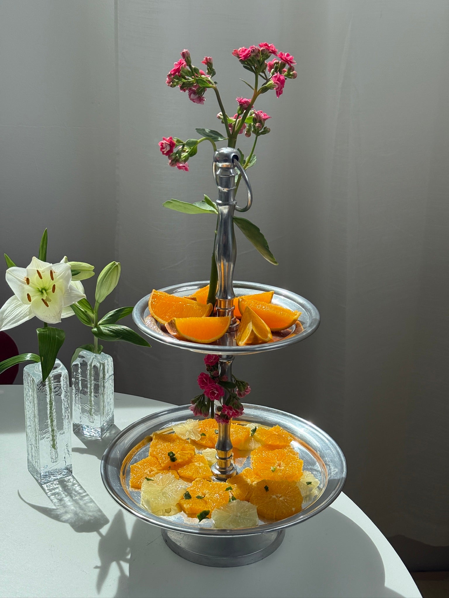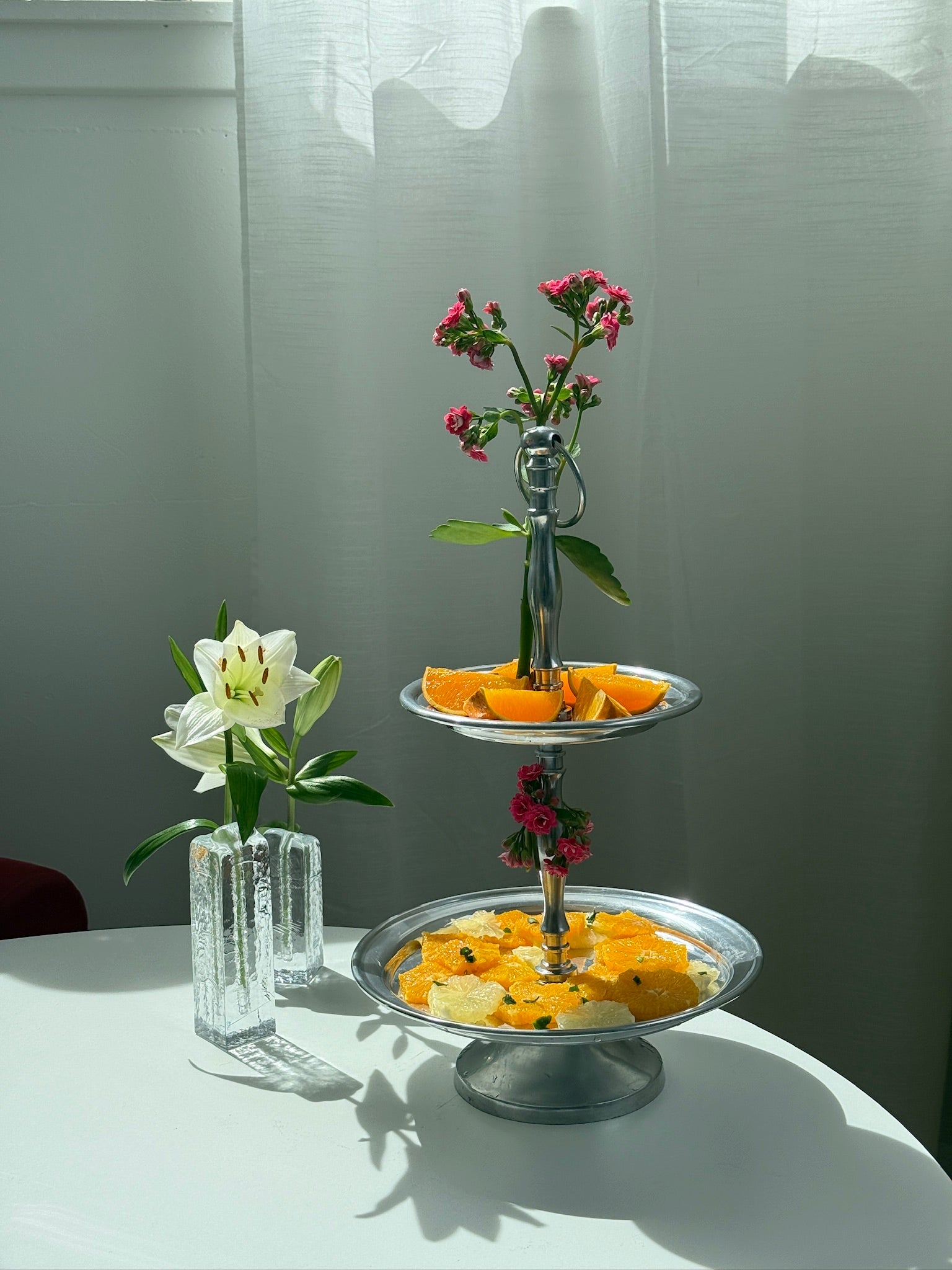 Elegant og rummelig etagere / opsats i sølvfarvet metal med to runde bakker og en klassisk drejet midterstang med bærerem i toppen. Den høje to-etagers opbygning giver masser af plads til servering af frugt, kager, snacks eller som centerpiece med blomster og lys.