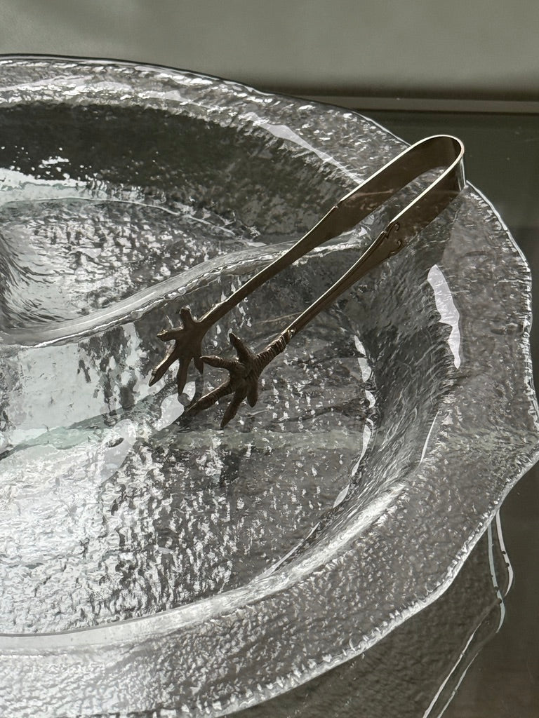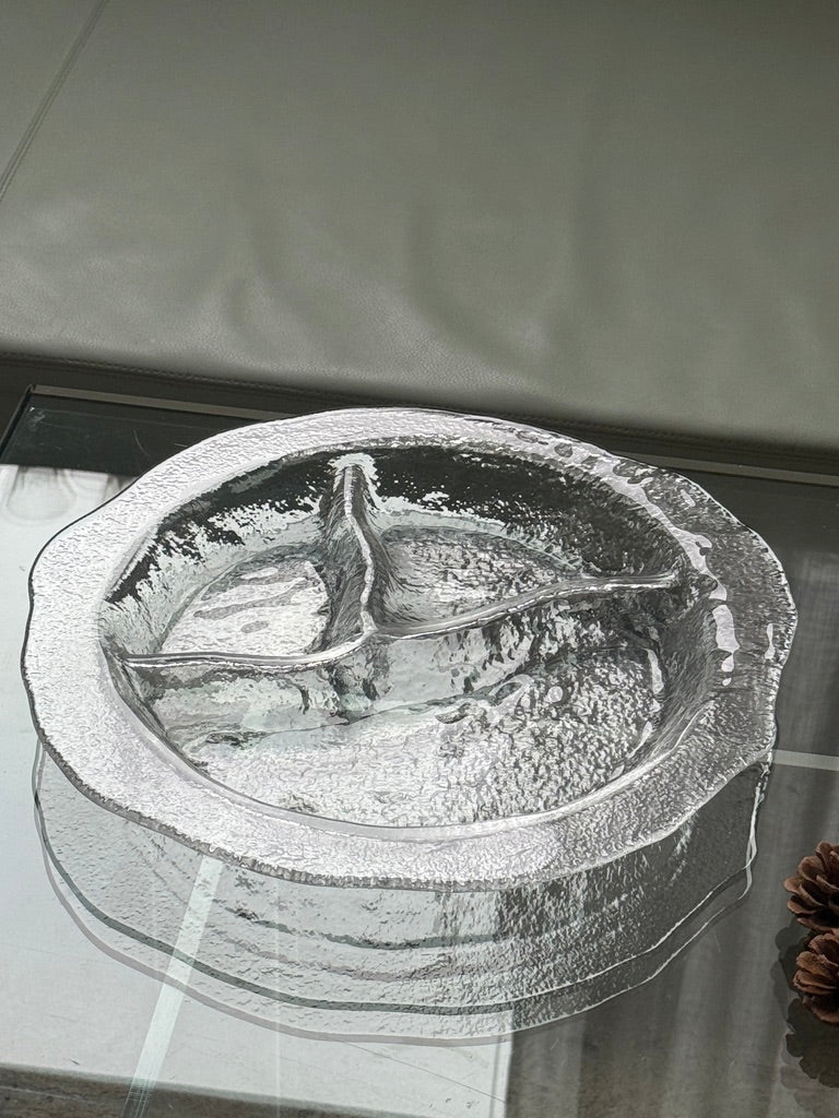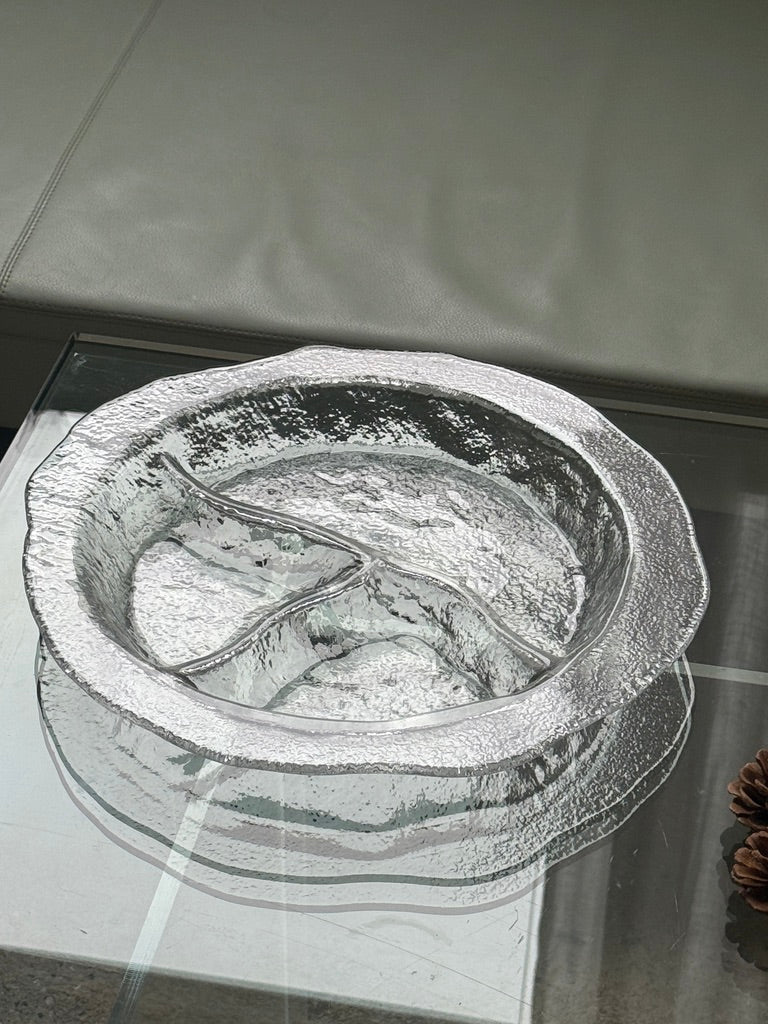 Markant og dekorativt glasfad i klart, struktureret glas med kraftig kant og opdelt midte. Fadet har et råt og organisk udtryk, hvor den ujævne overflade giver et smukt spil i glasset, når lyset rammer. Den indvendige opdeling gør fadet både funktionelt og dekorativt.
