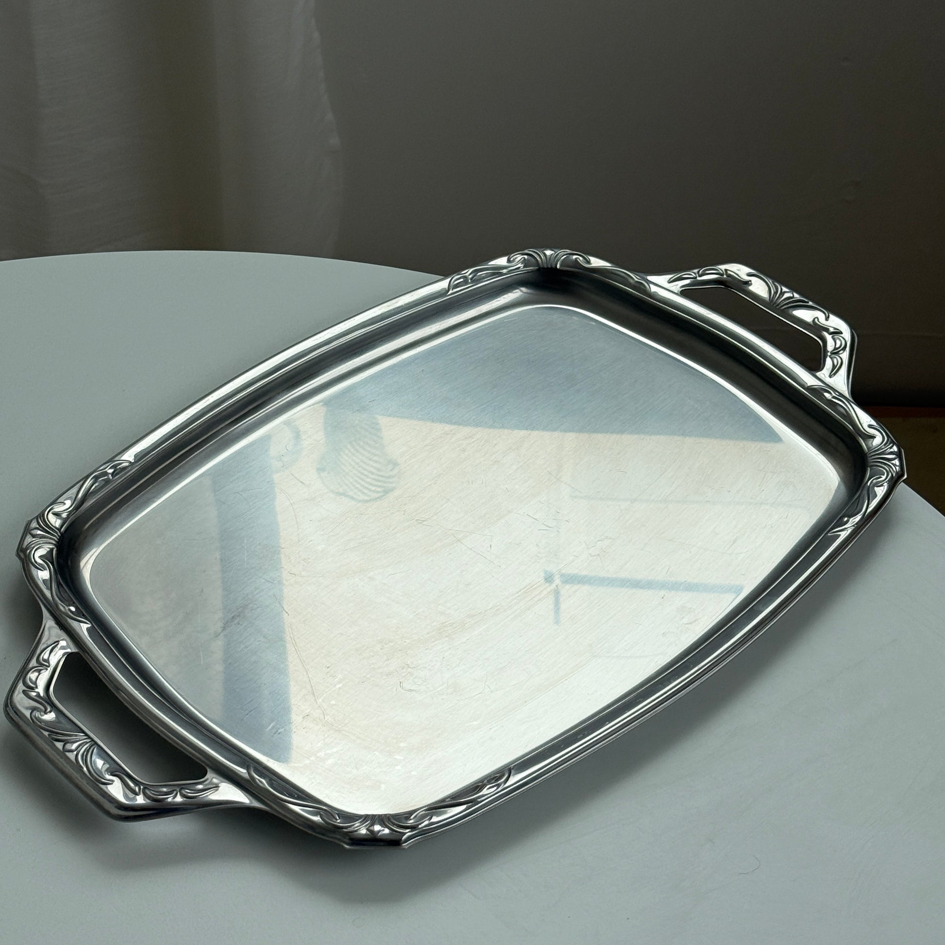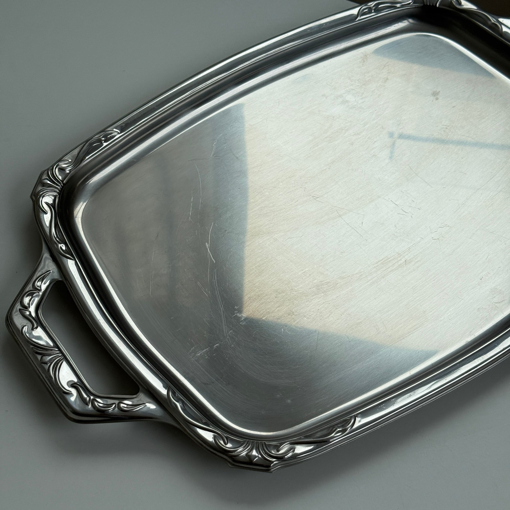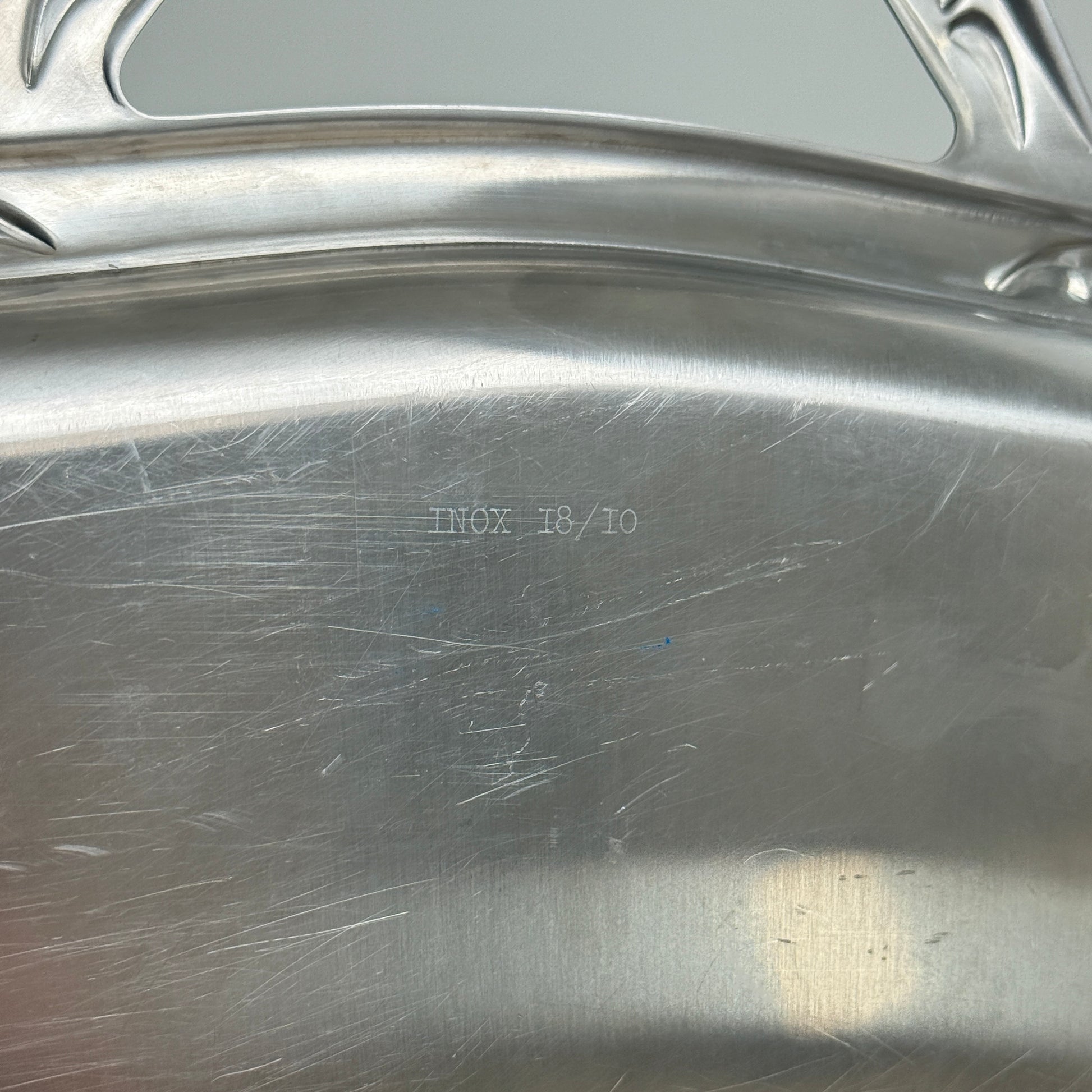 Elegant og solidt vintage serveringsfad i rustfrit stål (INOX 18/10). Fadet har smukke håndtag med dekorative detaljer, der giver et klassisk og tidløst udtryk. Perfekt til servering eller som base i en smuk opstilling.
