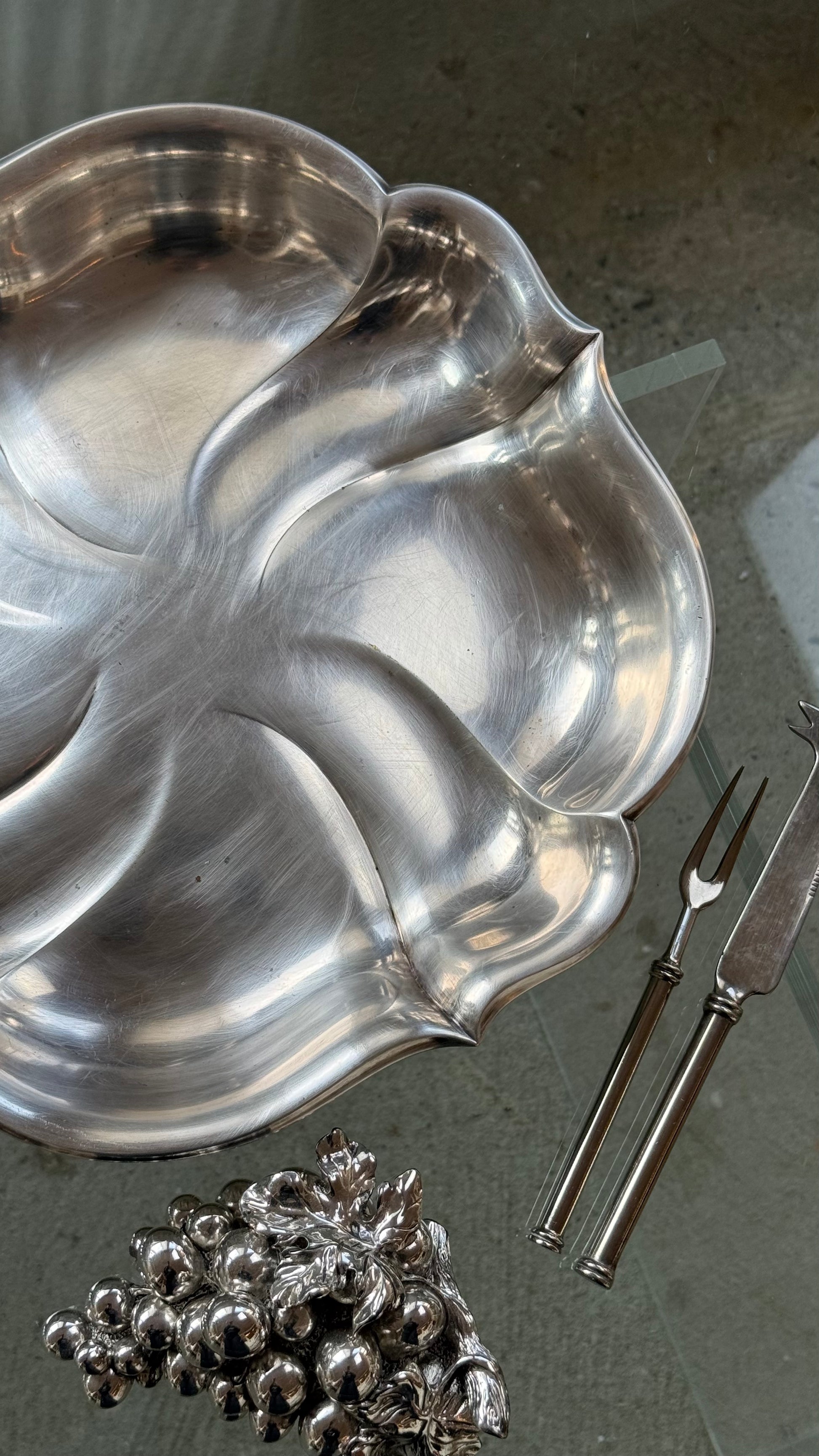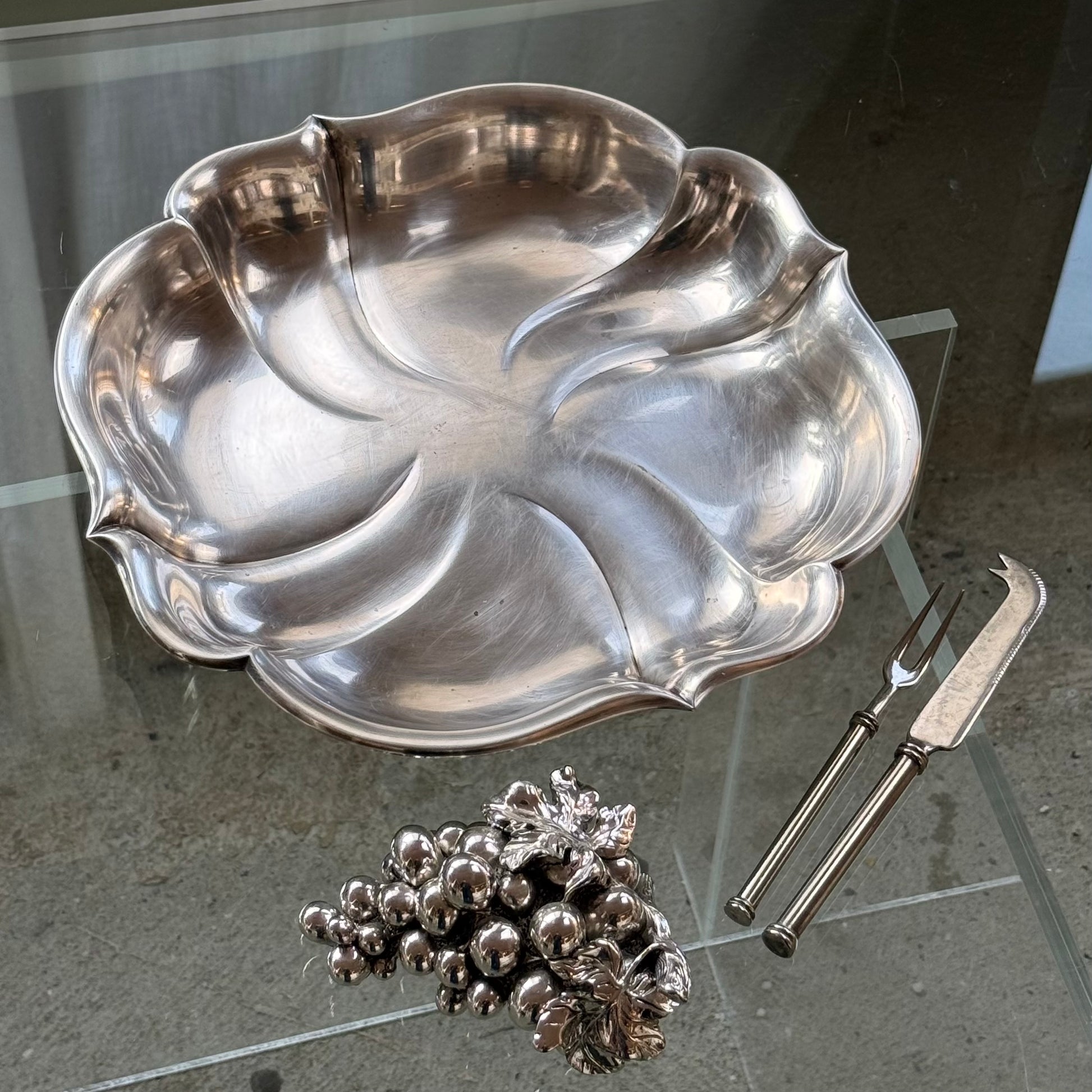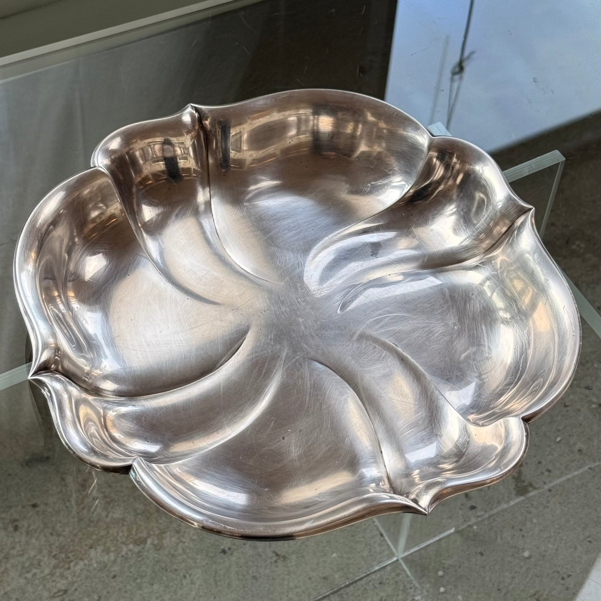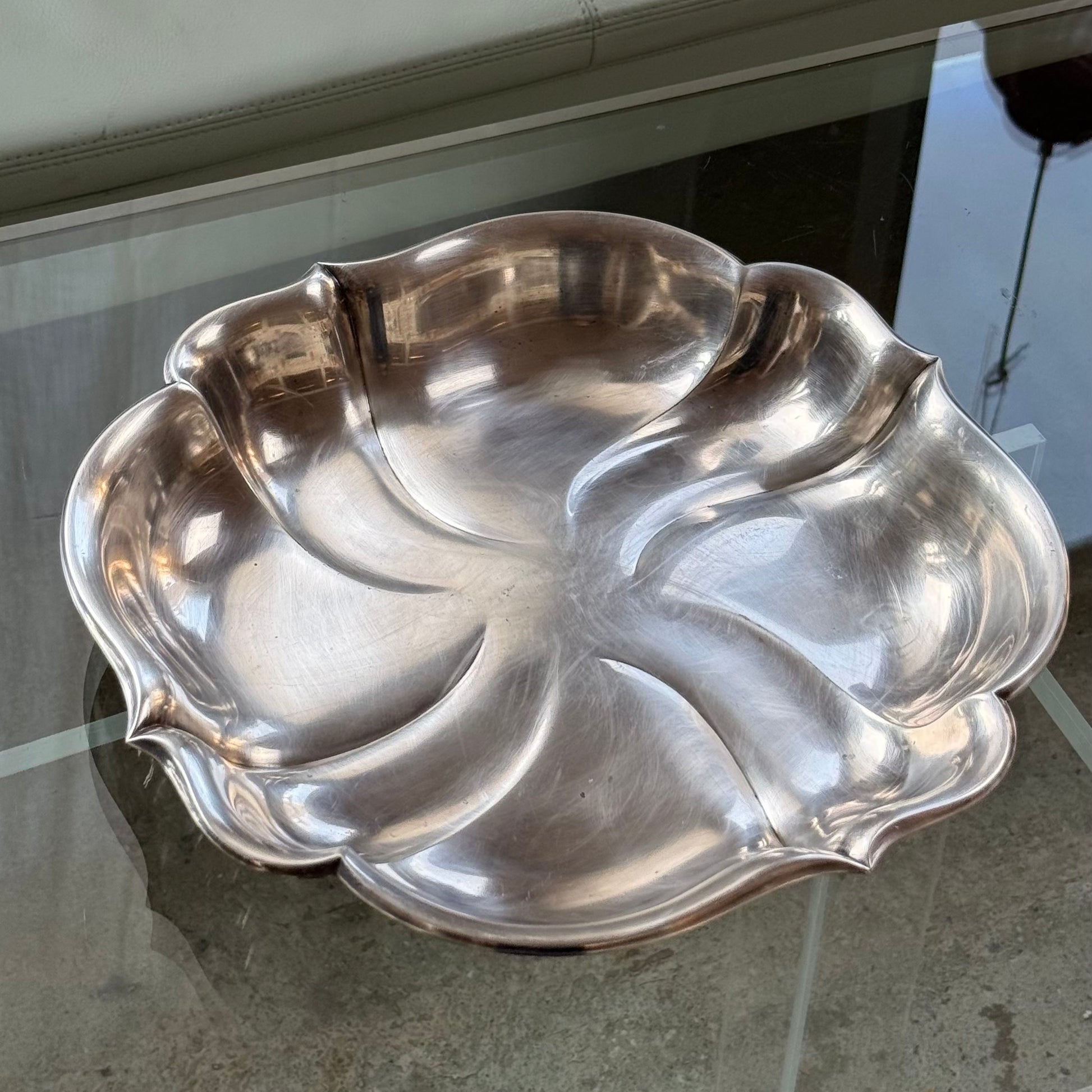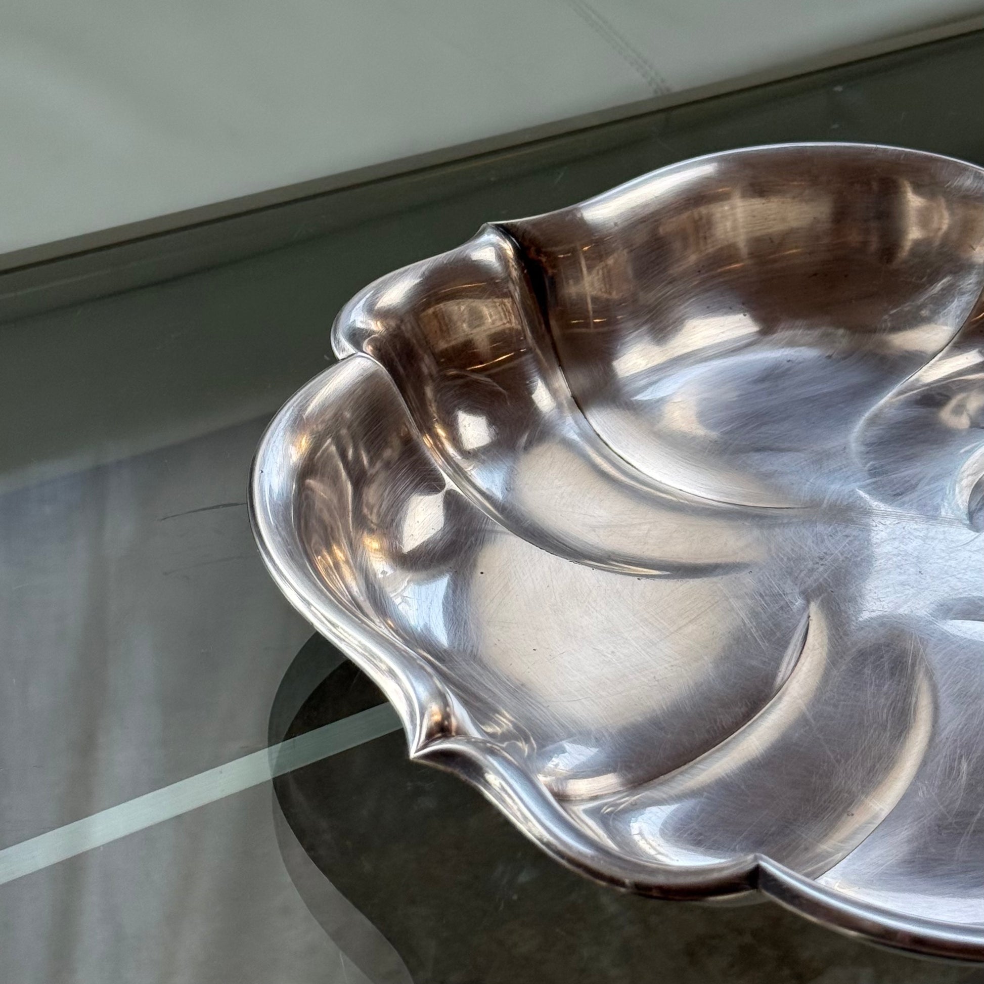 Smukt og karakterfuldt serveringsfad i rustfrit stål fra 1953 med elegant, bølgende form. Fadet har et organisk og næsten skulpturelt udtryk, hvor de bløde linjer samler sig i midten og giver en flot dynamik i overfladen. Den blanke stålfinish reflekterer lyset smukt og gør fadet til et iøjnefaldende element på bordet.