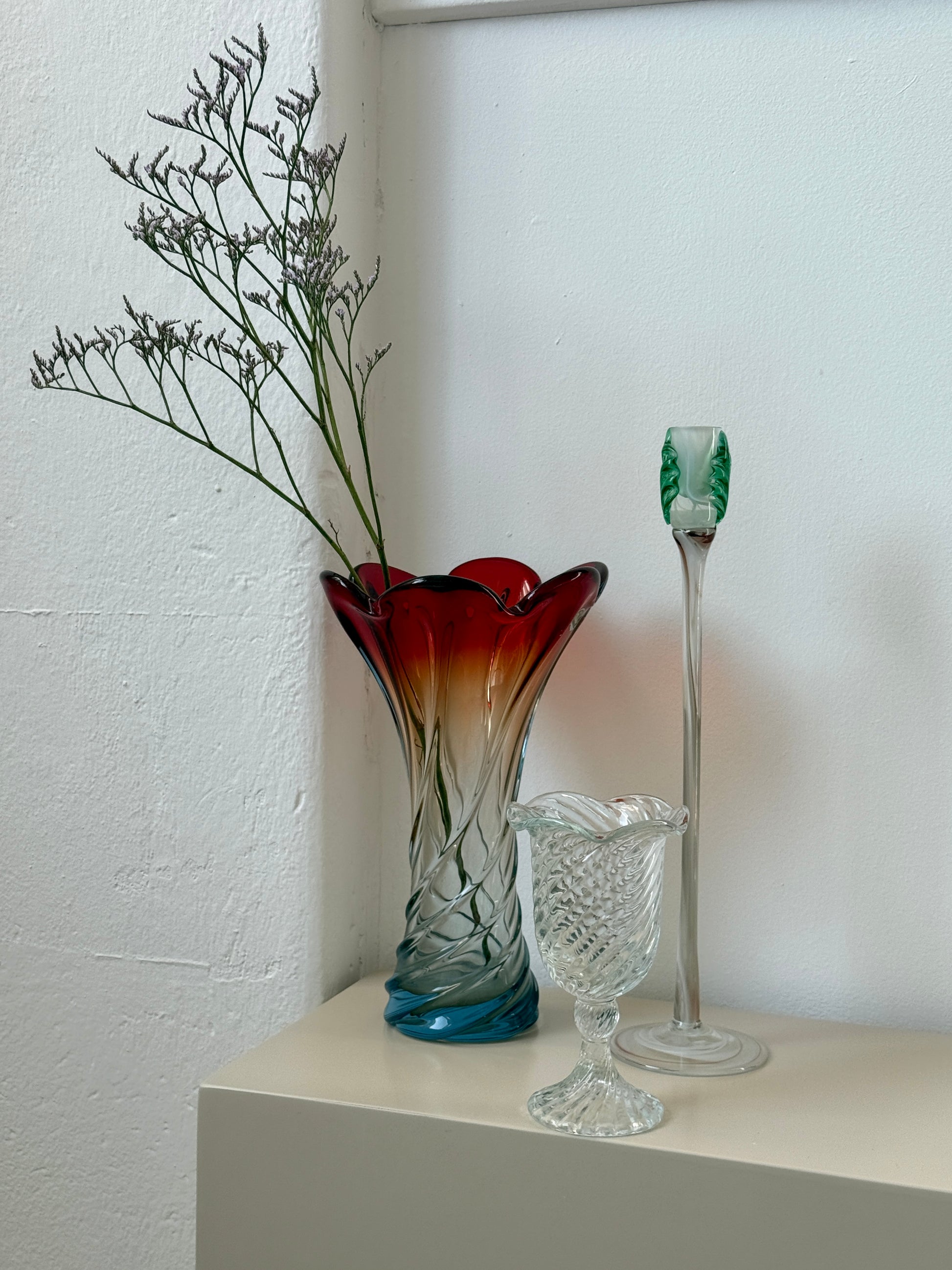 Lille swirl vase med bølgede kant. Er lavet i glas og kan bruges til lys, blomster eller som et dekorativt element, evt. med en sløjfe omkring.