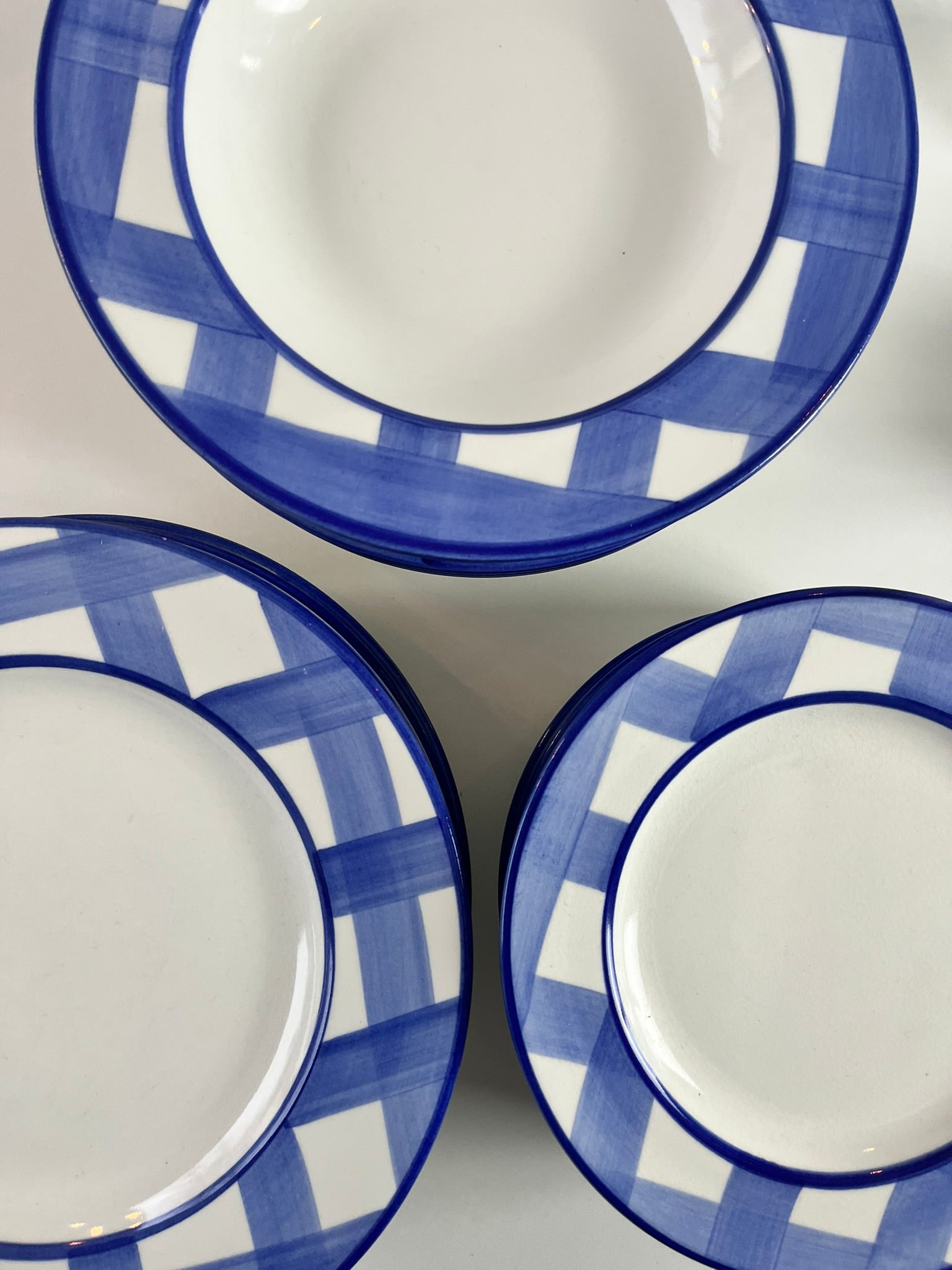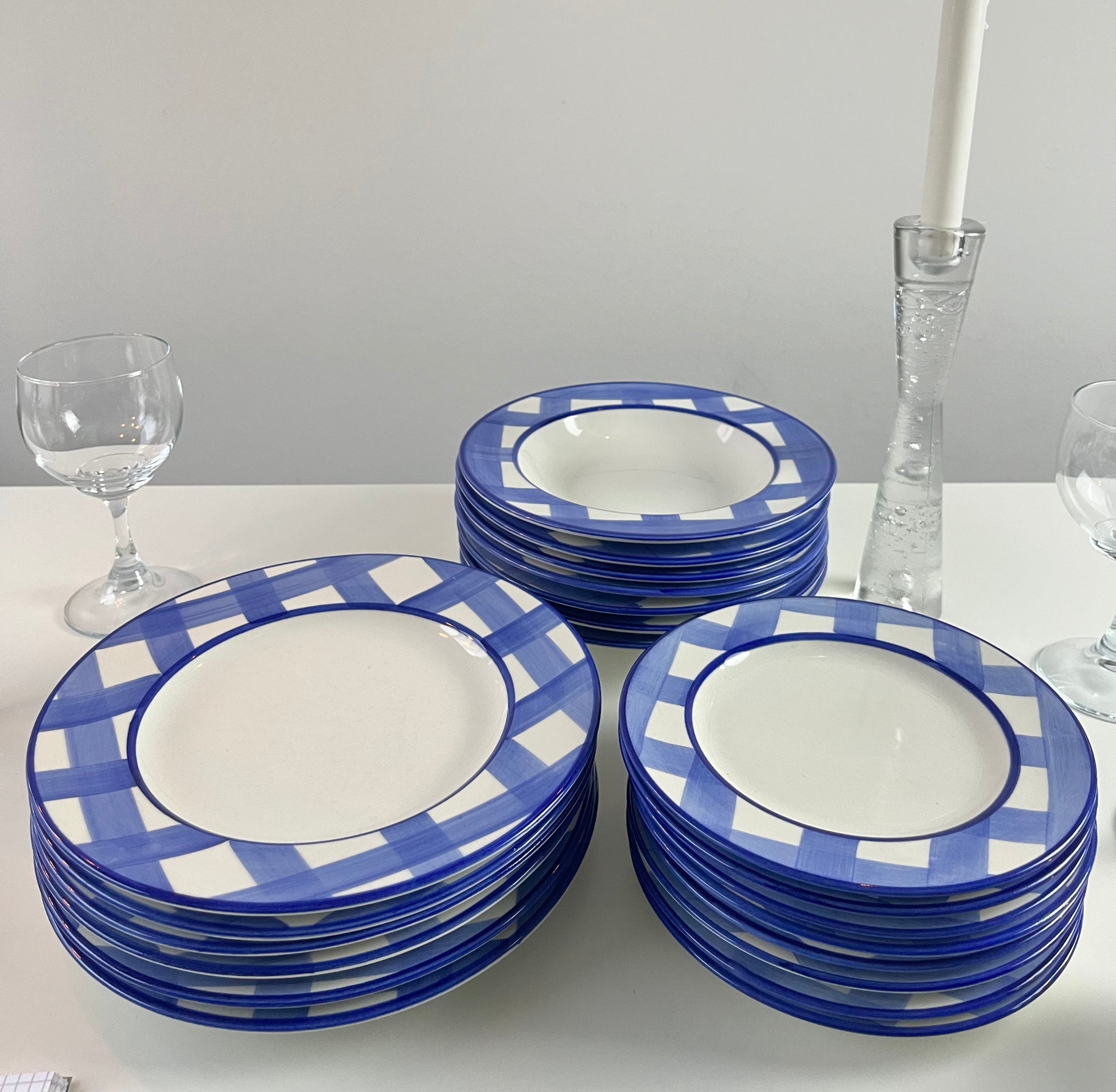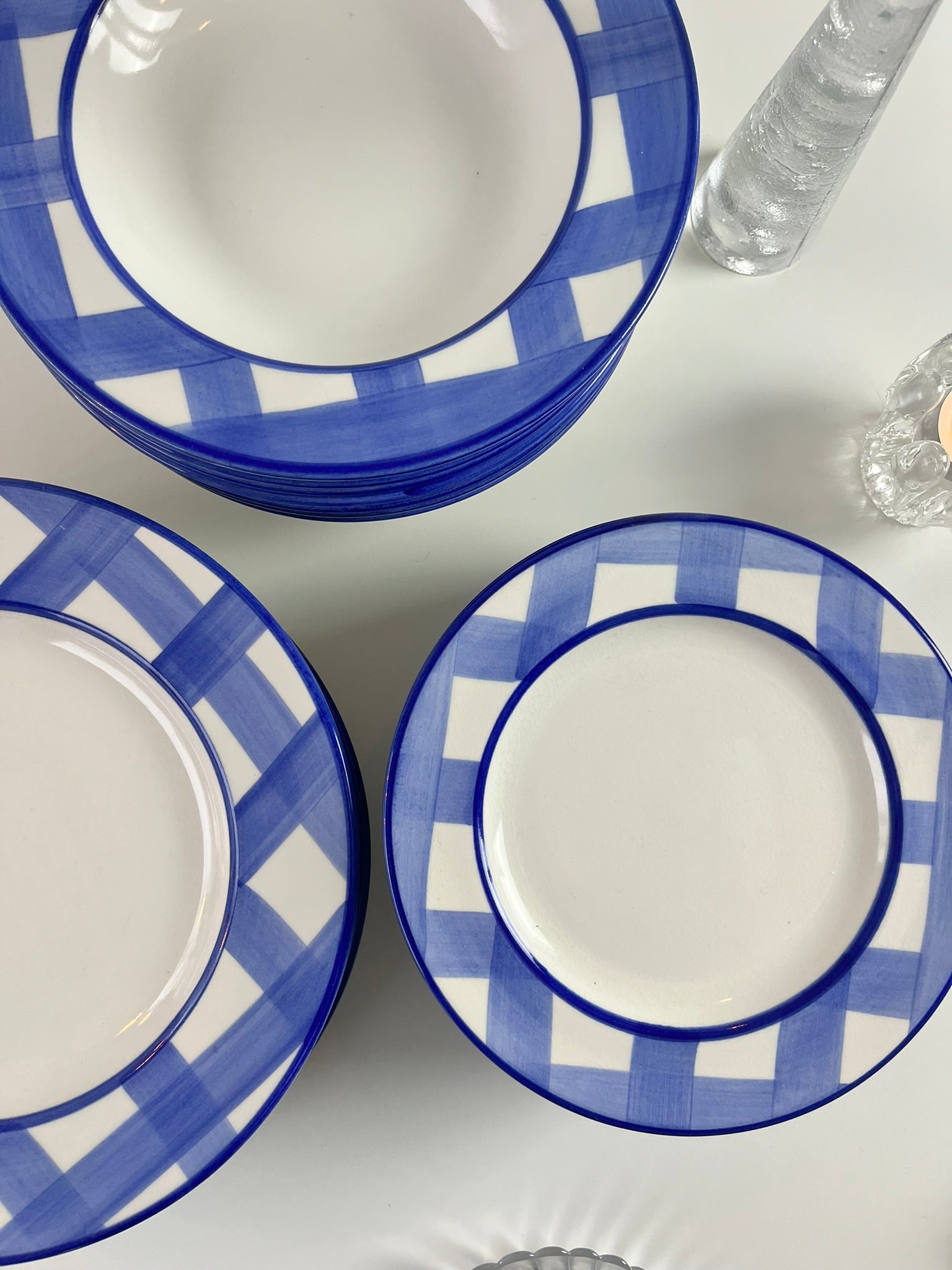 Smukt, retro servicesæt med en blåternet kant. Sættet består af både middagstallerkner, frokosttallerkner og dybe tallerkner, som tilsammen skaber en flot og gennemført borddækning.